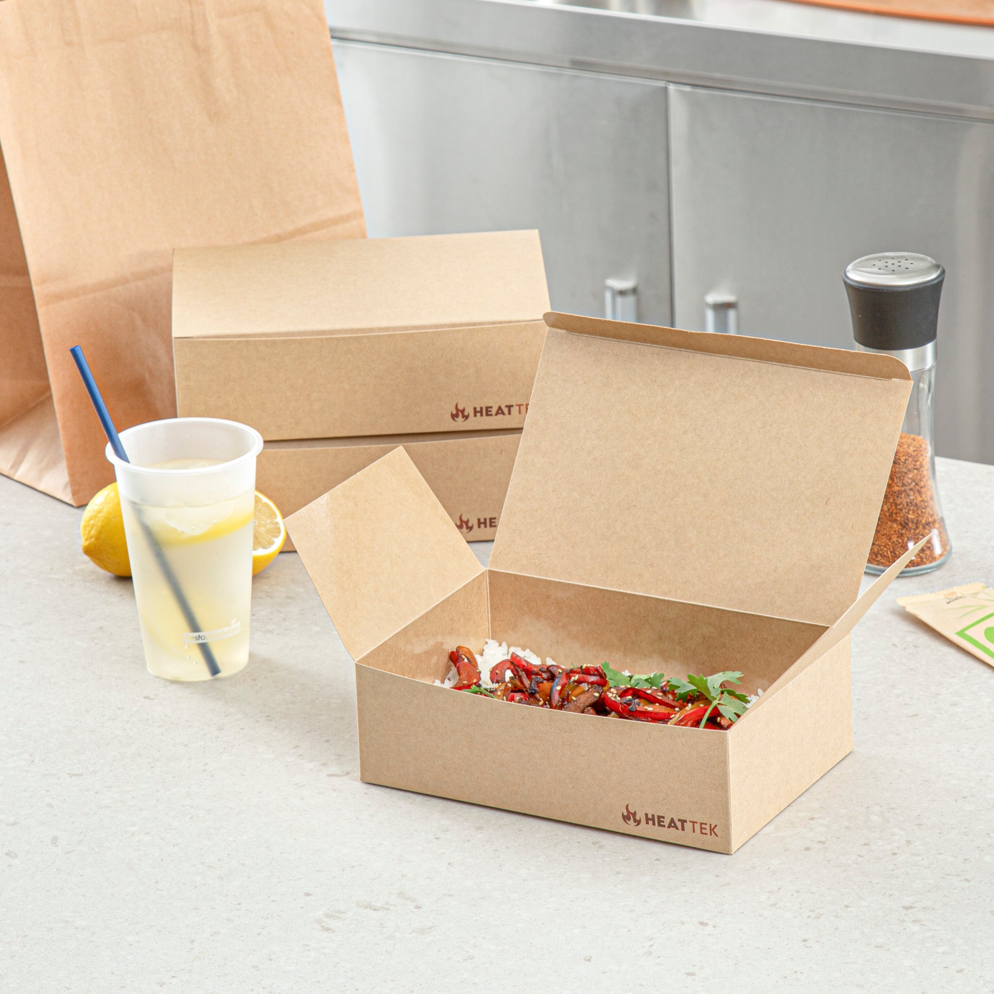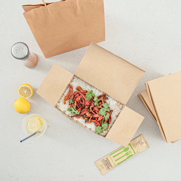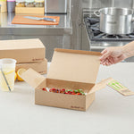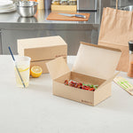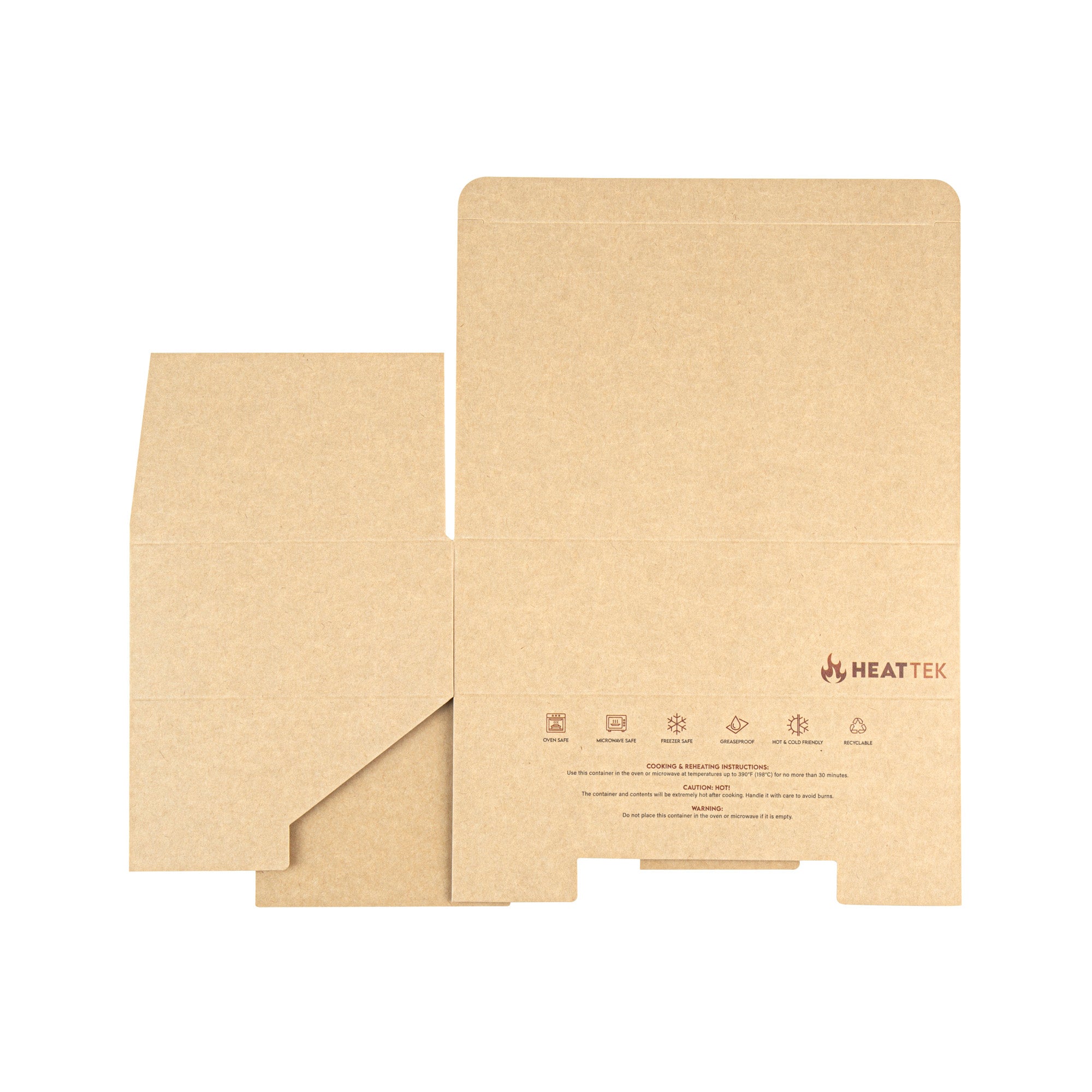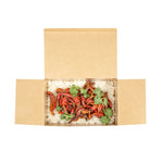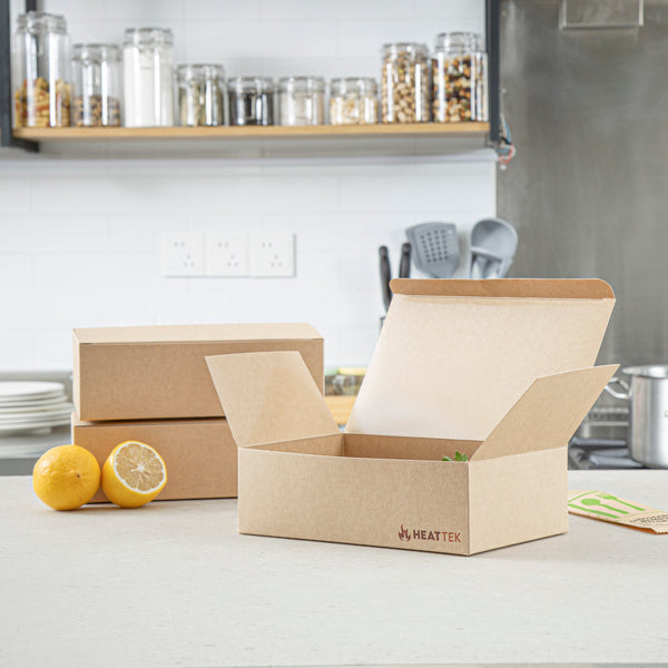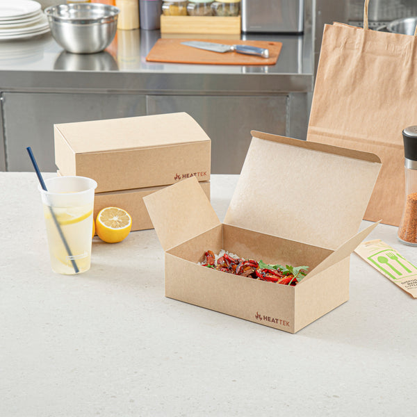 Serve hot meals straight from the oven with our Heat Tek Kraft Paper Take Out Containers. The tuck-top lid of these paper containers locks in heat and freshness, while offering easy closure. Designed with a sturdy paper, these oven-friendly food containers withstand temperatures up to 260°F for seamless heating and serving. The grease-resistant lining of these to-go boxes keeps oils and sauces contained, ensuring a mess-free presentation. These disposable take out boxes make post-meal cleanup quick and hassle-free for staff and guests. Great for pastas, entrees, or sides, these kraft take out boxes display hot and cold food versatility. Freezable for cold storage, these food containers keep meals fresh until ready to serve. Designed for sustainability, these eco-conscious boxes are fully recyclable after use. Measuring 9 inches in length by 5.75 inches in width by 2.75 inches in height, these kraft containers provide ample space for hearty portions. Sold in a 100 count box.