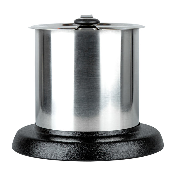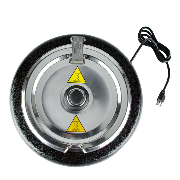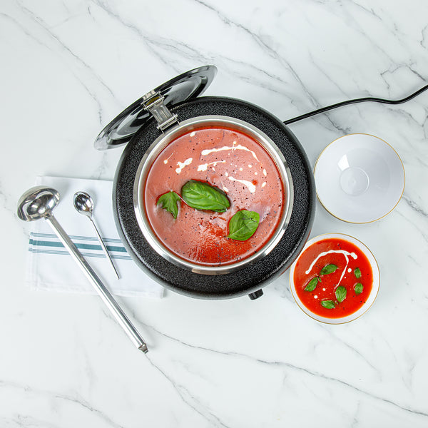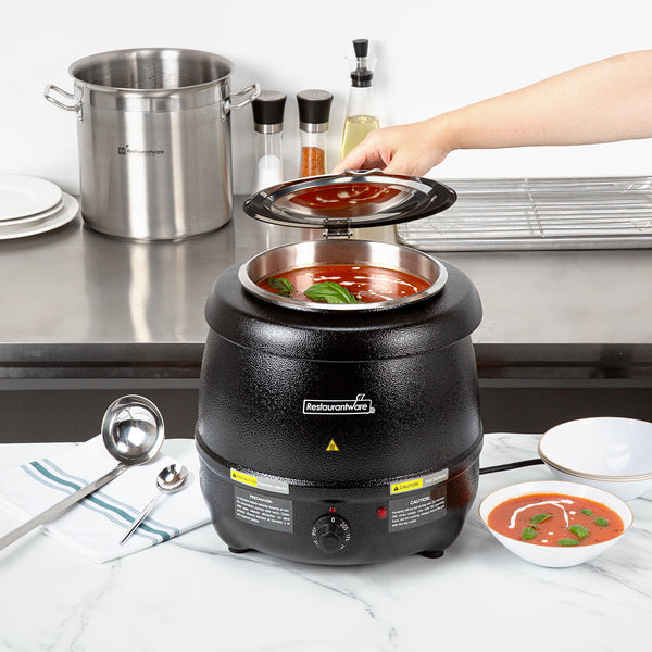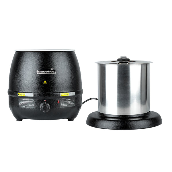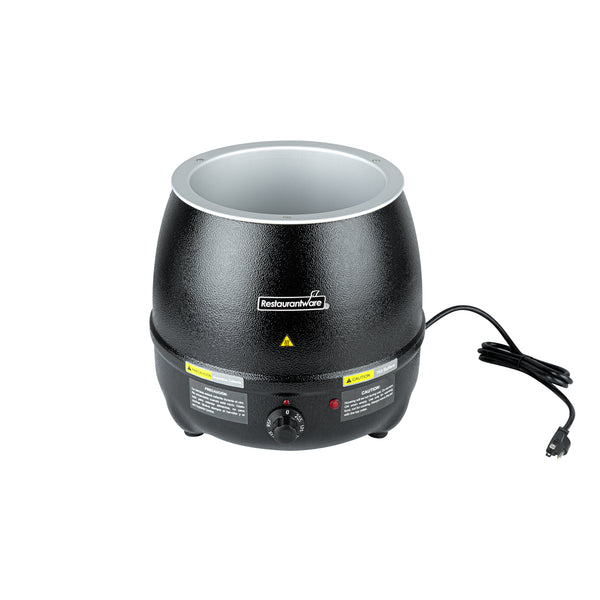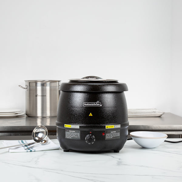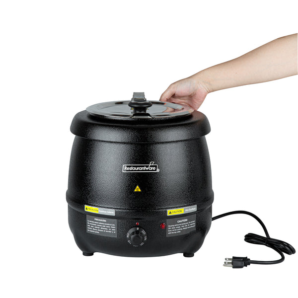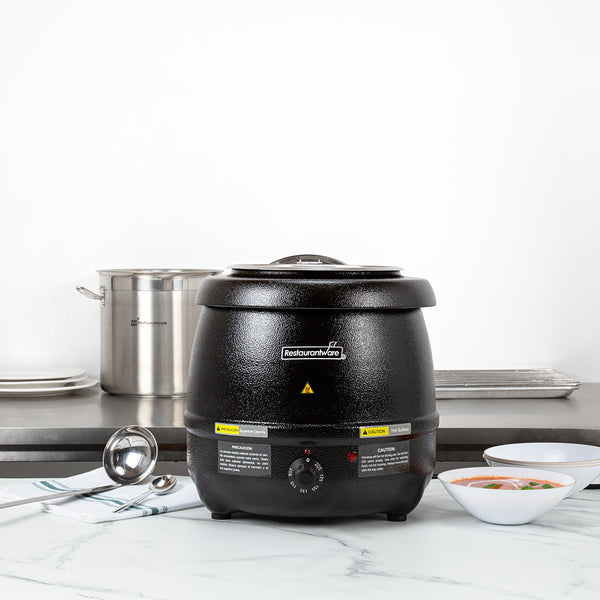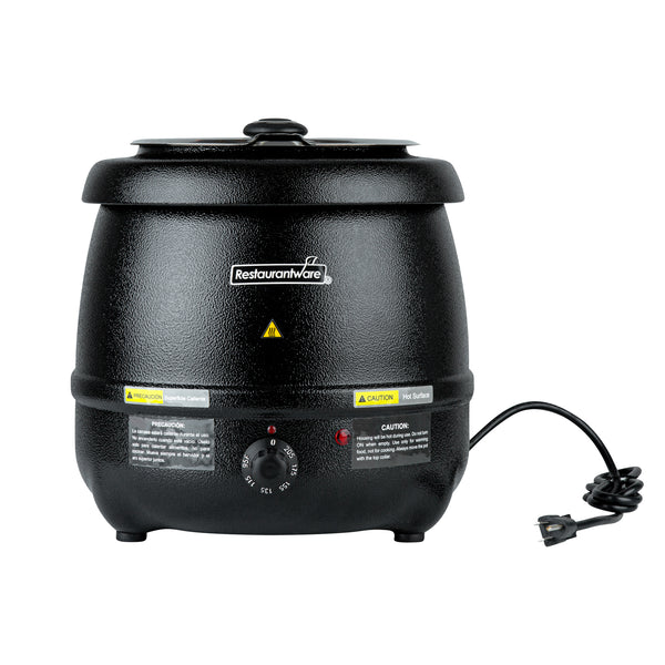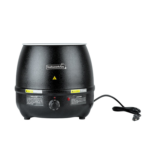Discover the perfect fusion of practicality and elegance with our Hi Tek 10-quart Black Soup Kettle Warmer. With a manual control knob, this electric food warmer allows you to effortlessly adjust temperatures from 86F to 194F to suit your specific warming needs. This portable food warmer comes with 1 removable stainless steel insert that holds food. To ensure the smooth application of the food insert onto the outer warming body, this black food warmer comes with a metal lifting ring. Equipped with a hinged lid, this countertop food warmer traps heat and provides convenient access to its contents. With a built-in knob on the lid, this soup warmer ensures easy maneuverability when opening and closing the lid to access the food inside. The built-in notch in this soup kettle’s lid offers handy ladle storage, optimizing space and efficiency. Featuring an indicator light positioned above the dial, this commercial food warmer ensures you can quickly tell if the warmer is turned on, making it ideal for busy foodservice establishments. This buffet warmer comes with pre-designed labels for popular soups and stews to aid in easy identification and organization. The shell of this buffet food warmer is crafted from powder-coated steel for a cast, frontier kettle appearance. With a black finish, this electric soup kettle adds a sleek and modern touch to any setting, elevating the visual appeal and creating a sophisticated ambiance. Operating at 120V and 800W, this soup pot ensures quick and consistent heating, suitable for preparing soups and stews. The NEMA 5-15P plug of this tomato soup warmer fits standard US outlets. Measuring 13.5 inches in diameter by 13.5 inches in height, this black soup warmer can hold up to 10 quarts. Sold in a 1 count box.