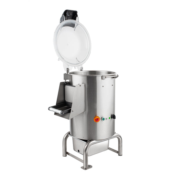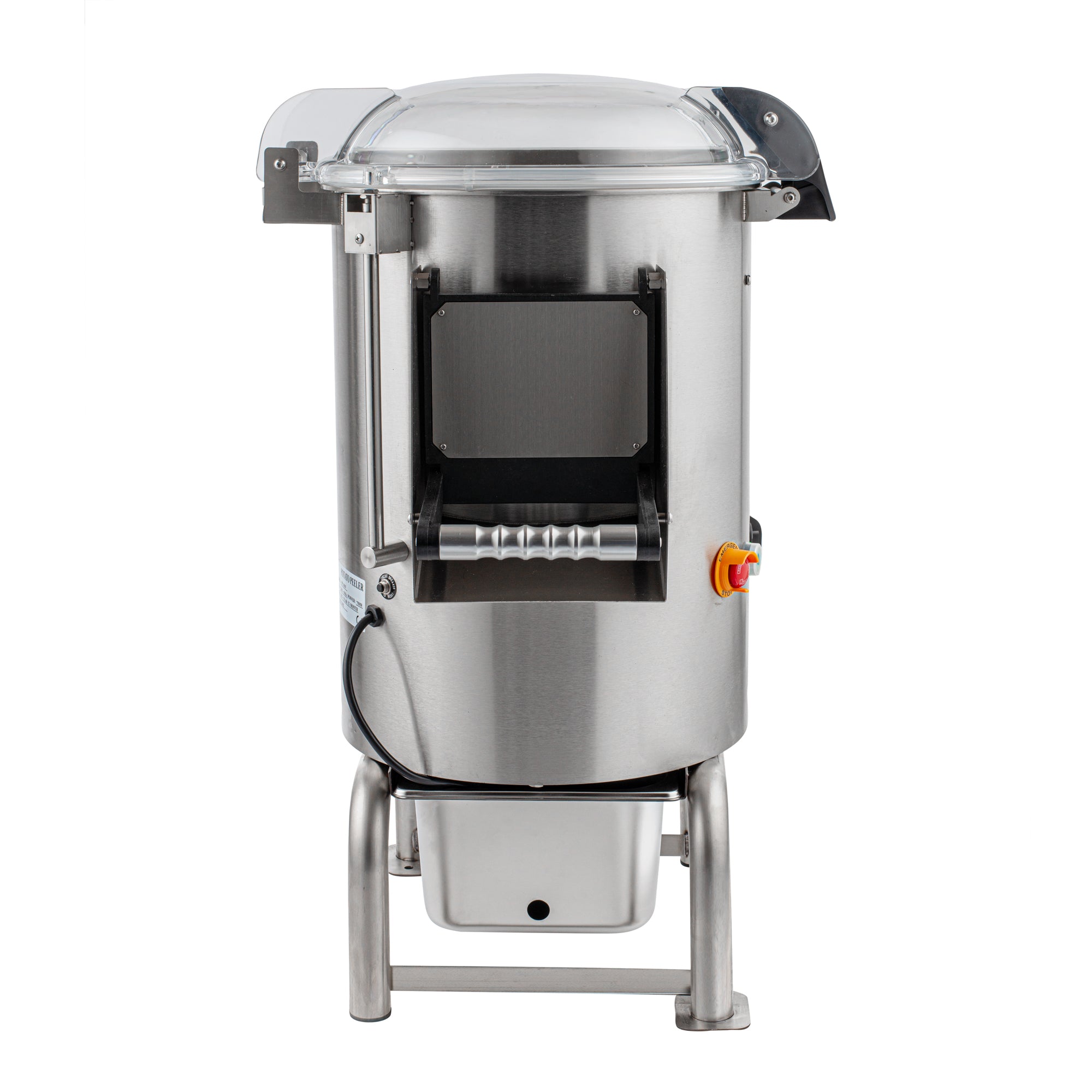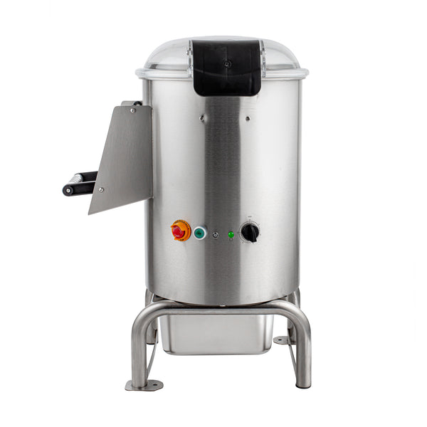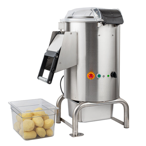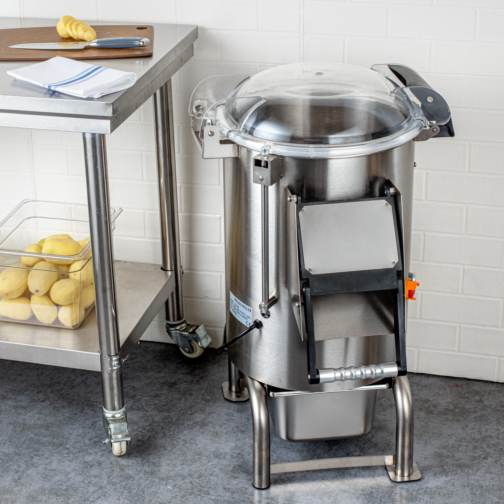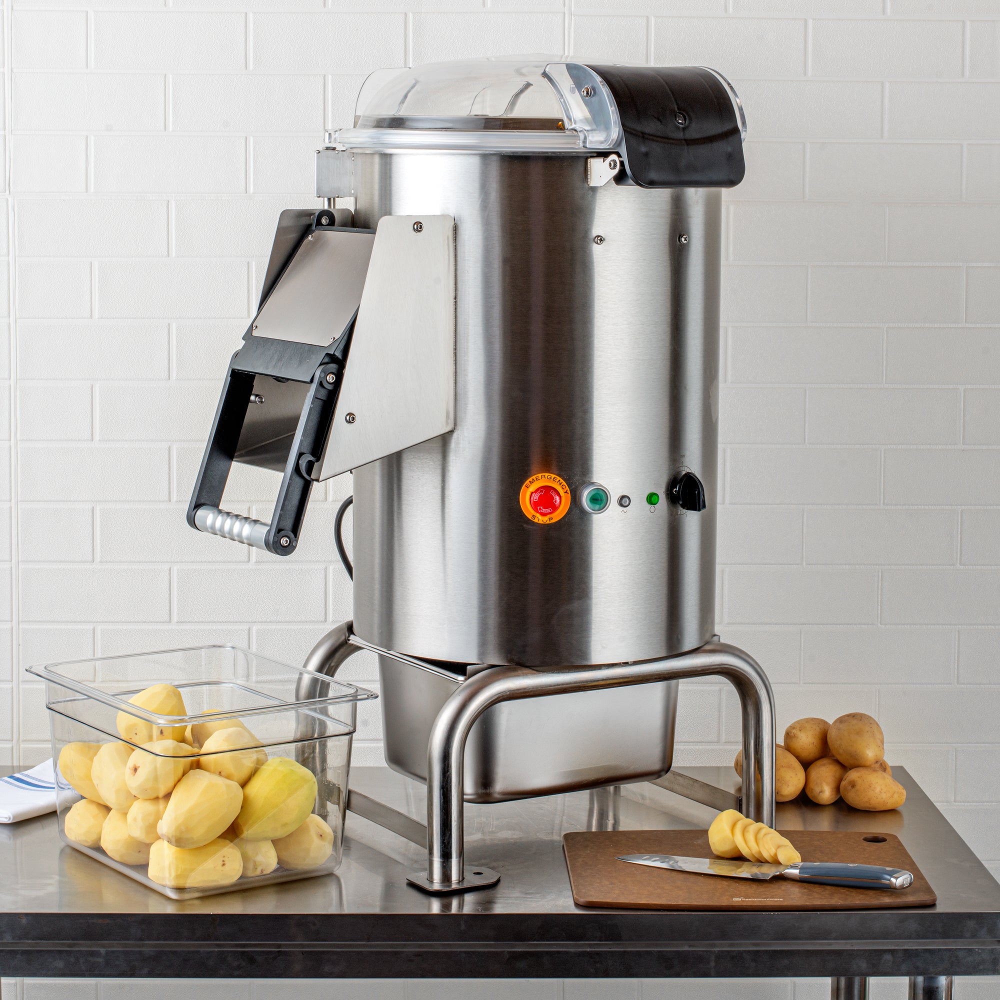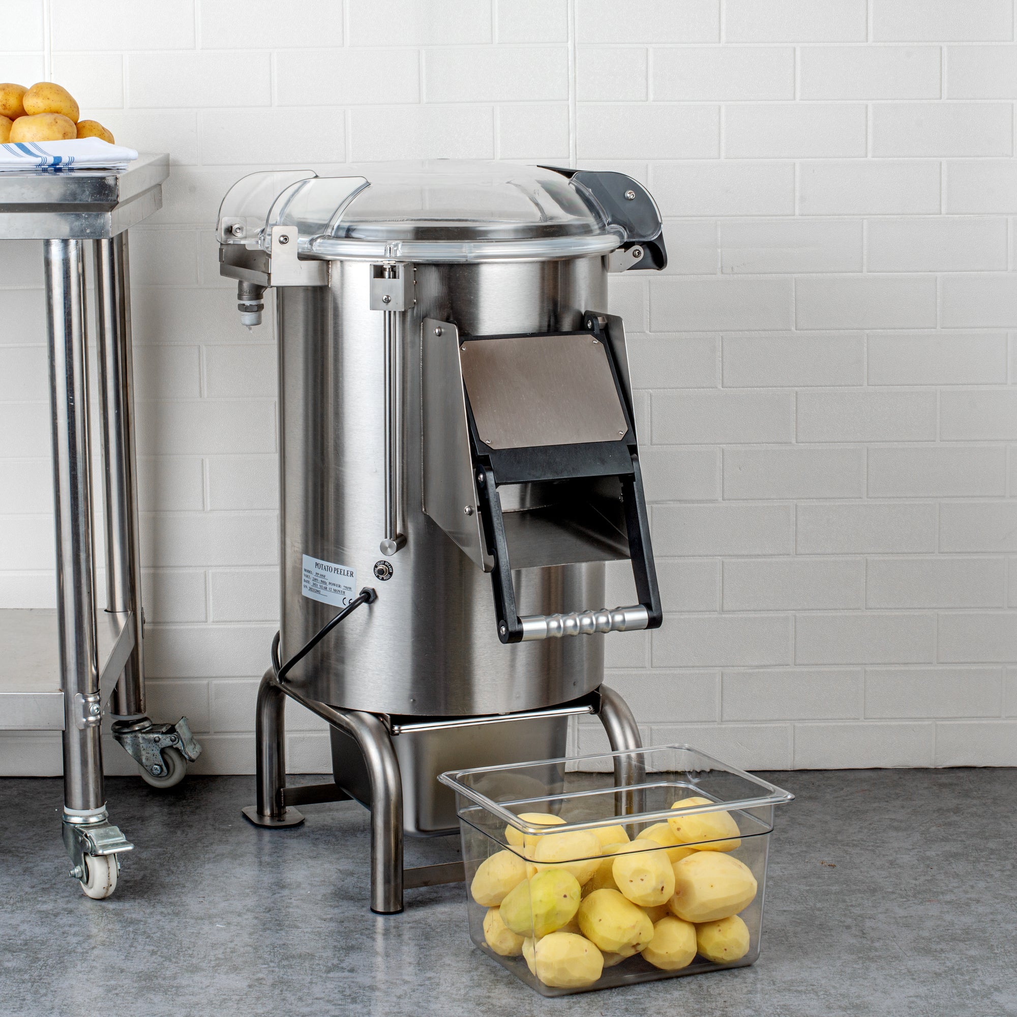 Ideal for use in commercial kitchens, this potato peeler's high capacity, powerful motor, and durable makeup make it an indispensable tool for chefs and kitchen staff. It effortlessly streamlines the potato peeling process.