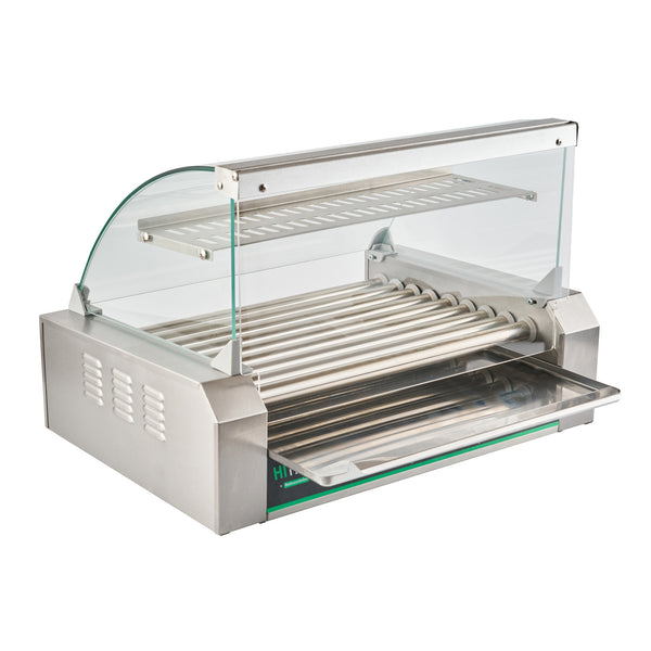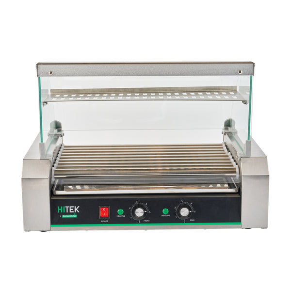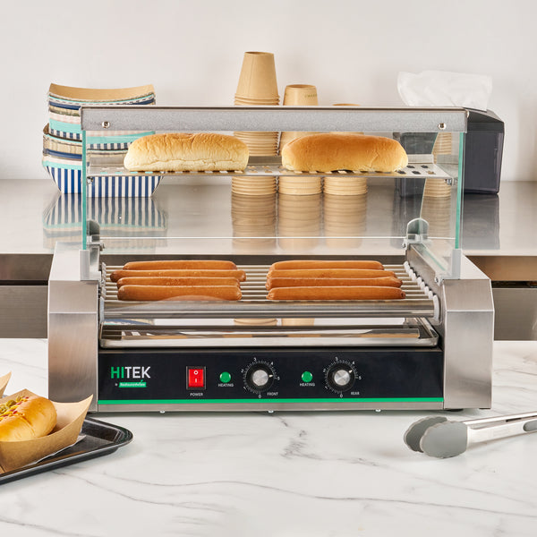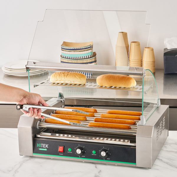 Elevate your foodservice operations with our Hi Tek Hot Dog Roller Grill Warmer, designed to meet the demands of busy commercial settings. This efficient hot dog roller grill fits 24 hot dogs and 4 buns, ensuring you can serve multiple customers quickly. Equipped with 9 stainless steel rollers that rotate at 3.8 r/min, this hot dog roller machine ensures even cooking every time. Operating at 1200W power and 110V 60Hz, this unit delivers reliable performance with a motor power of 14W and 5RBM/min. The temperature range of 122F-482F allows for precise cooking, making it ideal for a variety of hot dog recipes. Built with a toughened glass cover and an acrylic glass door, this hot dog roller machine ensures durability and safety. These hot dog roller grills come with a sneeze guard, providing added hygiene for your foodservice environment. Measuring 23 inches in length by 16.25 inches in width by 16 inches in height, this compact yet substantial hot dog grill fits seamlessly into any kitchen space.Sold in a 1 count box.