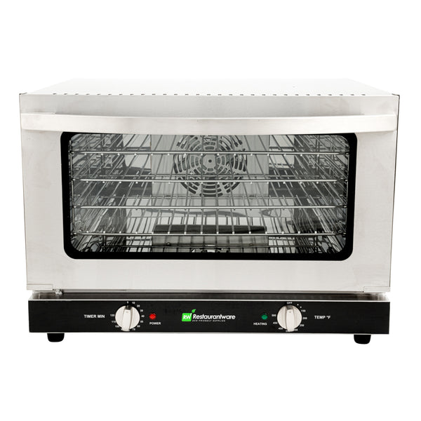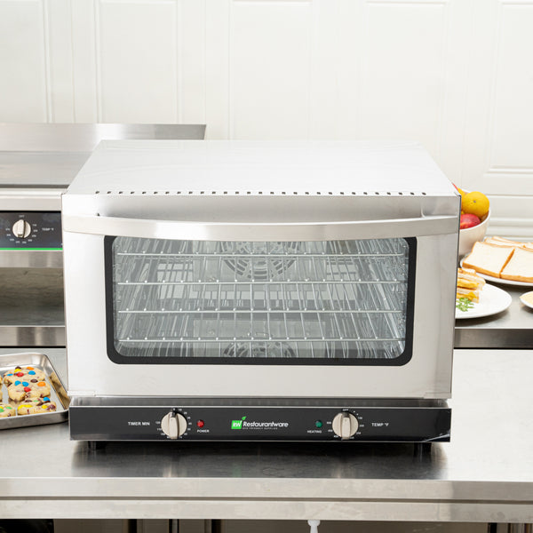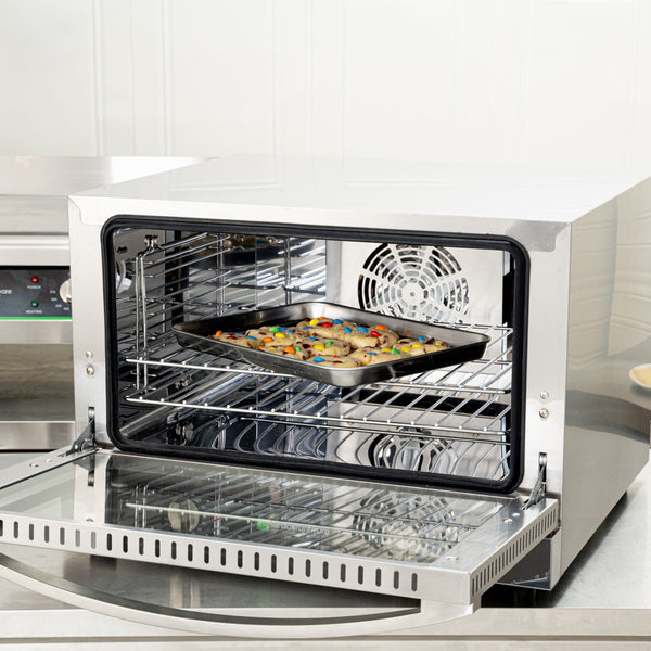 This commercial countertop convection oven features a simple knob to set a timer for your baking process. No need to worry about items overcooking!