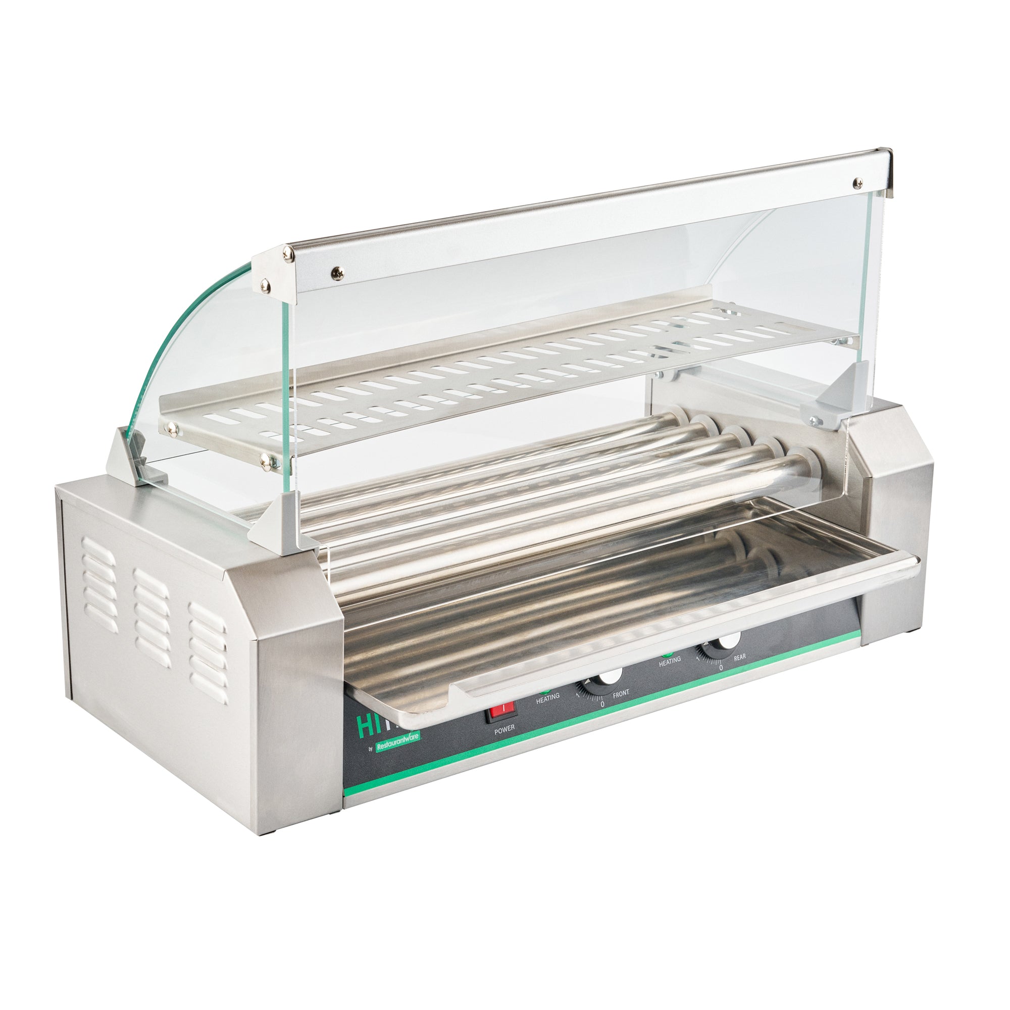 Effortlessly prepare and warm up to 12 hot dogs at a time with our Hi Tek Stainless Steel Hot Dog Roller Grill Warmer. This hot dog roller grill features 5 stainless steel rollers that ensure even cooking and consistent results. With a power rating of 700W and operating on 110V 60Hz, these hot dog roller grills boast a robust 14W motor with a rotation speed of 5RBM/min and roller speed of 3.8r/min for efficient operation. The grill operates within a temperature range of 122F-482F, providing precise control for perfect cooking. For added safety and durability, these hot dog grill machines include a toughened glass cover and an acrylic glass door. The added bun warmer shelf ensures that buns are kept warm and ready to serve, enhancing overall efficiency and customer satisfaction. Measuring 23 inches in length by 10.75 inches in width by 15 inches in height, this compact hot dog roller machine fits seamlessly into any commercial kitchen or foodservice setup. Sold in a 1 count box.