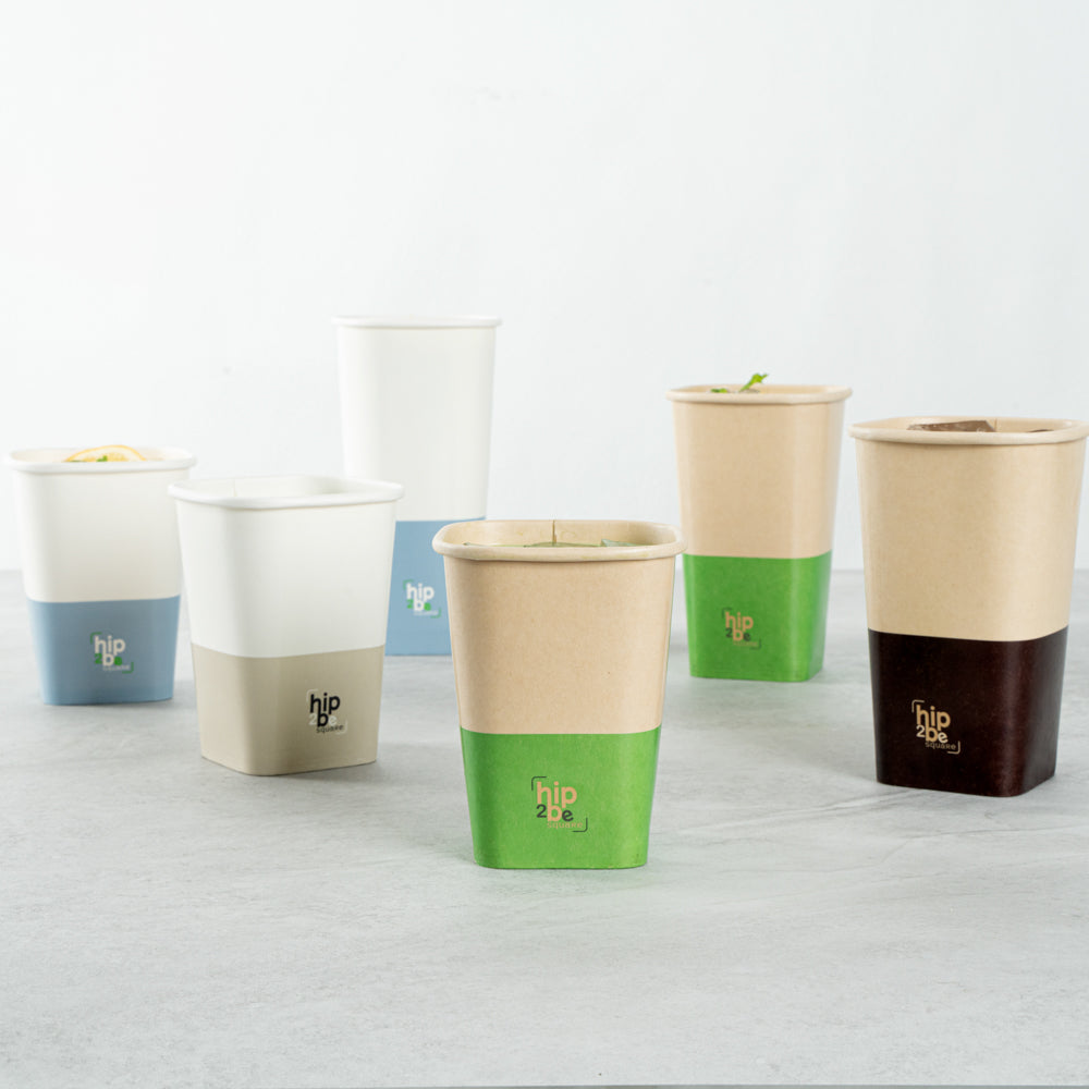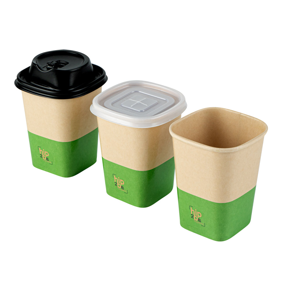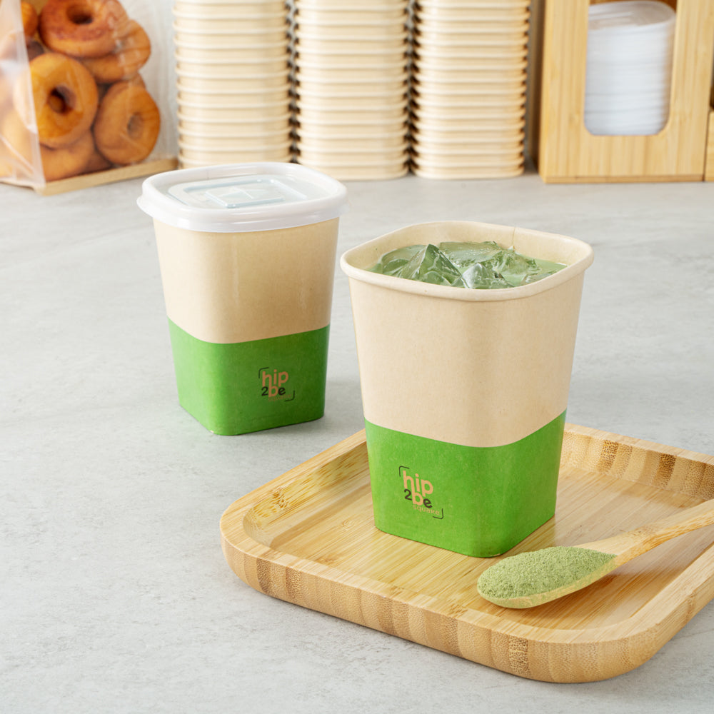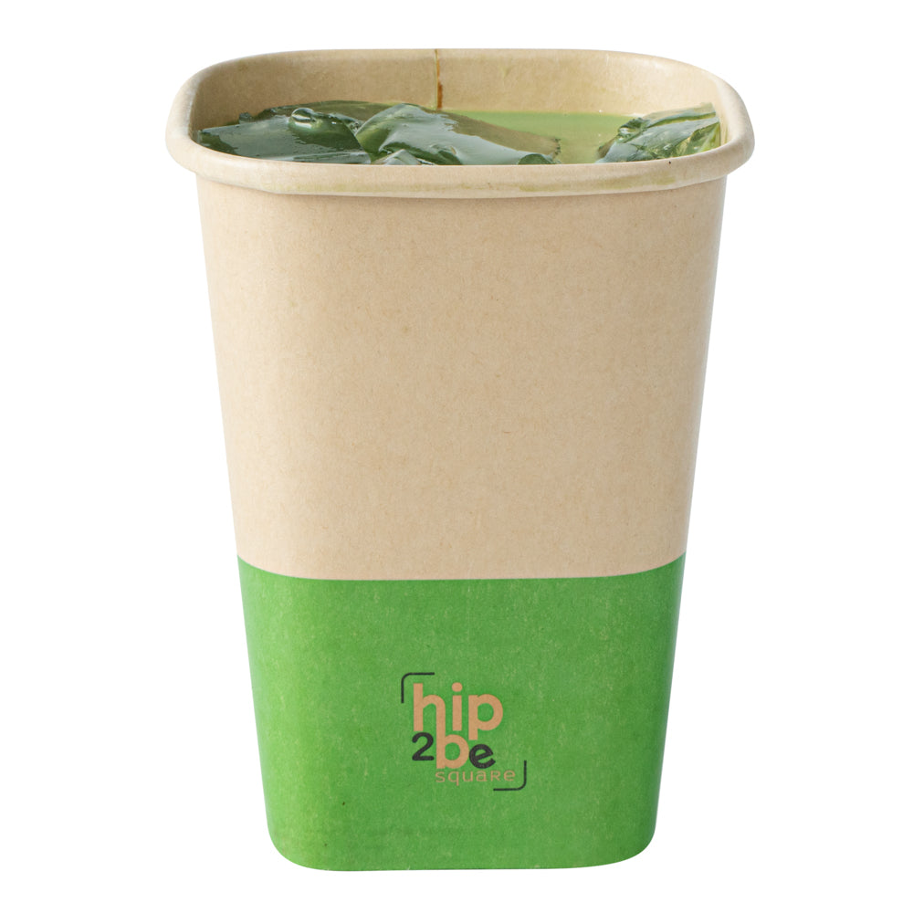 Serve delicious iced tea or fresh hot chocolate with our Hip 2 Be Square 12-Ounce Kraft and Green Paper Hot / Cold Drinking Cup. These hot chocolate paper cups have a "Hip 2 Be Square" lettering placed on the bottom front to create a pleasant drink experience for your guests. Constructed with a square design, these paper drinking cups add a unique touch to your buffet, cafe, or catered event. Crafted with a single wall, these paper coffee cups provide a secure grip while you drink your hot or iced coffee on the go. The double PE lining in these paper hot cups assures no leakage occurs when enjoying your hot or cold beverage. These 12-ounce paper cups for hot drinks are conveniently stackable to easily store while also increasing your overall storage space. For a pop of color, these tea paper cups are designed with recyclable kraft and green paper for an eye-catching look. Pair these paper hot cups with our compatible Hip 2 Be Square lids available, allowing you to confidently seal beverages and avoid messy spills on the go (SKU: RWA1108B and RWA1109C). These paper cups for cold drinks measure 3.25 in length by 3.25 in width by 4.25 in height. Sold in a 500 count box. Hip 2 Be Square sippy cup lids are available and sold separately.