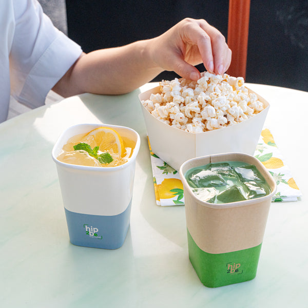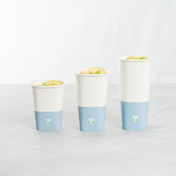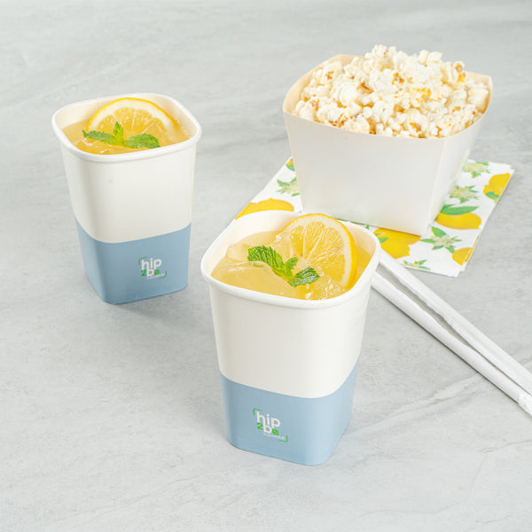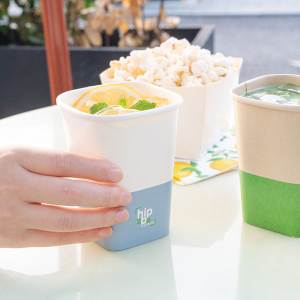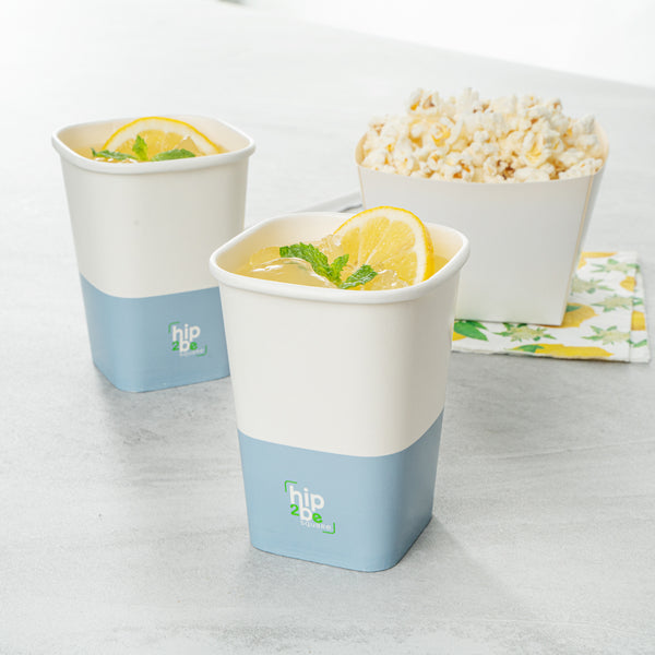 Easily drink and serve hot or cold beverages while on the go or at an event with our Hip 2 Be Square 12-Ounce White and Blue Paper Hot / Cold Drinking Cup. These 12-ounce square paper cups have a distinctive attractive appearance that also holds a sufficient capacity for coffee lovers. The single-wall construction on these hot chocolate paper cups allows for a more solid hold while serving or drinking beverages. These paper hot cups are conveniently recyclable for easy cleanup and waste reduction. The PE lining in these disposable hot cups is built to avoid any leakage or spills. These paper drinking cups have a "Hip 2 Be Square" text for your guests to enjoy. To avoid a crammed storage room, these paper cups for hot drinks are stackable. The white and blue paper design in these paper coffee cups adds a touch of color while maintaining a classic feel. Easily pair these paper hot cups with our compatible Hip 2 Be Square lids to perfectly seal your beverages during transport and avoid any potential messy spills (SKU: RWA1108B and RWA1109C). These tea paper cups measure 3.25 in length by 3.25 in width by 4.25 in height. Sold in a 500 count box. Hip 2 Be Square sippy cup lids are available and sold separately.