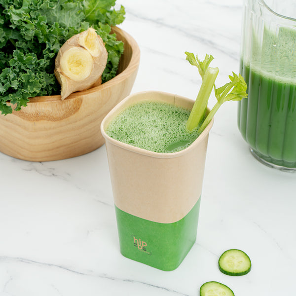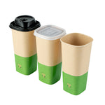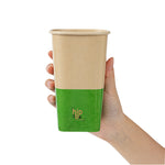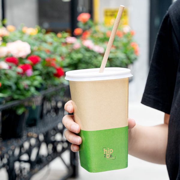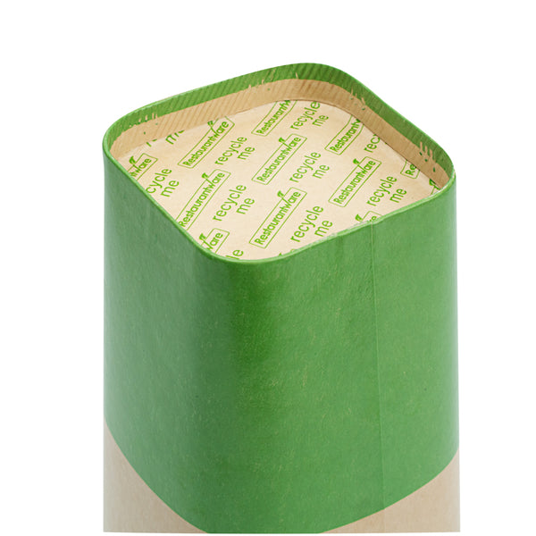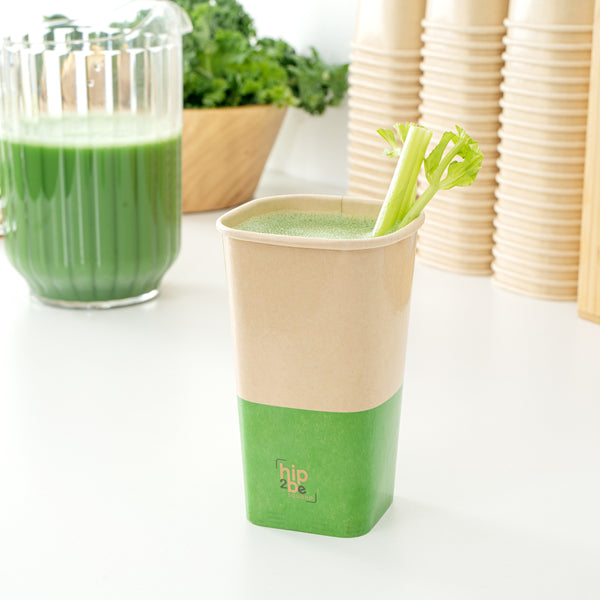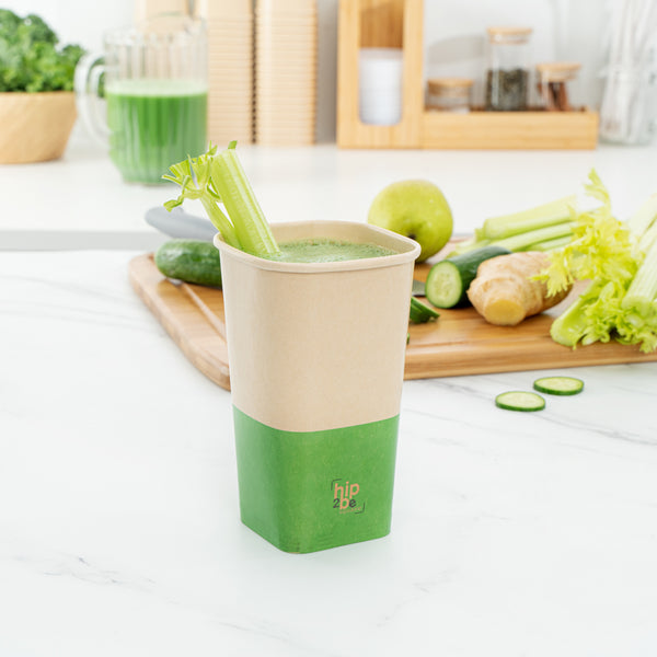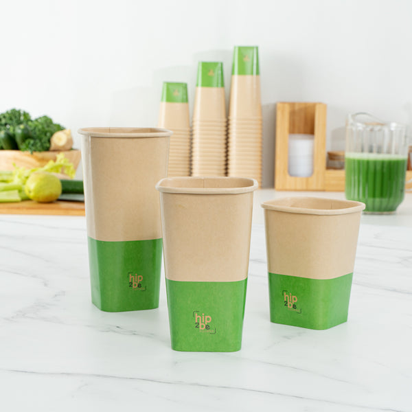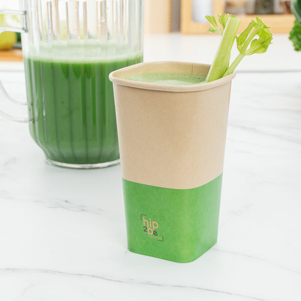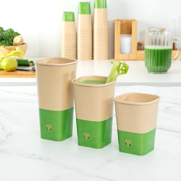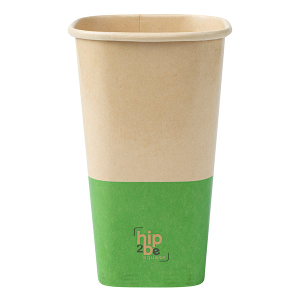 Comfortably drink iced or hot coffee with our Hip 2 Be Square 16-ounce Kraft and Green Paper Hot / Cold Drinking Cups. These 16-ounce hot cups have a versatile design to easily serve all kinds of hot or cold drinks. The double PE lining in these paper coffee cups avoids unwanted leakage or spills from occurring. Plus, these paper drinking cups have a single wall to easily grip when on the go. The square design in these paper cups for hot drinks adds a modern twist to your foodservice establishment. For a unique drinking experience, these paper cups have a "Hip 2 Be Square" text on the front. For a sustainable option, these paper coffee cups are disposable. For an organized storage room, the paper cups for hot drinks are effortlessly stackable. To add a pop of color, these tea paper cups are designed with kraft and green paper for an eye-catching look. These paper cups for hot drinks are compatible with our Hip 2 Be Square lids (SKU: RWA1108B and RWA1109C) and measure 3.25 inches in length by 3.25 inches in width by 5.5 inches in height. Sold in a 25 count box. Hip 2 Be Square sippy and straw cup lids are available and sold separately.