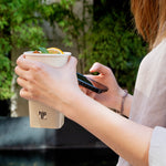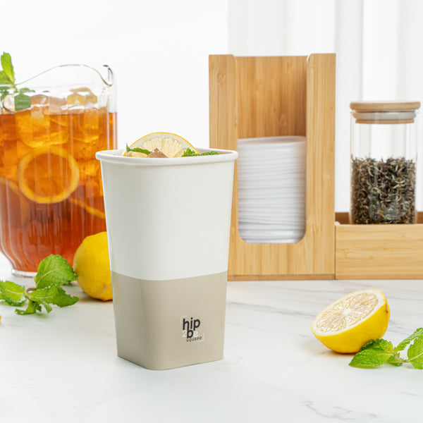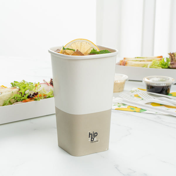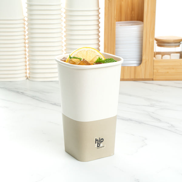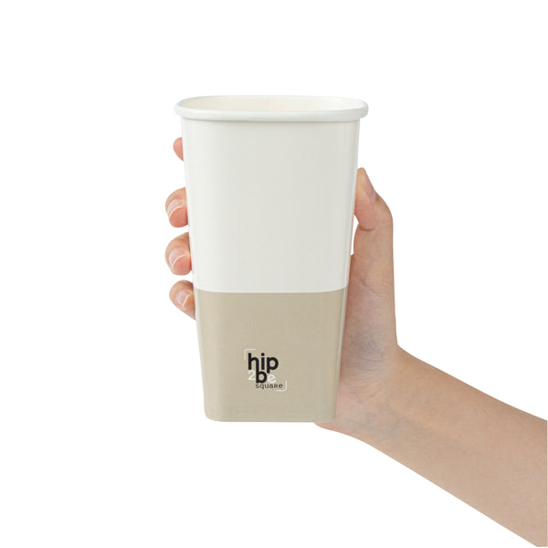 Conveniently serve your customers' favorite warm or cool beverages with our Hip 2 Be Square 16-ounce White and Taupe Paper Hot / Cold Drinking Cups. These 16-ounce hot cups have a large capacity to hold warm hot chocolate or iced coffee. The single-wall construction of these paper drinking cups allow for a comfy and secure grip while drinking. For a modern touch at your cafe or food service establishment, these paper cups have a square design. The double PE lining of these tea paper cups stops any potential spills or leakage from occurring. To leave your guests with an unforgettable drinking experience, these hot chocolate paper cups have a fun "Hip 2 Be Square" text. These paper cups for cold drinks are easily stackable and disposable for a simple cleaning process. For a sophisticated appearance, these tea paper cups are crafted with white and taupe-colored paper. These paper cups for hot drinks are compatible with our Hip 2 Be Square lids (SKU: RWA1108B and RWA1109C) and measure 3.25 inches in length by 3.25 inches in width by 5.5 inches in height. Sold in a 500 count box. Hip 2 Be Square sippy and straw cup lids are available and sold separately.