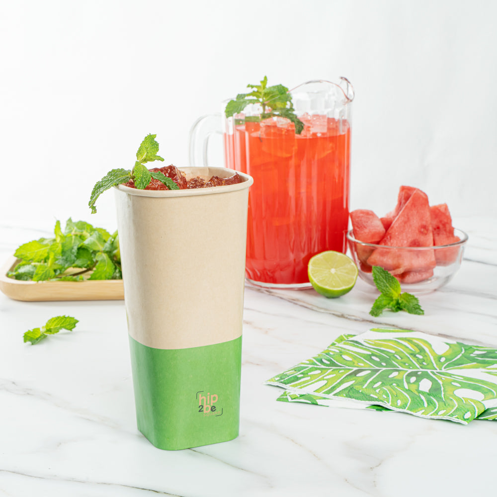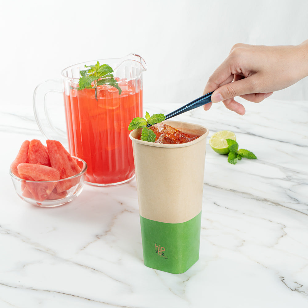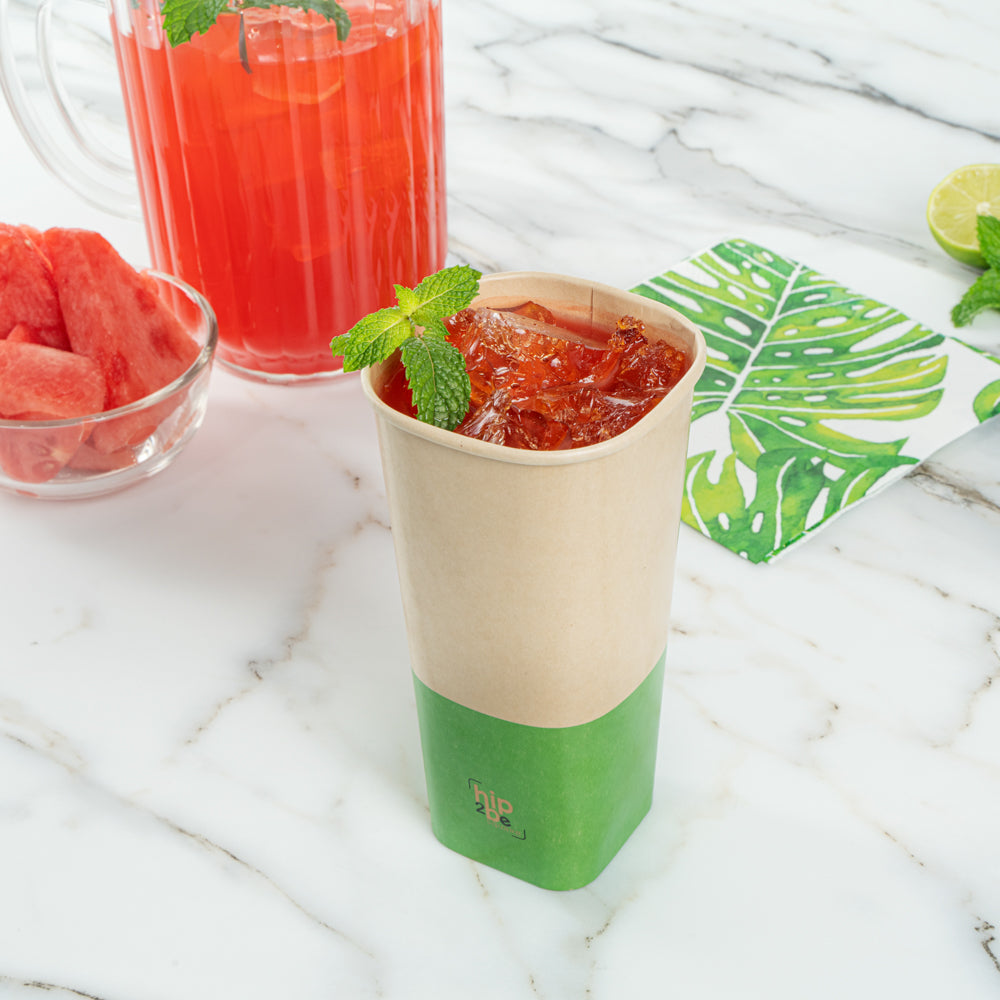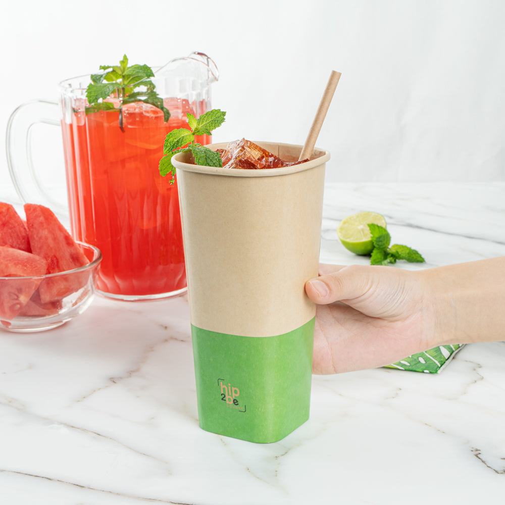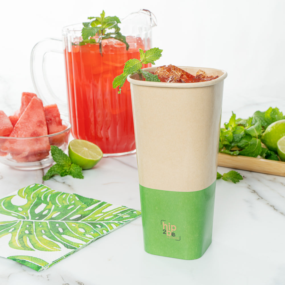 Effortlessly serve hot teas or ice-cold lemonades with our Hip 2 Be Square 22 oz Kraft and Green Paper Hot / Cold Drinking Cups. These disposable cups are designed with a unique square shape to add an eye-catching element to your beverages. Made to hold hot and cold drinks, these square coffee cups are perfect for serving any drink at your coffee shop, food truck, or restaurant. Constructed with a single wall, these sturdy paper cups provide a comfortable grip while transporting beverages. These disposable paper cups feature a double PE lining for added durability to avoid any leaks or spills. To save on storage space in your kitchen, these hot and cold cups can easily be stacked. With a kraft and green finish, these square paper cups are stylish and complement the rest of your packaging supplies. Pair these coffee cups with our Hip 2 Be Square lids to facilitate your to go or delivery services (SKU: RWA1108B and RWA1109C). These 22-ounce cups measure 3.25 inches long by 3.25 inches wide by 6.75 inches tall. Sold in a 25 count box.