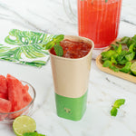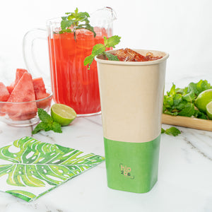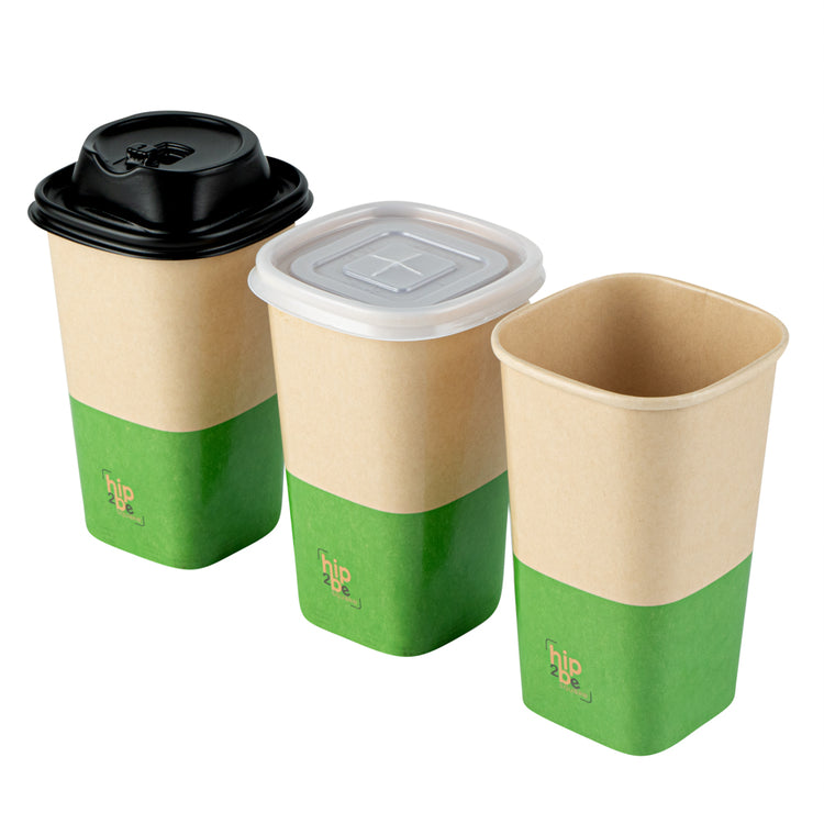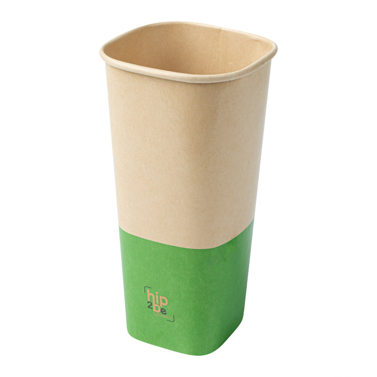Effortlessly serve hot teas or ice-cold lemonades with our Hip 2 Be Square 22 oz Kraft and Green Paper Hot / Cold Drinking Cups. These disposable cups are designed with a unique square shape to add an eye-catching element to your beverages. Made to hold hot and cold drinks, these square coffee cups are perfect for serving any drink at your coffee shop, food truck, or restaurant. Constructed with a single wall, these sturdy paper cups provide a comfortable grip while transporting beverages. These disposable paper cups feature a double PE lining for added durability to avoid any leaks or spills. To save on storage space in your kitchen, these hot and cold cups can easily be stacked. With a kraft and green finish, these square paper cups are stylish and complement the rest of your packaging supplies. Pair these coffee cups with our Hip 2 Be Square lids to facilitate your to go or delivery services (SKU: RWA1108B and RWA1109C). These 22-ounce cups measure 3.25 inches long by 3.25 inches wide by 6.75 inches tall. Sold in a 500 count box.