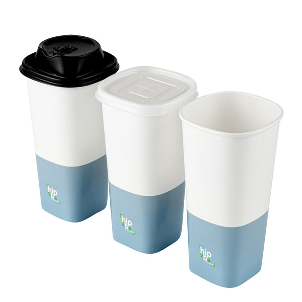 Enjoy various hot and cold beverages with our Hip 2 Be Square 22 oz White and Blue Paper Hot / Cold Drinking Cup. With an innovative square design, these disposable paper cups offer guests a unique and comfortable drinking experience. These square coffee cups are suitable for both hold and cold drinks, making them the perfect option for warm teas or refreshing lemonades. With a single wall construction and a double PE lining, these paper cups are sturdy and secure to reduce the risk of leaks while transporting drinks. These hot and cold cups are easily stackable to save storage space in your cafe, bakery, or coffee shop. Featuring a white and blue finish, these disposable cups are stylish and provide a unique touch to your beverages. Pair these square paper cups with our corresponding Hip 2 Be Square lids to allow guests to conveniently take drinks on the go (SKU: RWA1108B and RWA1109C). These coffee cups measure 3.25 inches in length by 3.25 inches in width by 6.75 inches in height. Sold in a 25 count box.
