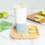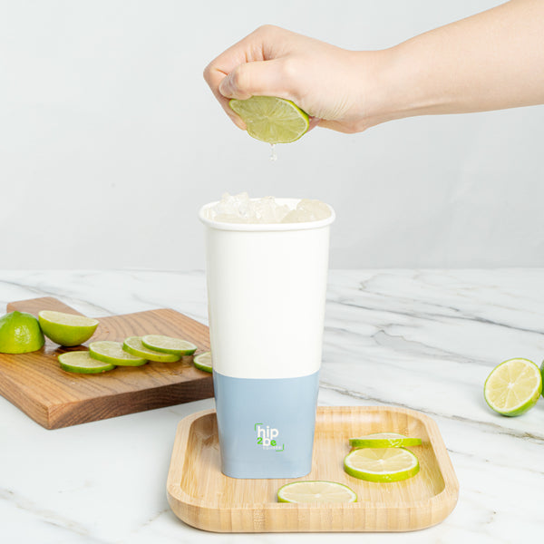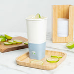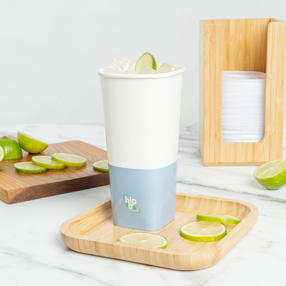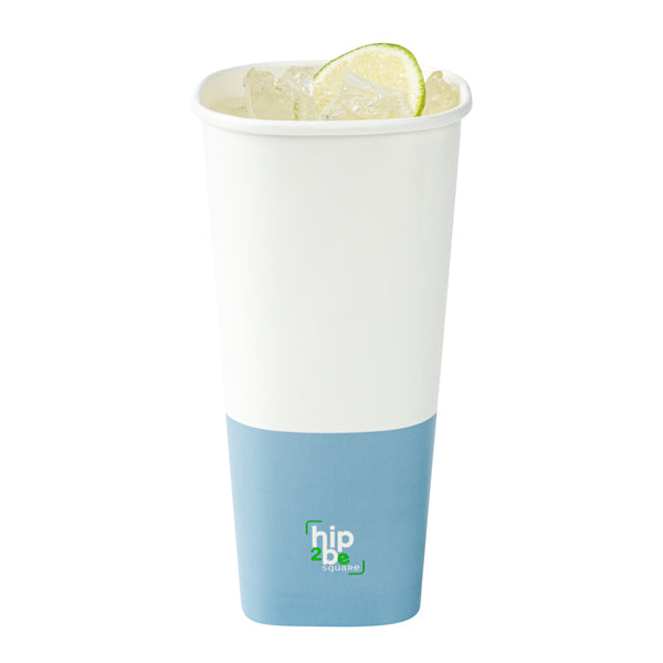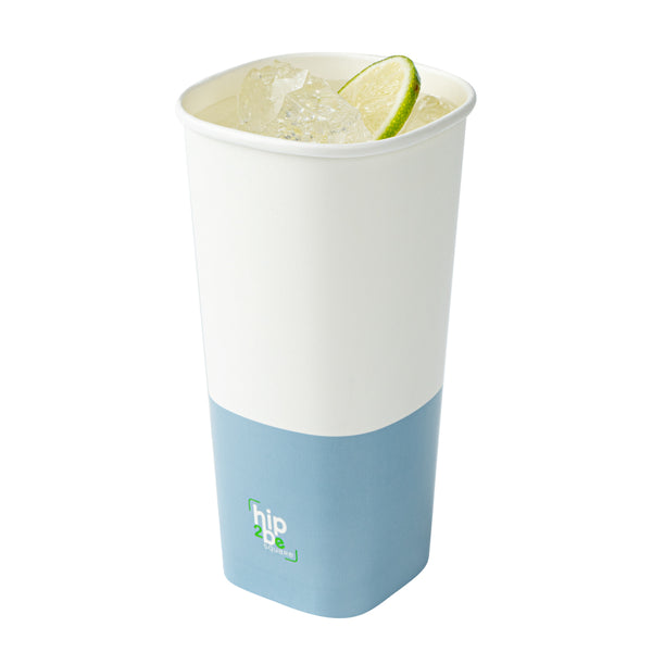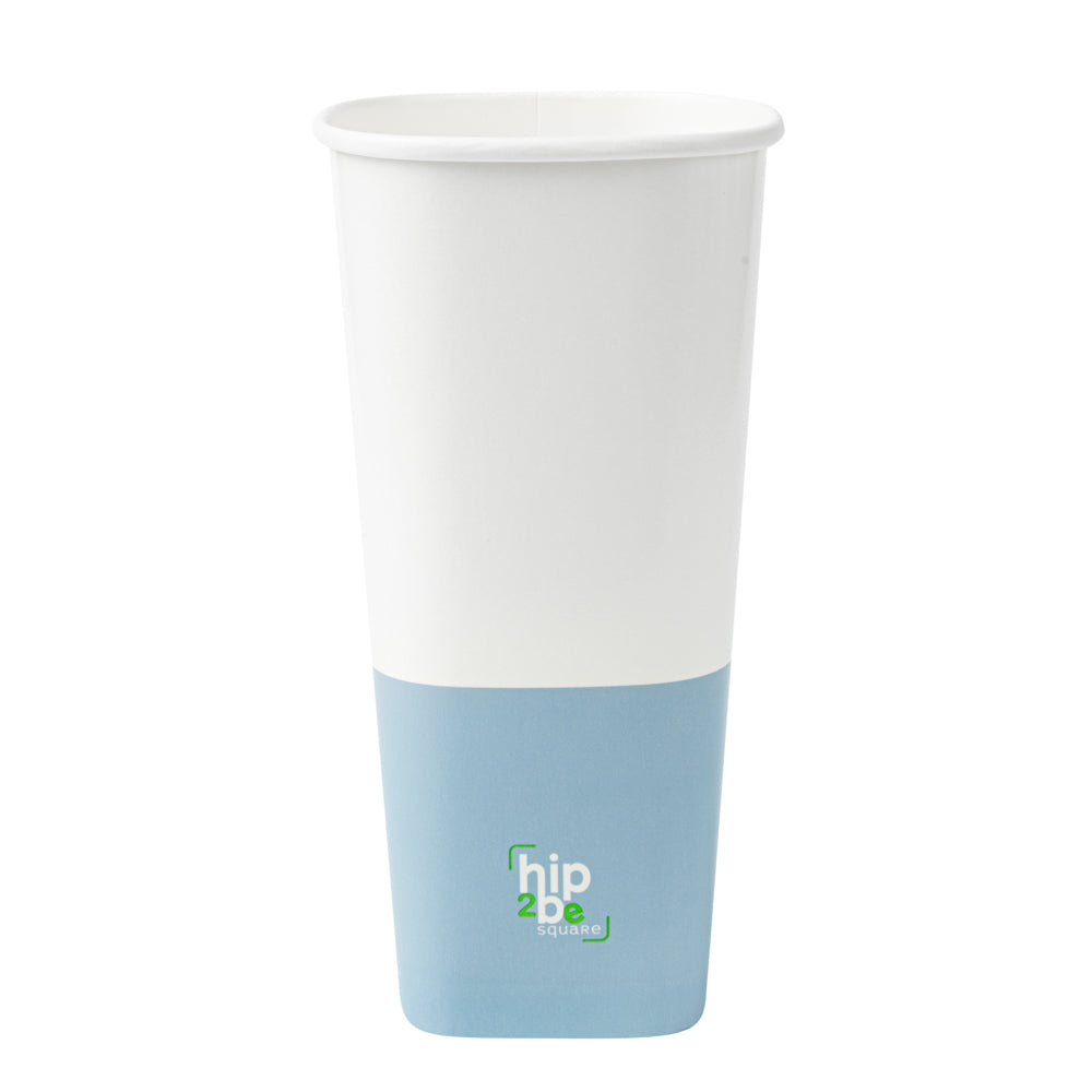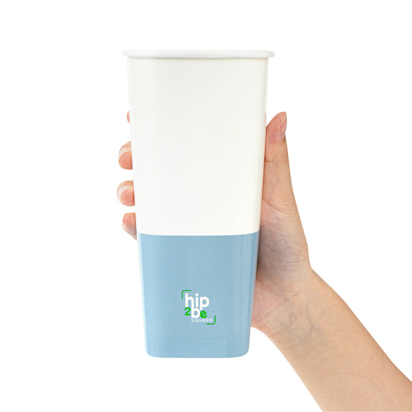Enjoy various hot and cold beverages with our Hip 2 Be Square 22 oz White and Blue Paper Hot / Cold Drinking Cup. With an innovative square design, these disposable paper cups offer guests a unique and comfortable drinking experience. These square coffee cups are suitable for both hold and cold drinks, making them the perfect option for warm teas or refreshing lemonades. With a single wall construction and a double PE lining, these paper cups are sturdy and secure to reduce the risk of leaks while transporting drinks. These hot and cold cups are easily stackable to save storage space in your cafe, bakery, or coffee shop. Featuring a white and blue finish, these disposable cups are stylish and provide a unique touch to your beverages. Pair these square paper cups with our corresponding Hip 2 Be Square lids to allow guests to conveniently take drinks on the go (SKU: RWA1108B and RWA1109C). These coffee cups measure 3.25 inches in length by 3.25 inches in width by 6.75 inches in height. Sold in a 500 count box.