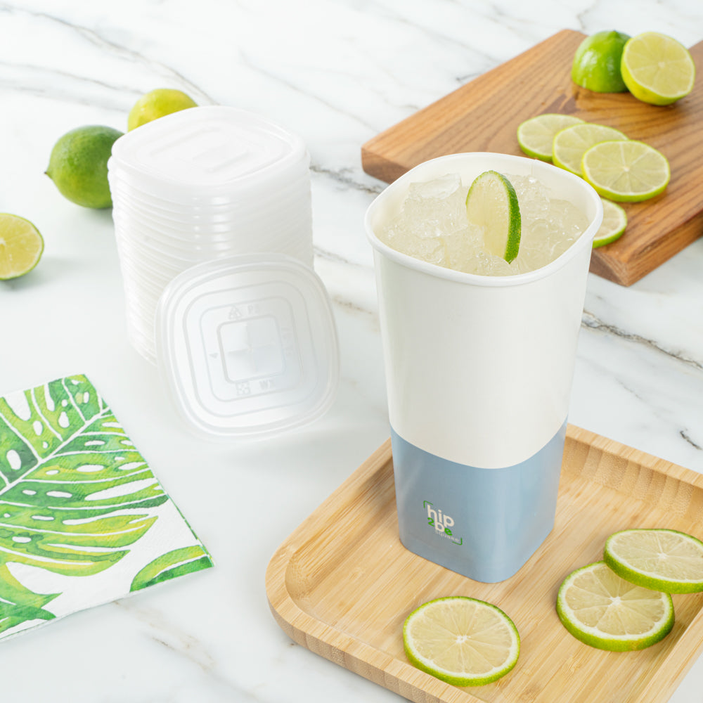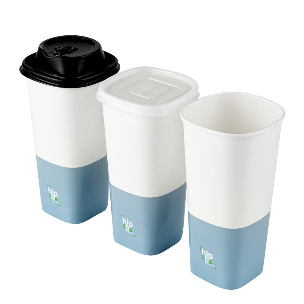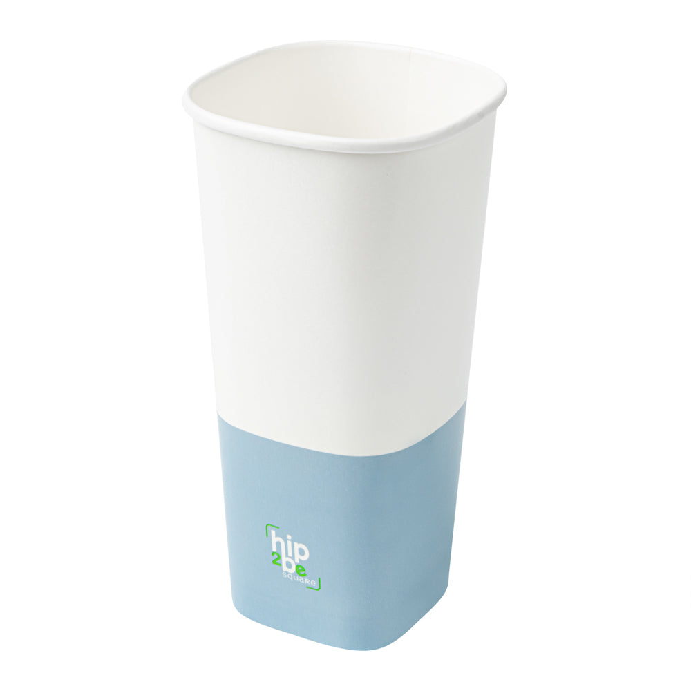 Enjoy various hot and cold beverages with our Hip 2 Be Square 22 oz White and Blue Paper Hot / Cold Drinking Cup. With an innovative square design, these disposable paper cups offer guests a unique and comfortable drinking experience. These square coffee cups are suitable for both hold and cold drinks, making them the perfect option for warm teas or refreshing lemonades. With a single wall construction and a double PE lining, these paper cups are sturdy and secure to reduce the risk of leaks while transporting drinks. These hot and cold cups are easily stackable to save storage space in your cafe, bakery, or coffee shop. Featuring a white and blue finish, these disposable cups are stylish and provide a unique touch to your beverages. Pair these square paper cups with our corresponding Hip 2 Be Square lids to allow guests to conveniently take drinks on the go (SKU: RWA1108B and RWA1109C). These coffee cups measure 3.25 inches in length by 3.25 inches in width by 6.75 inches in height. Sold in a 500 count box.