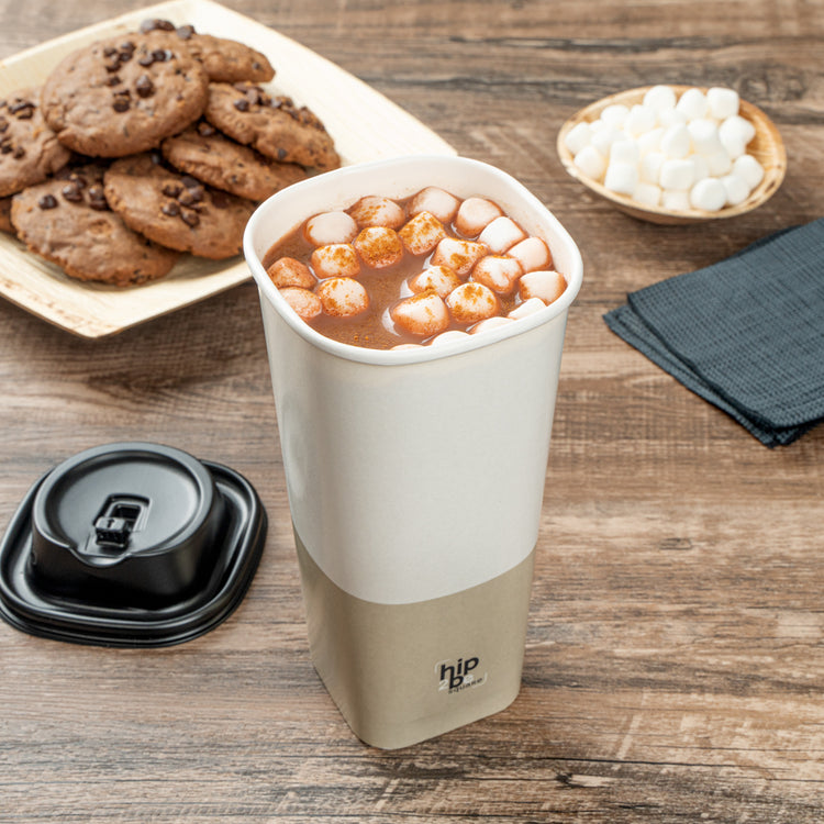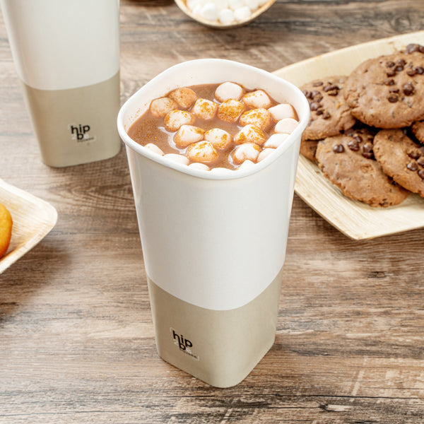 Provide guests with a unique drinking experience with our Hip 2 Be Square 22 oz White and Taupe Paper Hot / Cold Drinking Cup. These paper cups feature an innovative square design to add a stylish touch to your beverages. Built to hold both hot and cold drinks, these square coffee cups are versatile for use at your food truck, cafe, or coffee shop. These hot and cold cups feature a single wall design for a comfortable grip while taking coffee or tea on the go. Plus, they have a double PE lining to avoid beverages from seeping through. With a stackable design, these disposable cups save storage space so you can keep supplies on hand without the worry of clutter. These coffee cups have a classic white and taupe finish to fit in with the rest of your supplies. Pair these square paper cups with our coordinating Hip 2 Be Square lids to avoid spills or leaks while transporting drinks (SKU: RWA1108B and RWA1109C). These 22-ounce disposable paper cups measure 3.25 inches long by 3.25 inches wide by 6.75 inches tall. Sold in a 25 count box.