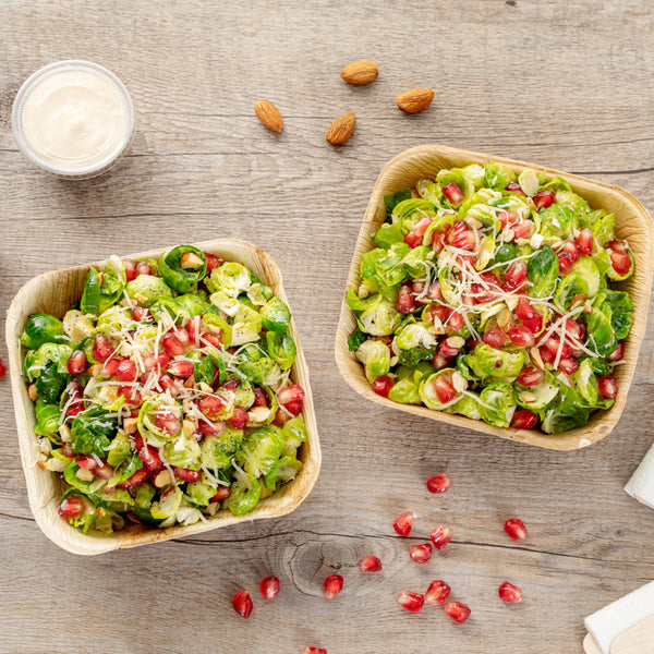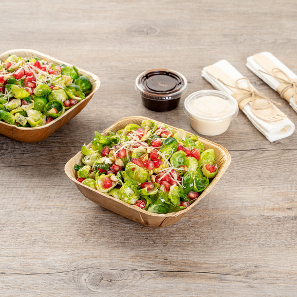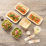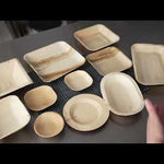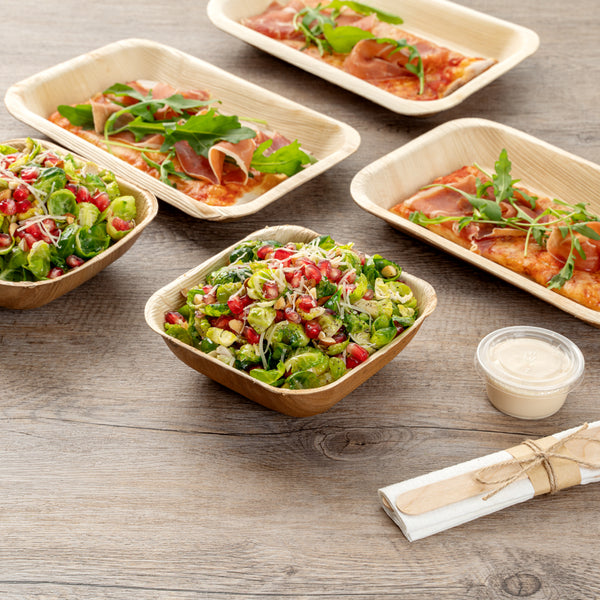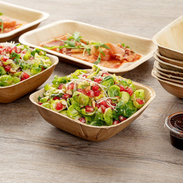 These palm leaf disposables are available in a variety of shapes and sizes to serve with all types of dishes. Enjoy any snack, entree, or dessert!