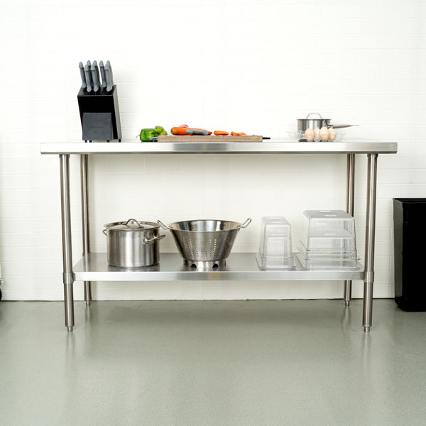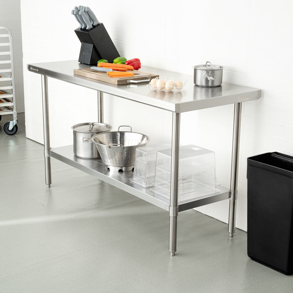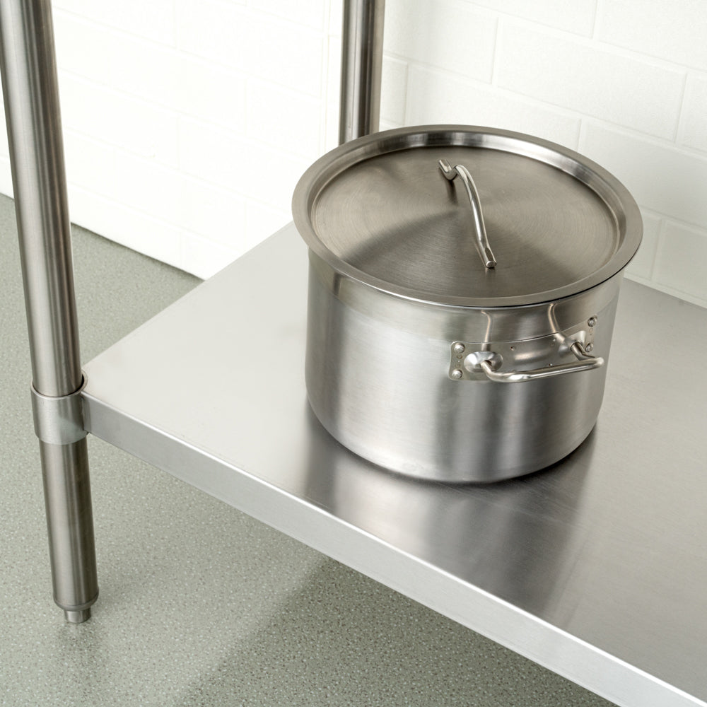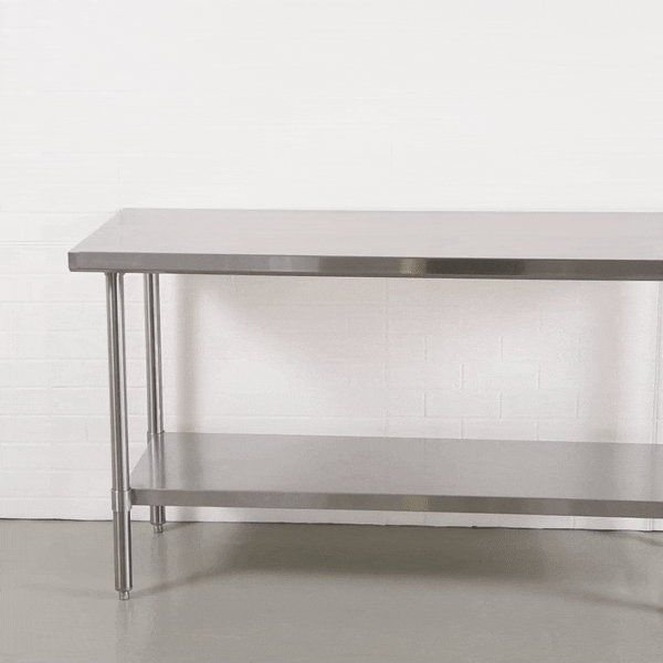 The top shelf of these work tables holds hundreds of pounds of heavy equipment such as espresso machines or mixers. Most of our metal tables have an undershelf for extra storage for bowls, bins, or ingredients.
