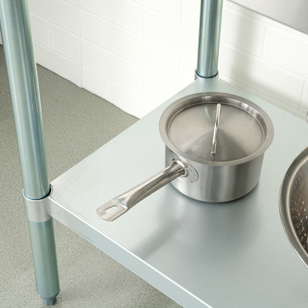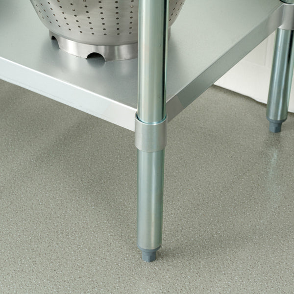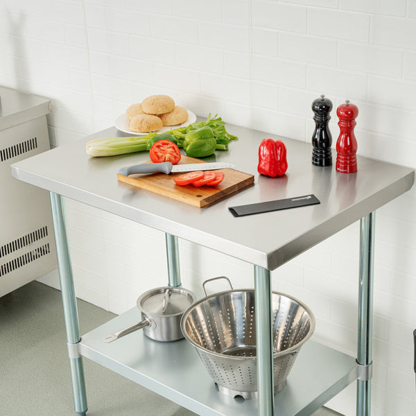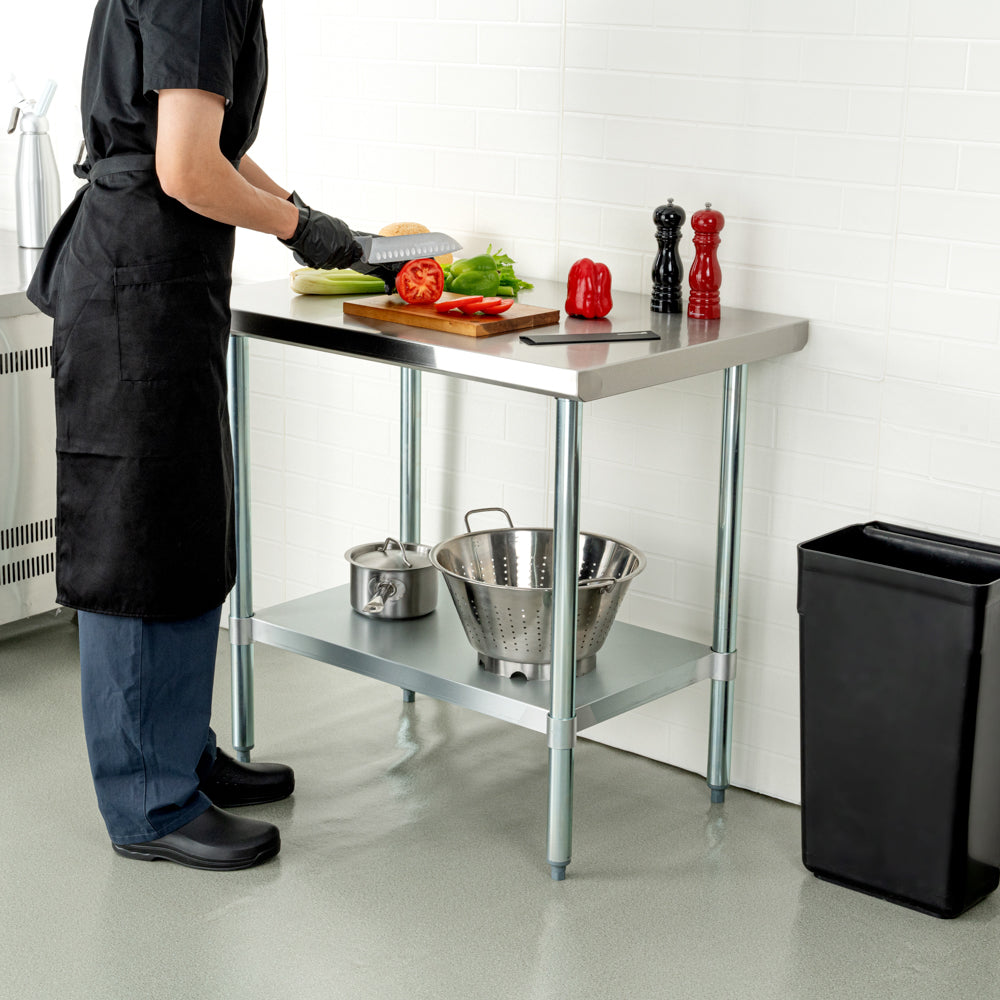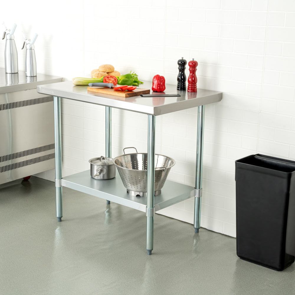 The top shelf of these work tables holds hundreds of pounds of heavy equipment such as espresso machines or mixers. Most of our metal tables have an undershelf for extra storage for bowls, bins, or ingredients.
