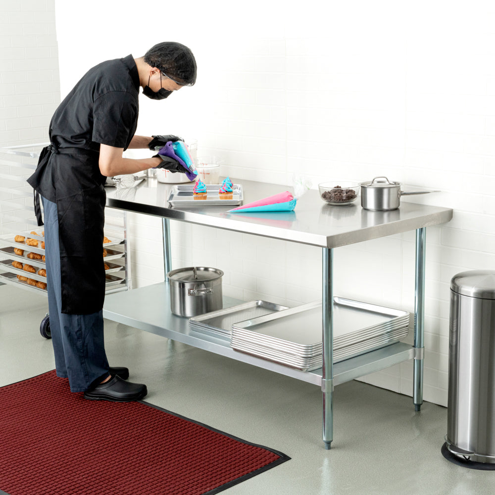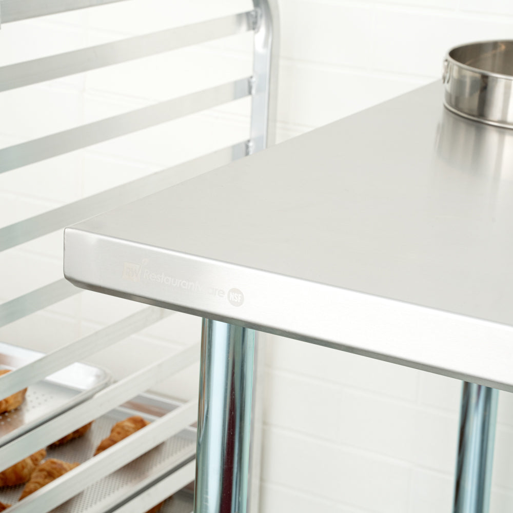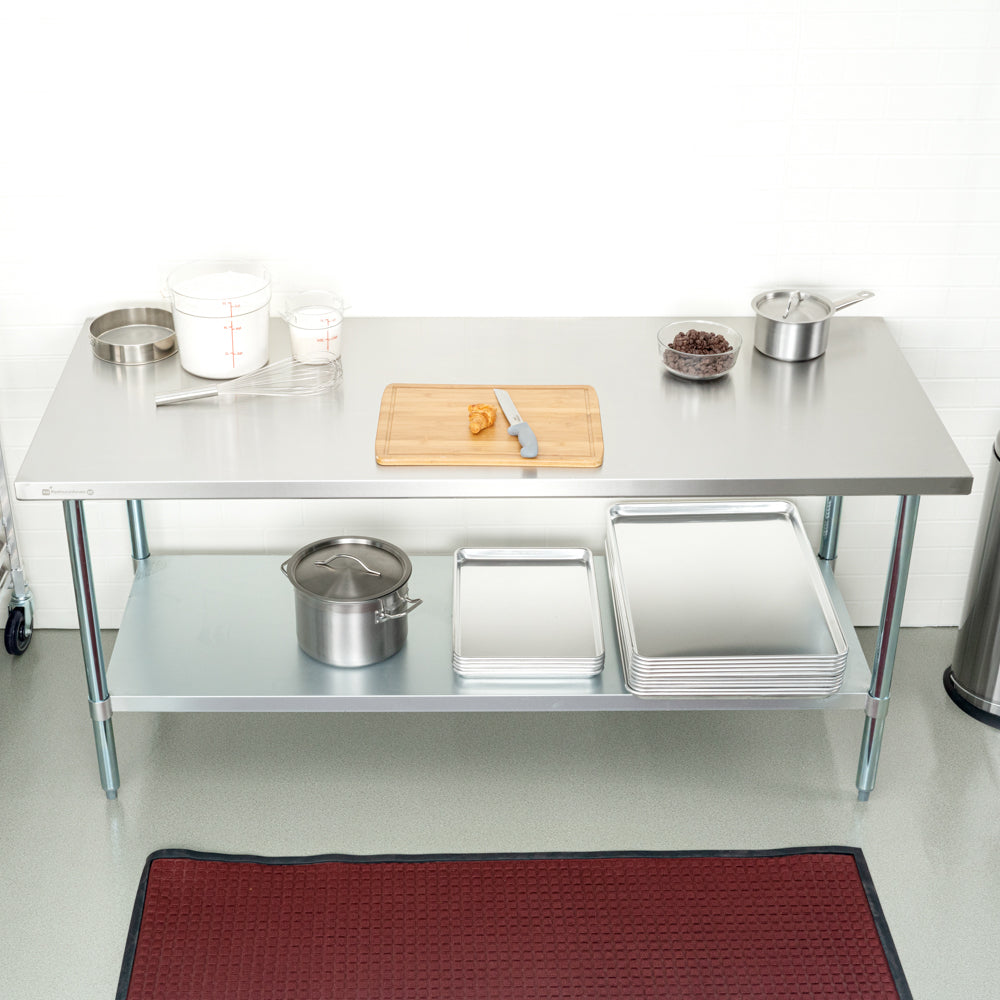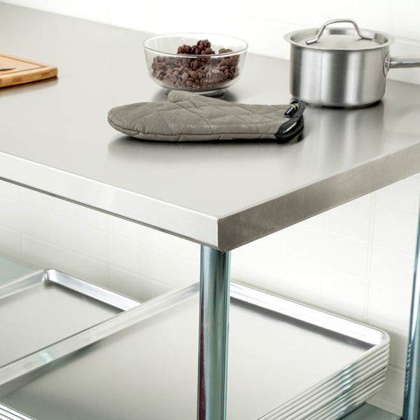 The top shelf of these work tables holds hundreds of pounds of heavy equipment such as espresso machines or mixers. Most of our metal tables have an undershelf for extra storage for bowls, bins, or ingredients.