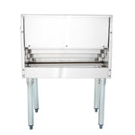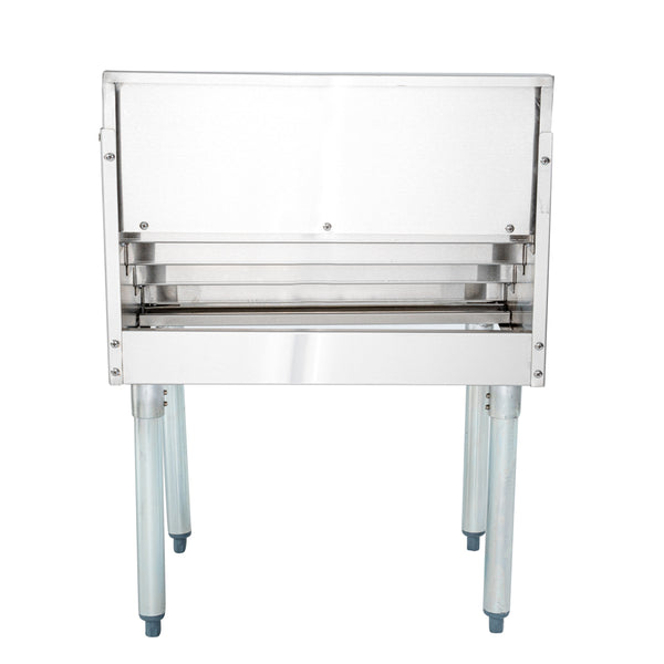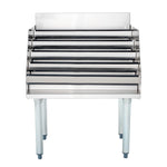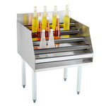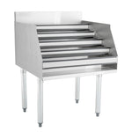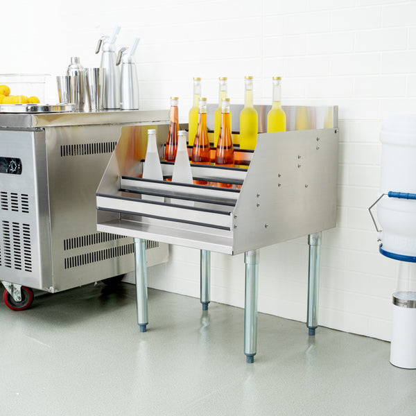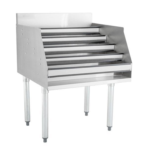 Keep liquor bottles within reach and maintain an organized bar space with our Kitchen Tek 304 Stainless Steel Liquor Display Rack. With an 18 gauge type 304 stainless steel construction, this liquor rack is durable to set up your drink options on display and is easy to clean. This liquor display has a 5-tiered design to hold up to 30 liquor bottles, making it ideal to add to your establishment's bar or storage room. Constructed with 2-inch wide, 16 gauge 304 type bars, this liquor bottle display securely holds your bottles in place during use. For a safe and clean work environment, this alcohol rack has a 3-inch backsplash to avoid liquor from spilling on the floor and keep staff from slipping. Fabricated with galvanized legs and bracing with 4 plastic bullet feet, this bar bottle display stands firmly behind your bar with great stability. This drink rack has a total capacity of 254 pounds and measures 24 inches in length by 23 inches in width by 33 inches in height. Sold in a 1 count box.