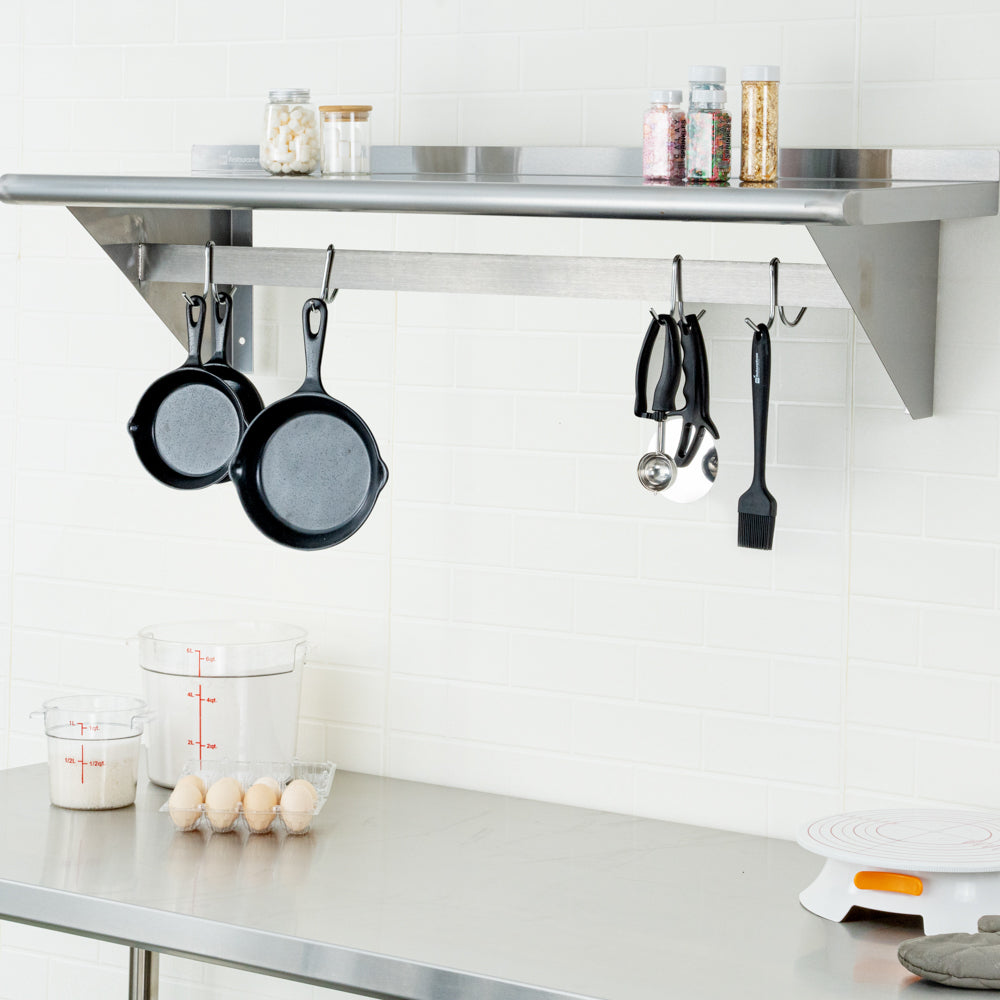 Made from premium stainless steel, these wall-mounted pot racks are designed to last in your foodservice establishment. The strong material ensures you don't have to worry about replacing your shelving.