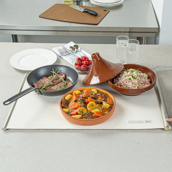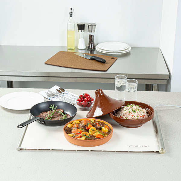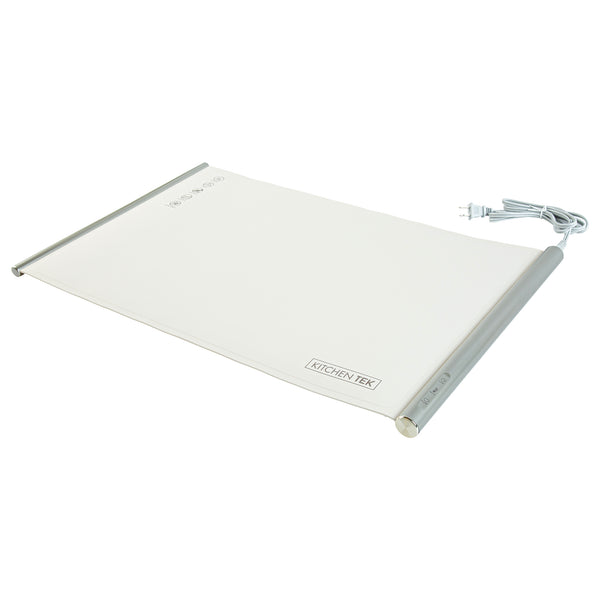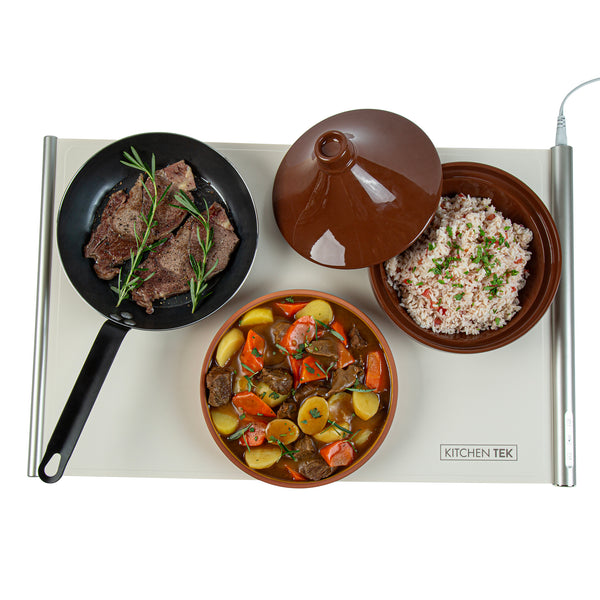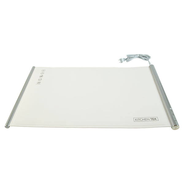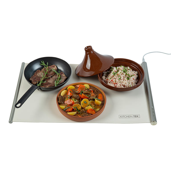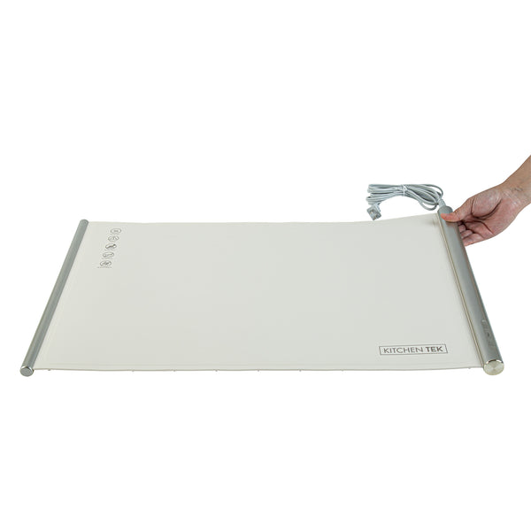 Ensure perfect temperature control with every dish. The Kitchen Tek Electric Food Heater offers an interactive touch panel that enables precise temperature settings, ensuring your electric food heater maintains optimal warmth for all culinary creations. With efficient 120V operation, this buffet warmer consistently keeps dishes at the ideal serving temperature, enhancing the dining experience for your guests. Crafted from flexible silicone, this silicone warming tray features a rollable design for quick setup and easy storage, making it indispensable for busy kitchens. Its generous dimensions of 26.25 inches by 16.65 inches provide ample space to accommodate multiple dishes, maximizing service efficiency and complementing a variety of kitchen decors with its neutral beige color. Integrate this versatile food warmer into your catering supplies to elevate service quality and guest satisfaction. Each order includes 1 Kitchen Tek Electric Food Heater.