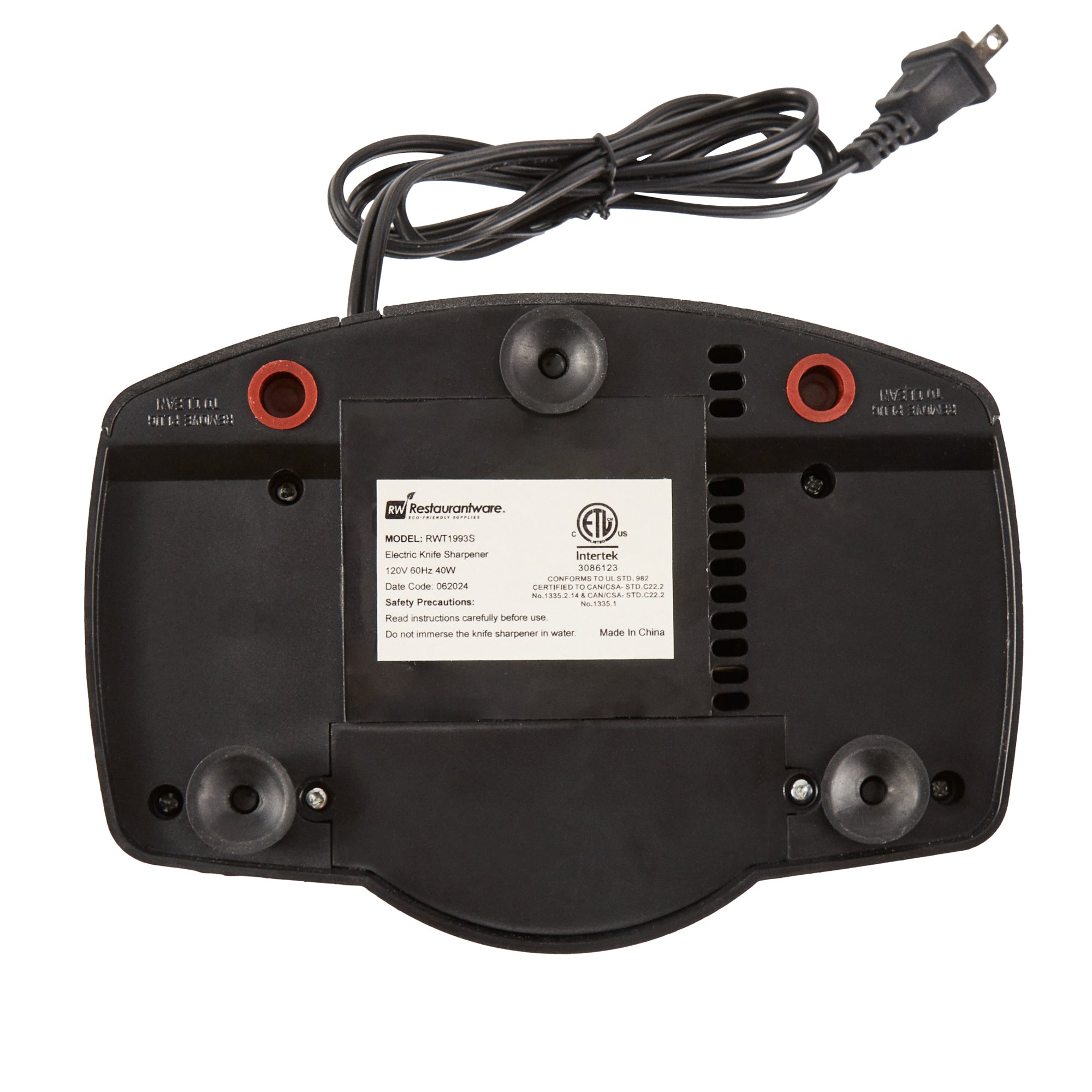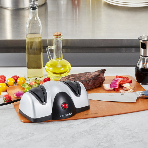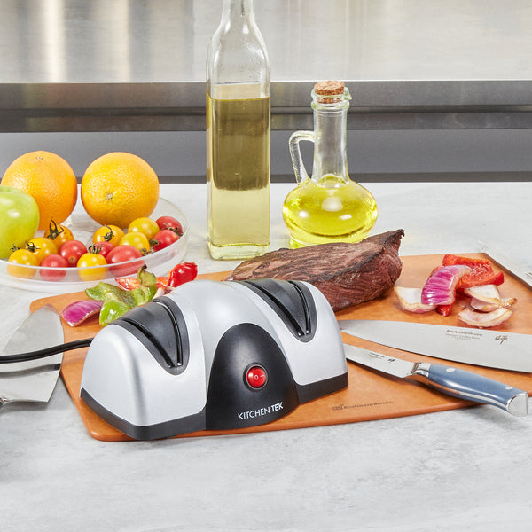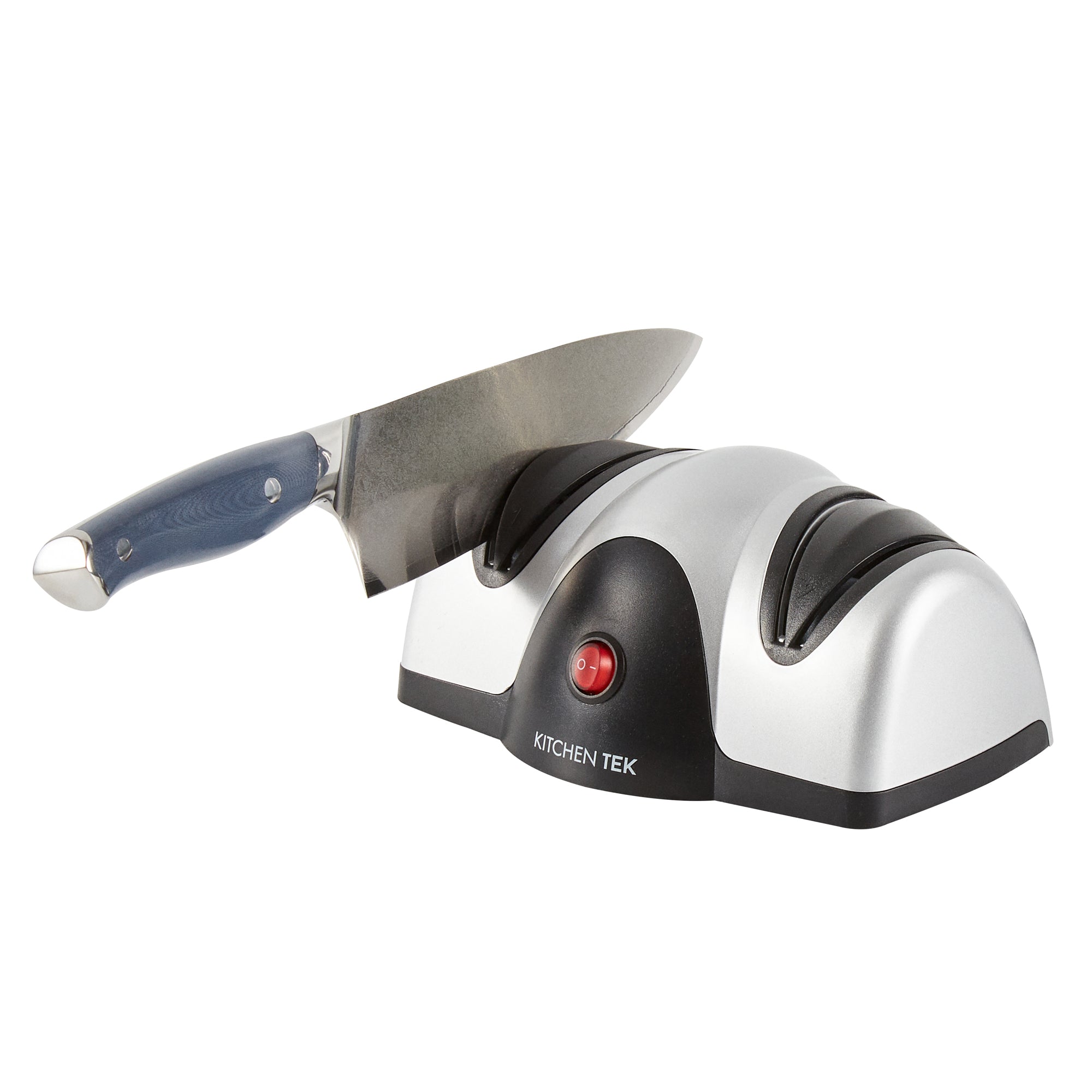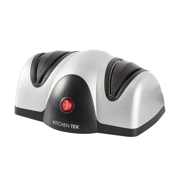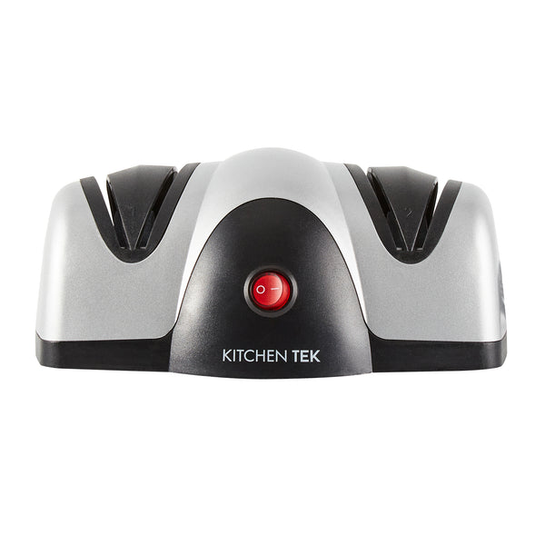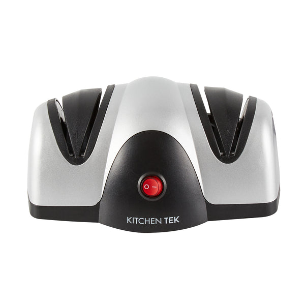 Optimize your kitchen's efficiency with our Kitchen Tek Silver Plastic 2 Stage Electric Knife Sharpener. This electric knife sharpener is specifically designed for metal straight-edge knives, ensuring precise sharpening for optimal cutting performance. Featuring a 2-stage sharpening process, this knife sharpener ensures a precise and durable edge. With numbered bases, this kitchen knife sharpener guide you through each stage, enhancing knife performance and longevity. Stage one of this commercial knife sharpener employs a sapphirite grinding wheel, effectively restoring the edge of your knives. Plus, stage two of this portable metal knife sharpener hones and polishes the blades, resulting in smooth, razor-sharp edges. With an on and off switch, thissharp knife sharpener offers convenient control for easy operation and safety during use. The 3 suction feet of this plastic knife sharpener provide stable and secure placement on your countertop, preventing it from slipping or shifting during use. Operating on 120V, this portable knife sharpener ensures compatibility with most outlets in the US. Delivering 40W of power, this portable electric knife sharpener offers robust performance for efficient and effective sharpening wherever you need it. Measuring 7.48 inches in length by 5.71 inches in width by 3.74 inches in height, this kitchen blade sharpener fits perfectly into any kitchen set up. Sold in a 1 count box.