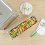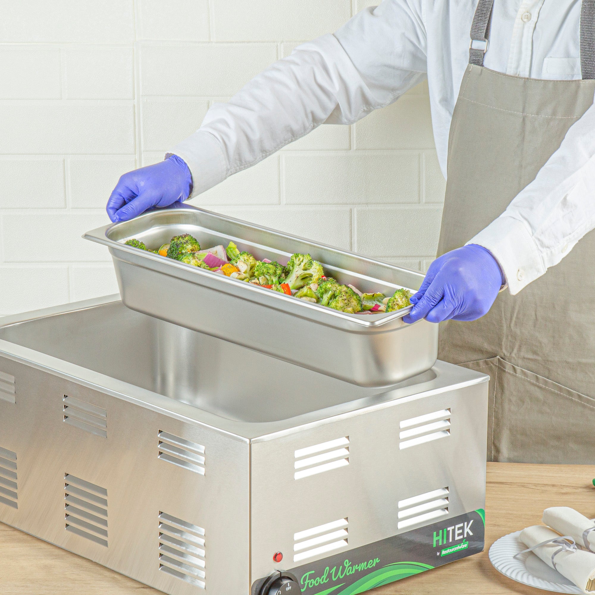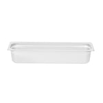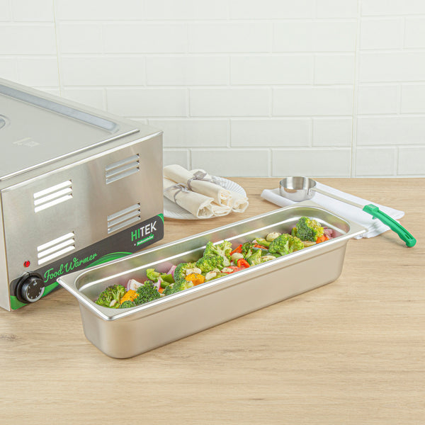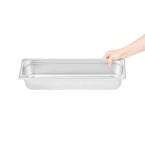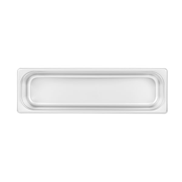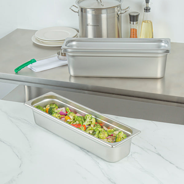 Keep your kitchen running at peak efficiency with our Kitchen Tek Stainless Steel 1/2 Size Long Steam Table Pan. This hotel pan incorporates an anti-jam stacking lug for non-stick separation and rapid accessibility, making it ideal in a high-traffic kitchen. Constructed from 24 gauge stainless steel, this steam pan is durable and withstands frequent use in any commercial foodservice setup. This stainless steel pan can be paired with their matching lids (SKUs: RWT1617S-1 and RWT1625S-1) to ensure meals are safe from outside pollutants. Meeting the stringent NSF standards, this steam table pan meets the highest health and quality requirements for foodservice professionals. The 4-inch depth of this buffet pan allows for serving more voluminous options, such as thick stews and generous portions of side dishes. With its sturdy construction, this stainless steel catering pan is adept at serving both hot and cold foods. Engineered for oven use, this catering pan can withstand temperatures up to 1600F. This long table pan is freezer-safe, providing convenient storage for prepared meals. For simplified post-service cleanup, this stainless steel table pan is compatible with commercial dishwashers. This food pan measures 20.8 inches in length by 6.5 inches in width by 4 inches in depth. Sold in a 1 count box. Lids are available and sold separately.