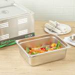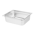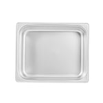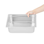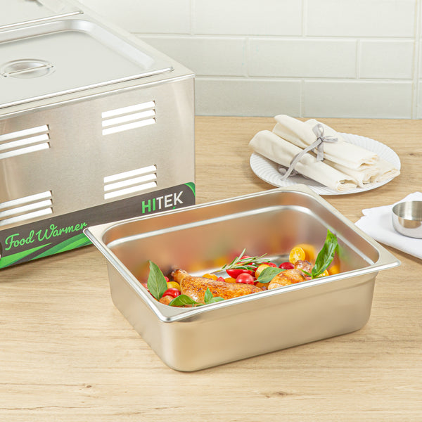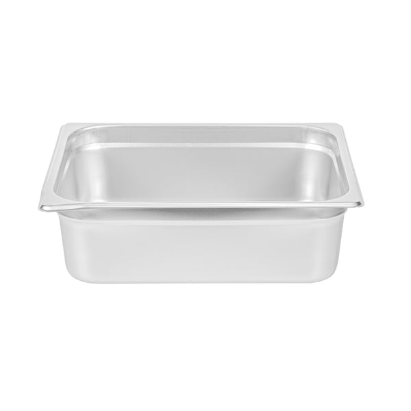 Discover the versatility of our Kitchen Tek Stainless Steel 1/2 Size Steam Table Pans. These steam table pans feature an anti-jam stacking lug and ensure hassle-free separation and easy lifting. Crafted with 24 gauge stainless steel, these steam pans offer exceptional durability and withstand the rigors of commercial use with ease. These hotel pans can be paired with its compatible lids (SKUs: RWT1611S and RWT1619S) to protect your food from contaminants. Aligning with NSF standards, these buffet pans ensure compliance with rigorous quality and safety regulations for commercial foodservice establishments. The 4-inch depth of these stainless steel pans offers generous space for a variety of menu items, from hearty entrees to abundant sides. These metal pans are oven-safe up to 1600F, providing versatility for a wide range of cooking applications. For storing your prepared meals, these stainless steel steam pans are freezer-safe, allowing you to preserve food conveniently for later use. The heavy-duty design of these metal catering pans ensures long-lasting use and makes them ideal for serving hot and cold meals. To ensure a swift cleanup, these metal buffet pans can safely be cleaned in a commercial dishwasher. These catering pans measure 12.8 inches in length by 10.4 inches in width by 4 inches in depth. Sold in a 6 count box. Lids are available and sold separately.