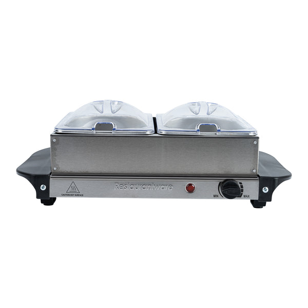 - Adjustable temperature control knob provides precise adjustments for warming food