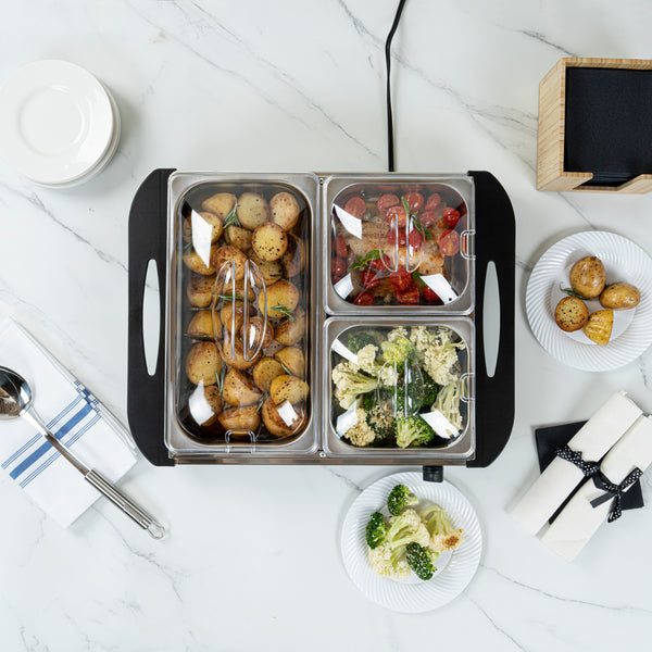 Featuring a built-in thermostat and control knob, this food warmer allows for precise temperature adjustments to keep your dishes at the perfect serving temperature. Always just right!