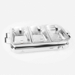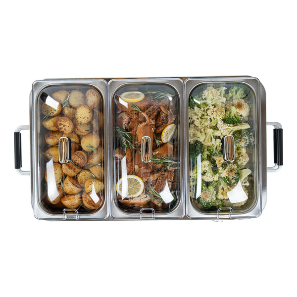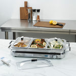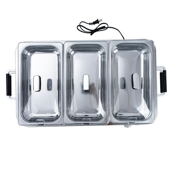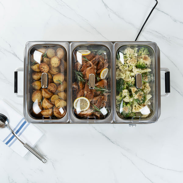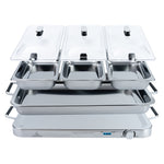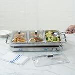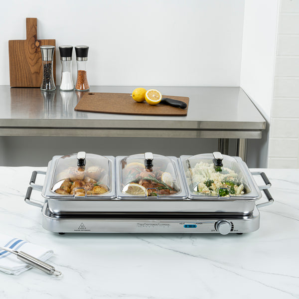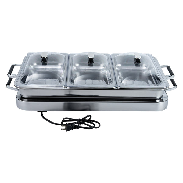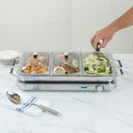 Elevate your foodservice experience with our Kitchen Tek Stainless Steel Buffet Server and Food Warmer. Operating on 120V, this food warmer ensures compatibility with standard electrical outlets for straightforward use. Featuring 3 buffet pans, each with a 2.5-quart capacity, and a 7.5-quart warming tray, this electric food warmer allows for versatile serving options. The included lid of this portable food warmer retains heat effectively, ensuring your dishes remain warm. Equipped with a precise thermostat, this commercial food warmer maintains optimal food temperatures for freshness and safety. The side handles of this food warmer for catering enable a firm and comfortable grip, allowing for safe transport. Designed with 2 indicator lights, this buffet warmer offers clear visual cues by highlighting the red for power and blue for heating statuses. Built with premium stainless steel, this countertop food warmer is durable and ensures long-lasting performance. The stainless steel warming base of this commercial warmer doubles as a versatile warming tray, expanding your food serving possibilities. This food warmer buffet measures 25.79 inches in length by 14.09 inches in width by 6.5 inches in height. Sold in a box with 1 warming unit, 1 warming tray, and 3 buffet pans.