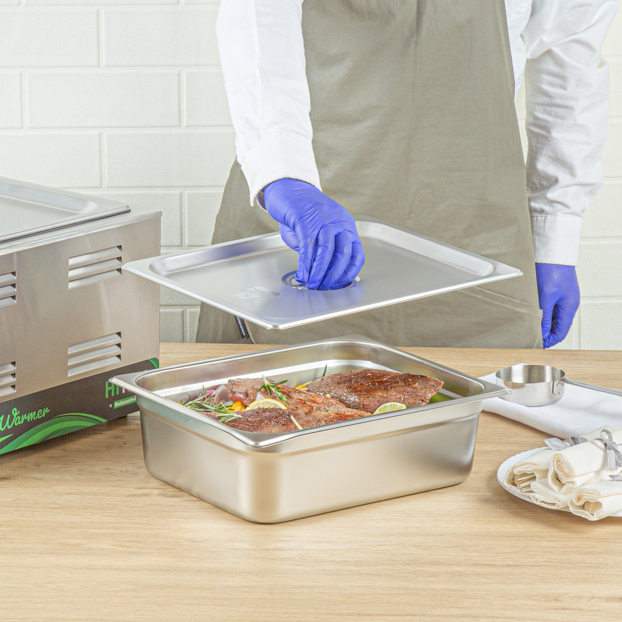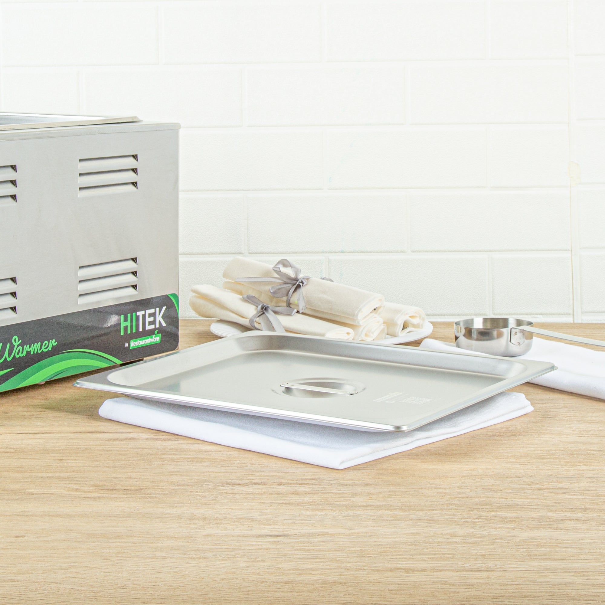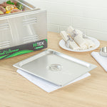 Enhance your kitchen efficiency with dependable cookware. The Kitchen Tek Heavy-Duty Hotel Pan Lid features heavy-duty 24 gauge stainless steel construction, ensuring it withstands frequent use in bustling foodservice environments. This stainless steel steam pan lid is designed with a flat handle that facilitates quick opening and closing, allowing for seamless transitions in fast-paced kitchens. Its polished silver exterior imparts an air of sophistication, elevating the presentation of your culinary creations and making it an ideal buffet pan lid for upscale catering events. Measuring 20.8 inches in length and 10.4 inches in width, this lid fits securely on compatible half size steam pans, ensuring optimal temperature retention. Its dishwasher-safe design simplifies cleanup, while freezer-safe properties offer versatile storage options. Invest in this reliable hotel pan lid to enhance your kitchen operations and elevate your dish presentations. Each order includes 12 Kitchen Tek Heavy-Duty Hotel Pan Lids.
