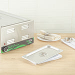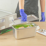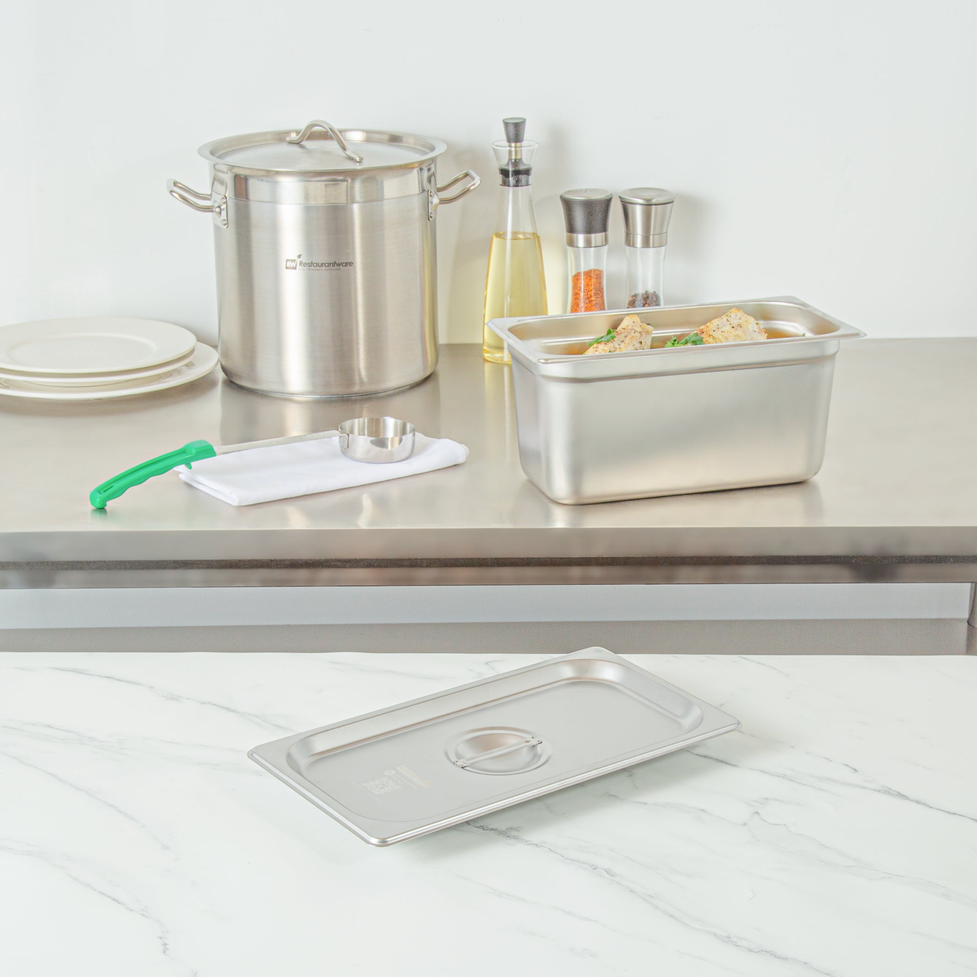 Enhance efficiency in your kitchen with this stainless steel pan cover. The Kitchen Tek Heavy-Duty Stainless Steel Pan Cover combines a robust 24 gauge stainless steel construction with a polished silver exterior, ensuring it withstands frequent use while maintaining a sophisticated look. This hotel pan lid features a flat, ergonomic handle, allowing chefs to seamlessly open and close pans, streamlining operations in busy commercial kitchens. The polished exterior not only enhances the presentation of your culinary creations but also ensures easy cleaning, as this steam table pan cover is both dishwasher and freezer safe. Measuring 12.8 inches in length and 6.9 inches in width, this durable cover is designed to fit standard 1/3 size pans, providing a reliable seal that helps maintain food temperature and flavor. Upgrade your foodservice equipment with this essential kitchen tool, and experience the reliability and style it offers. Each order includes 12 Kitchen Tek Heavy-Duty Stainless Steel Pan Covers.