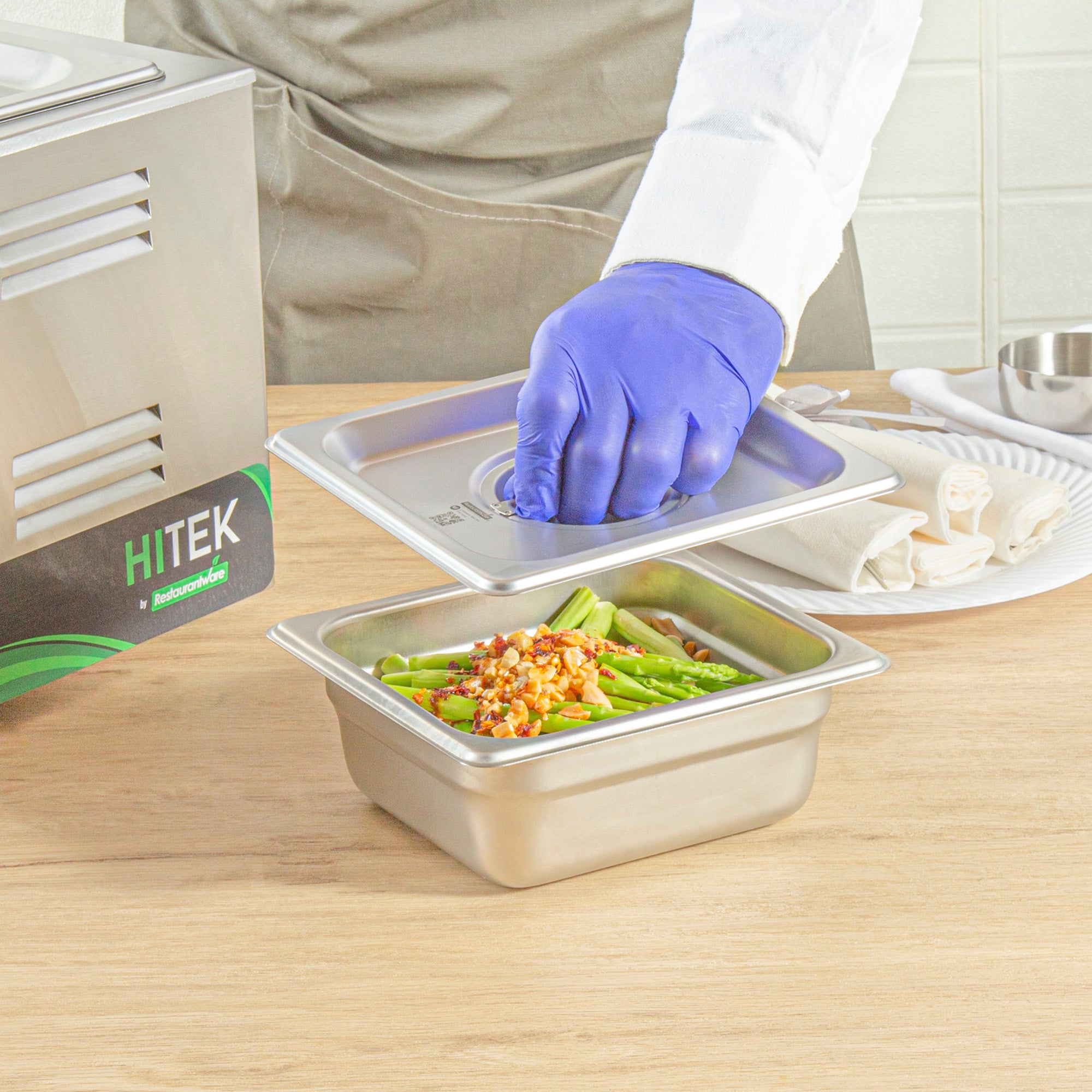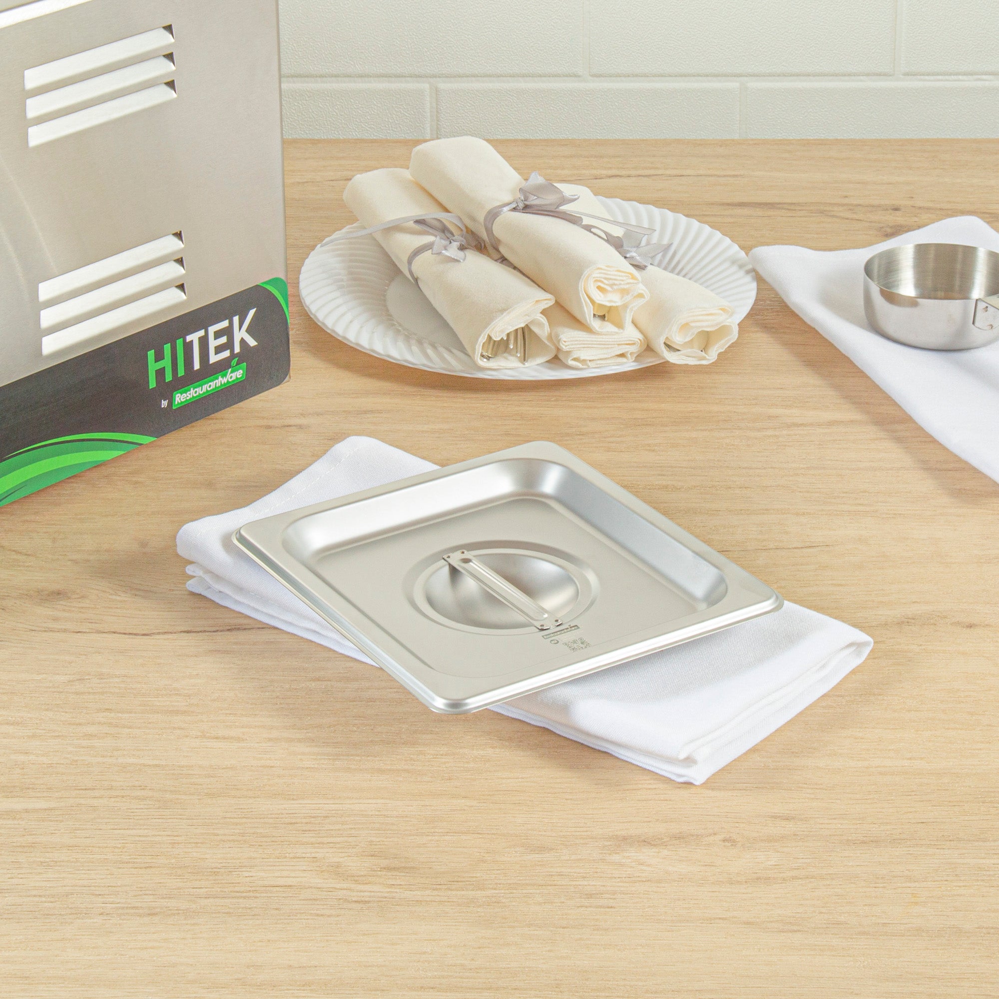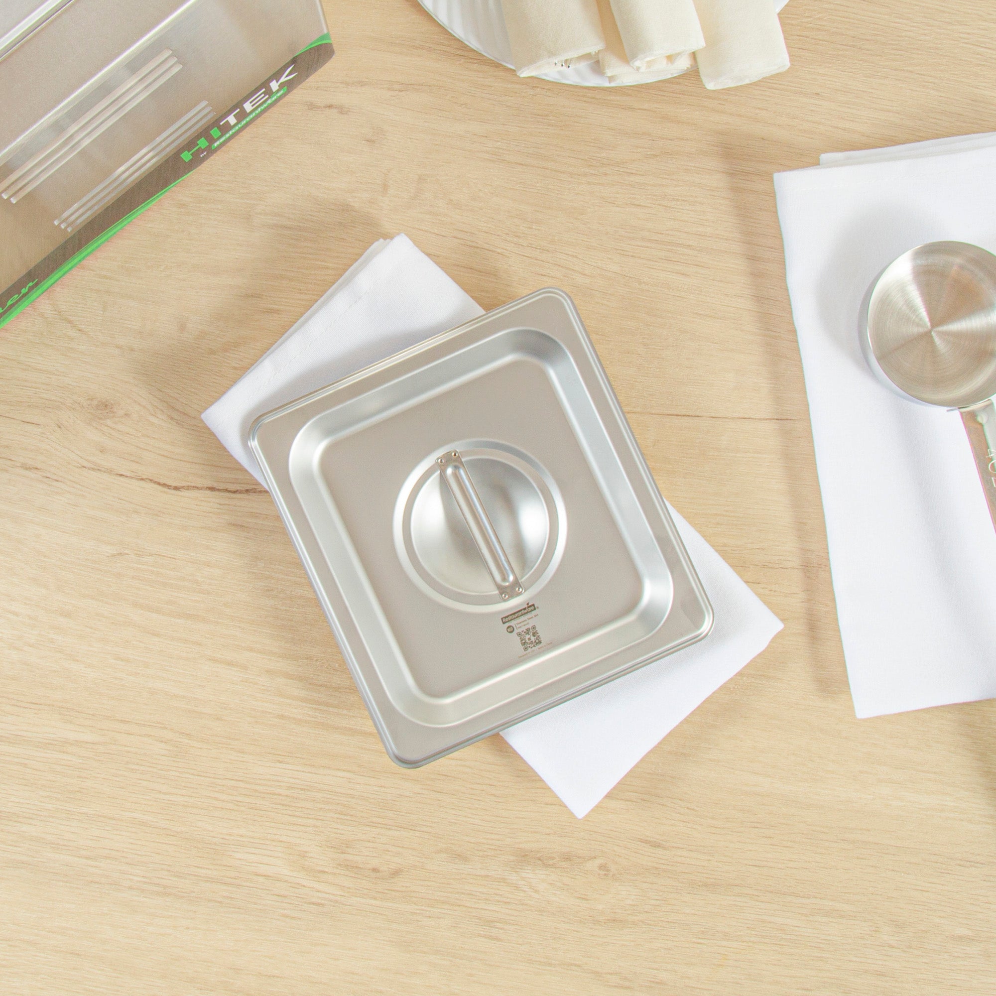 Ensure seamless kitchen operations with a reliable stainless steel pan cover. The Kitchen Tek Heavy-Duty Hotel Pan Lid features a robust 24 gauge stainless steel construction that withstands frequent, rigorous use, making it an essential tool for high-volume foodservice environments. Its flat handle design allows for effortless opening and closing, facilitating smooth transitions during busy service hours, while the polished exterior enhances the presentation of your culinary creations, elevating the visual appeal of any steam table setup. Measuring 6.9 inches in length and 6.4 inches in width, this hotel pan lid securely fits 1/6 size steam table pans to maintain optimal temperature and moisture levels, ensuring your dishes remain at their best. Dishwasher safe and freezer-safe, this versatile lid simplifies cleaning and storage, saving valuable time in fast-paced kitchens. Enhance your kitchen’s efficiency with this indispensable steam table pan cover. Each order includes 12 Kitchen Tek Heavy-Duty Hotel Pan Lid.