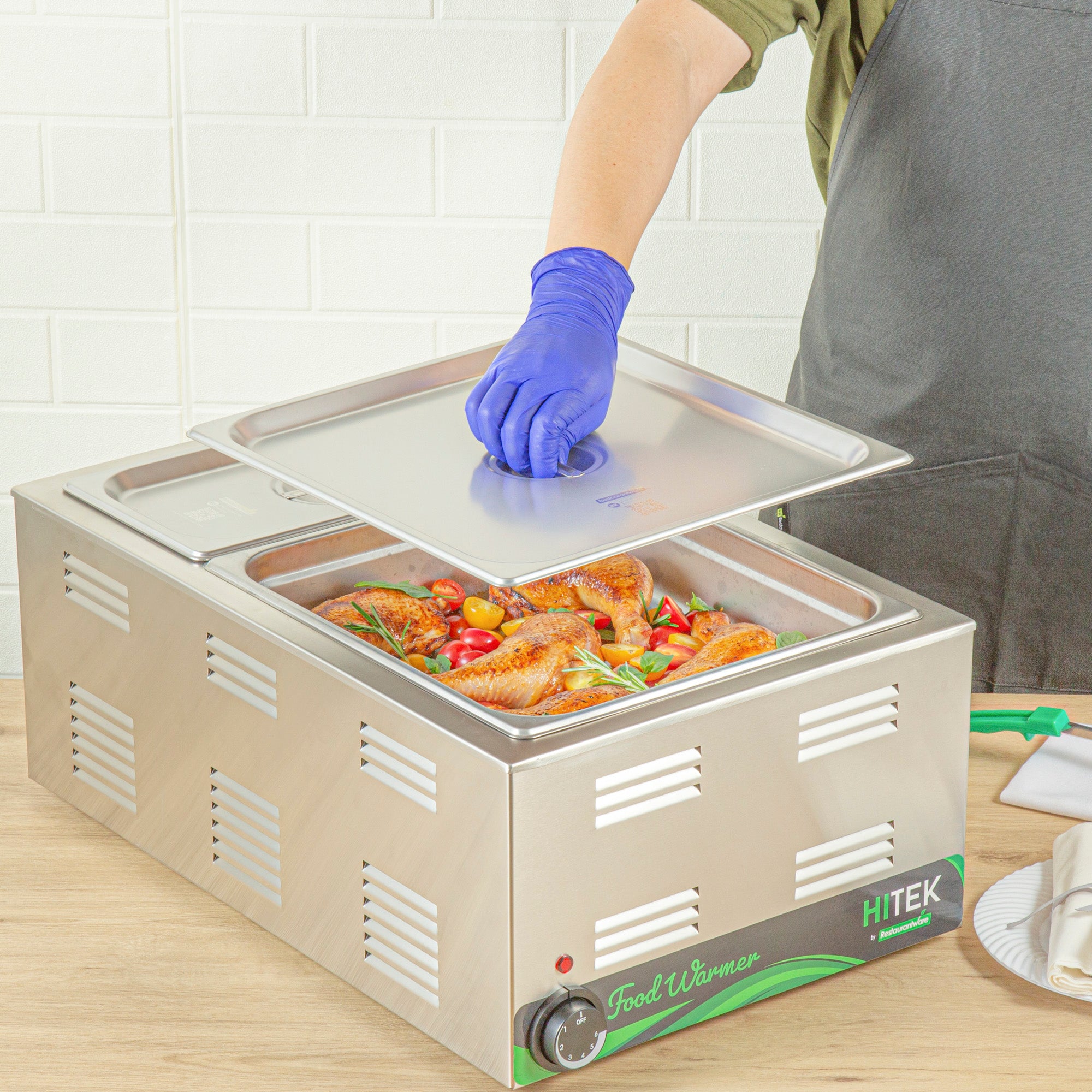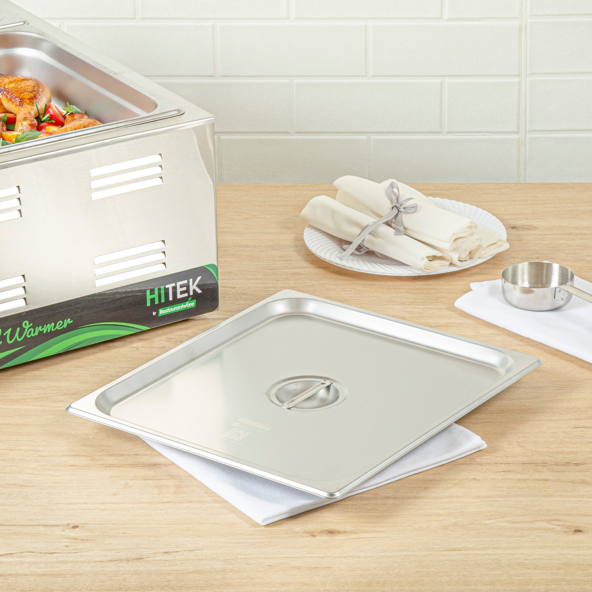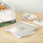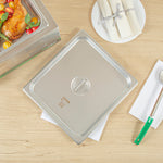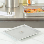 Enhance the efficiency of your kitchen operations with ease. The Kitchen Tek Heavy-Duty Hotel Pan Lid, crafted from heavy-duty 24 gauge stainless steel, withstands frequent use and ensures long-lasting performance, making it an essential hotel pan lid for bustling foodservice establishments. This stainless steel steam table pan cover features a flat handle, facilitating seamless opening and closing, which streamlines service and boosts operational efficiency. With its polished exterior, this durable steam table lid elevates the presentation of your culinary dishes, adding sophistication to any food display. Measuring 13.9 inches in length and 12.8 inches in width, this lid fits perfectly over standard 2/3 sized steam table pans, offering reliable coverage and temperature retention. Its freezer-safe and dishwasher-safe properties enhance convenience in busy kitchens. Experience the superior functionality and style of this product for streamlined service. Each order includes 12 Kitchen Tek Heavy-Duty Hotel Pan Lid.