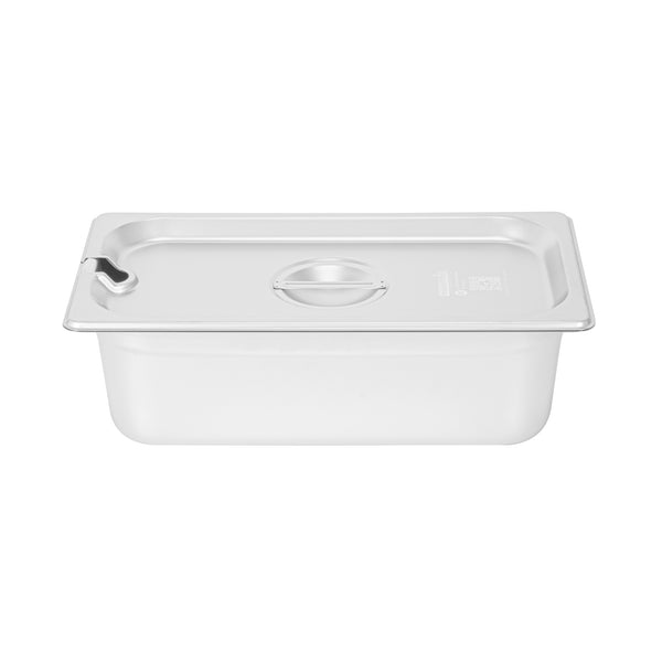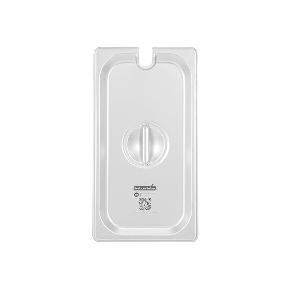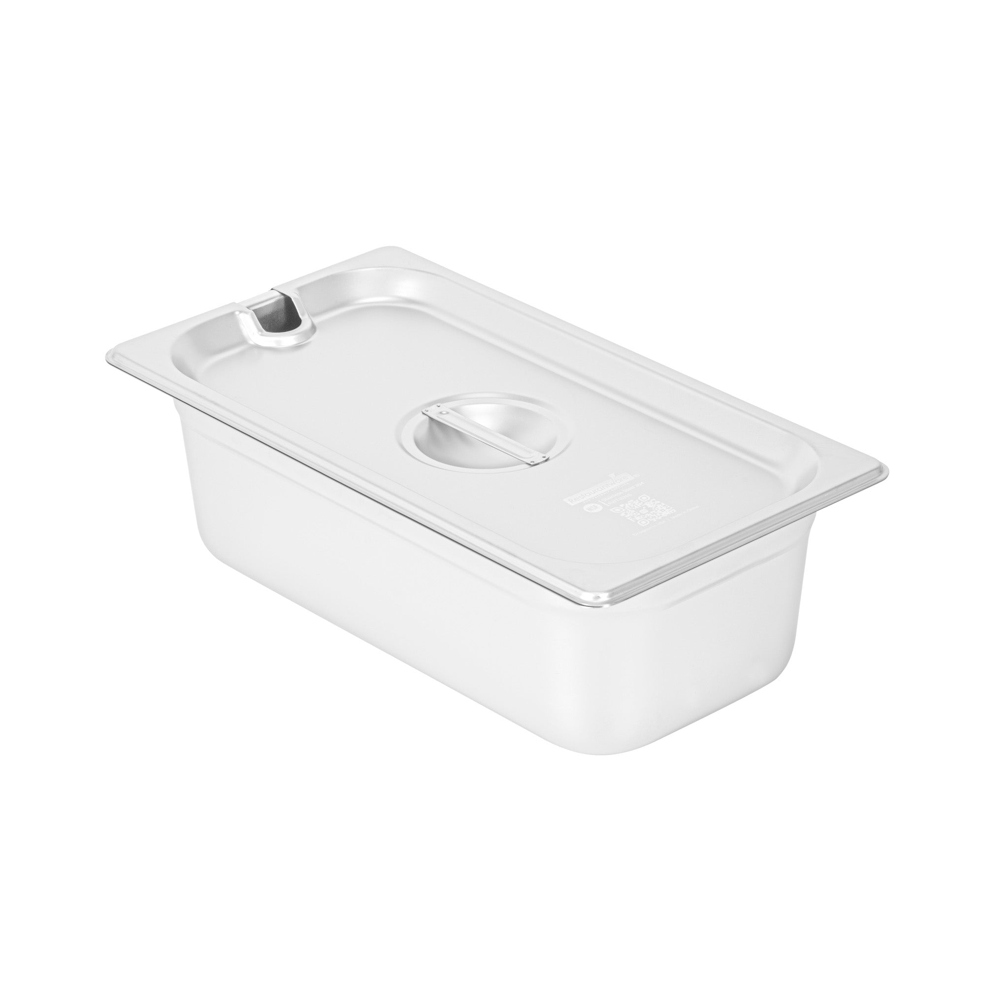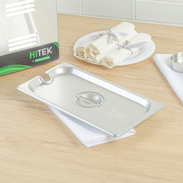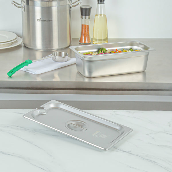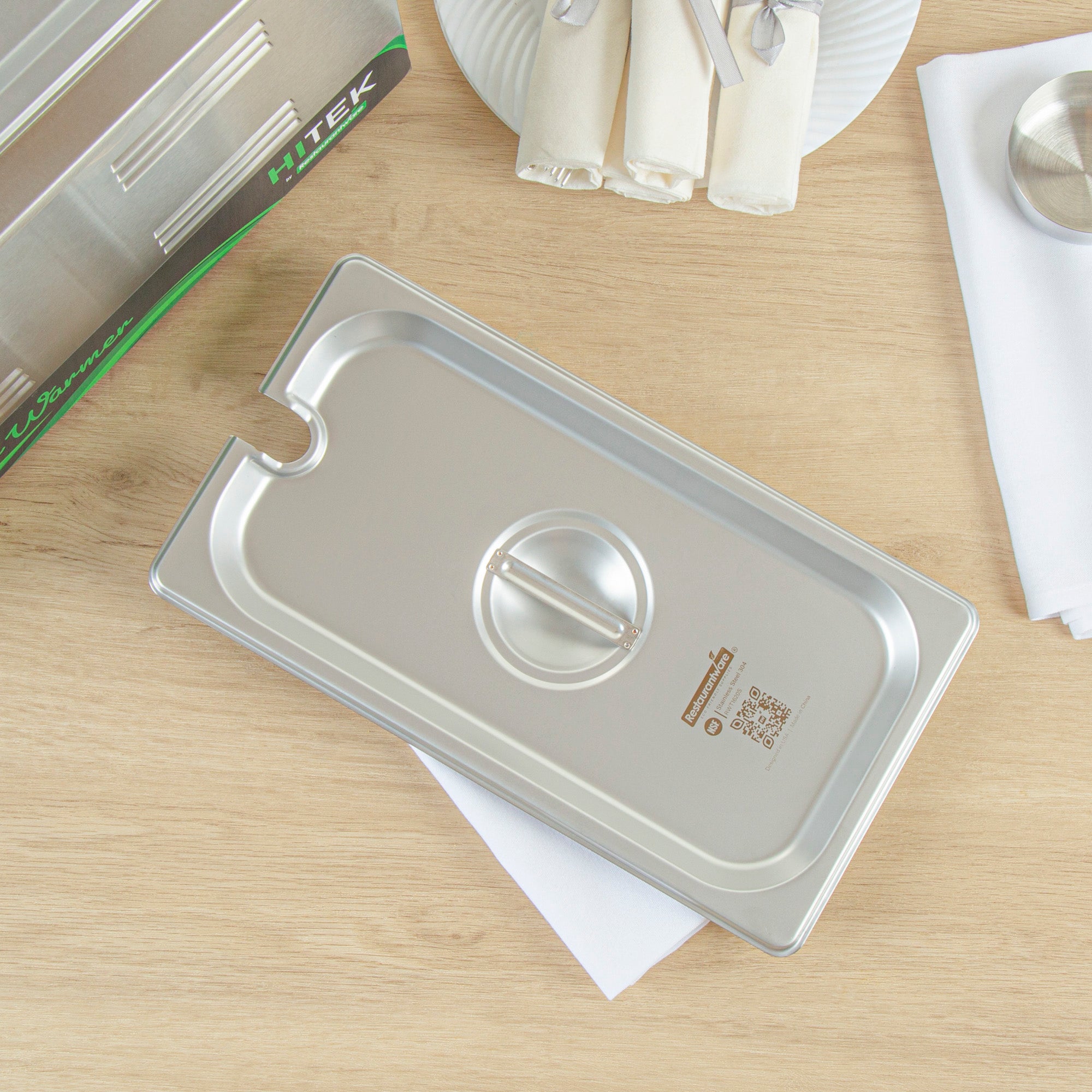 Enhance the functionality of your kitchen with our Kitchen Tek Stainless Steel Slotted Lid. Pair this metal lid with our collection of compatible Kitchen Tek 1/3 size steam table pans to elevate food preservation in your kitchen or buffet setup. Crafted from 24-gauge stainless steel, this lid for hotel pan ensures exceptional durability while effectively safeguarding your food. Featuring a flat, center handle, this lid ensures simple handling during use and provides ease of access in busy kitchen environments. The slotted design of this steam table lid allows convenient access for utensils without exposing the entire dish. Conforming to NSF standards, this pan lid meets commercial foodservice safety and health requirements. This chafer cover snugly fits and effectively traps heat, maintaining optimal food temperatures. Featuring a freezer-safe design, this steam pan lid offers versatility in food storage, providing convenient preservation solutions for your culinary needs. This catering pan lid is compatible with commercial dishwashers and facilitates easy and efficient cleanup. The polished exterior of this buffet pan lid adds sophistication, enhancing the presentation of your dishes. This stainless steel lid measures 12.8 inches in length by 6.9 inches in width. Sold in a 1 count box. Steam table pans are available and sold separately.