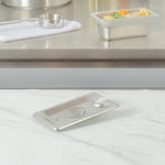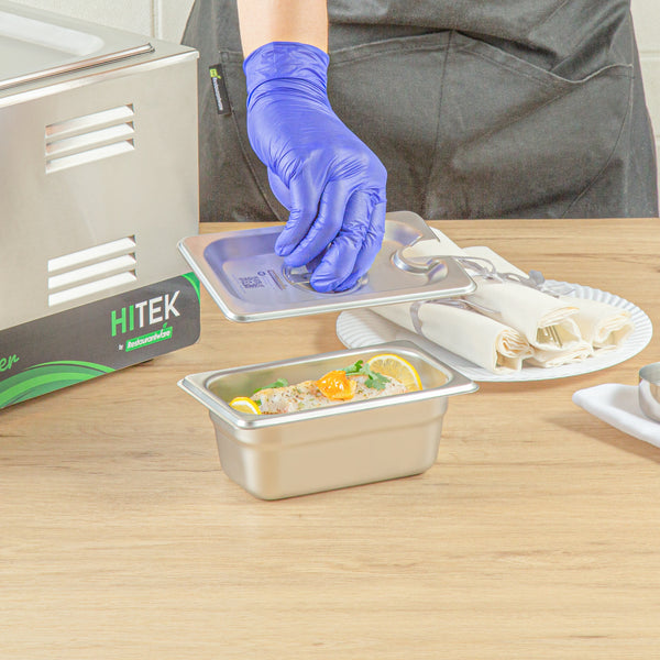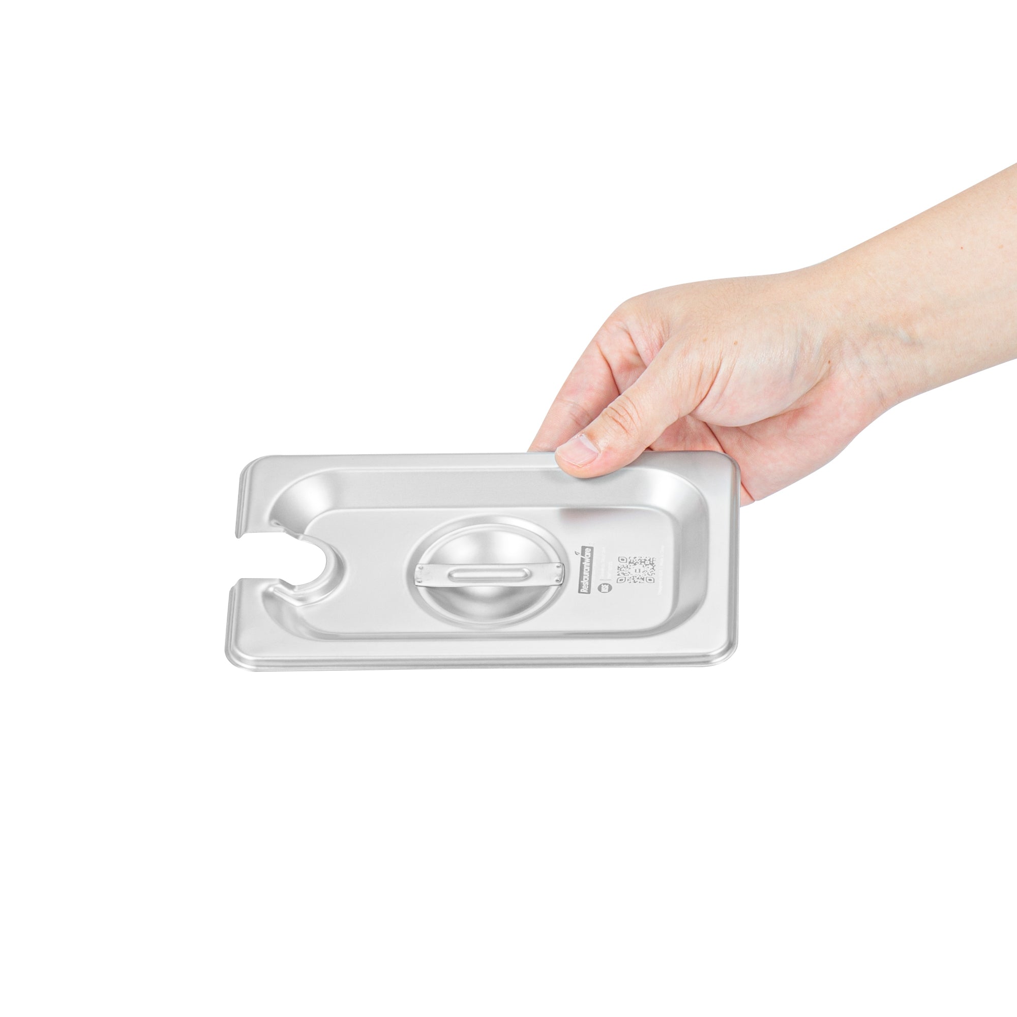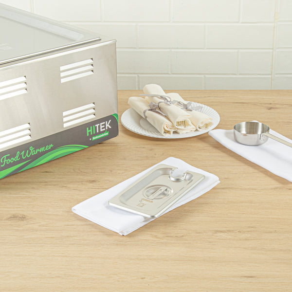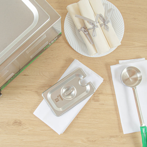 Revamp the aesthetics and hygiene of your kitchen with our Kitchen Tek Stainless Steel Slotted Lids. These lids are designed to fit with our compatible 1/9 size steam table pans (SKU: RWT1601S and RWT1601S) to protect your food. Made from 24 gauge stainless steel, these lids for hotel pans withstand frequent use at your foodservice establishment. With flat, center handles, these metal lids offer convenient access to your dishes, ensuring ease of use. The side slot on these steam table lids allows for easy insertion of serving utensils without exposing the contents. Compliant with NSF standards, these pan lids meet the health regulations mandated in the foodservice industry. These chafer covers snugly conform and proficiently retain heat, ensuring the preservation of optimal food temperatures. With their freezer-safe design, these steam pan lids offer versatility in food storage, presenting convenient preservation solutions for your culinary requirements. These catering pan lids are compatible with commercial dishwashers and streamline the cleanup process. The polished exterior of these buffet pan lids introduces sophistication, augmenting the presentation of your dishes. These stainless steel lids measure 6.9 inches in length by 4.3 inches in width. Sold in a 12 count box. Steam table pans are available and sold separately.