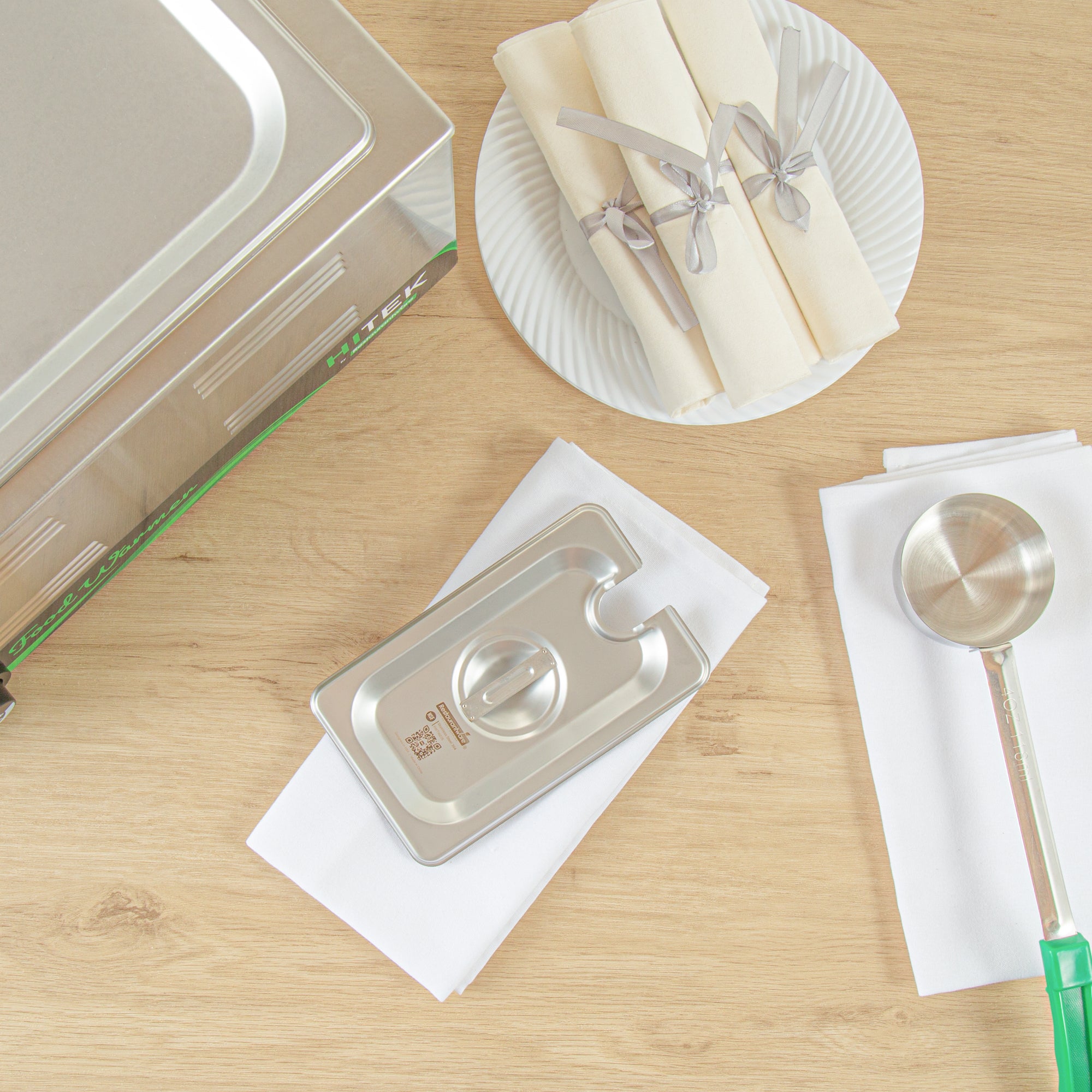 - Convenient open slot provides space to store serving ladle without exposing the pan’s contents