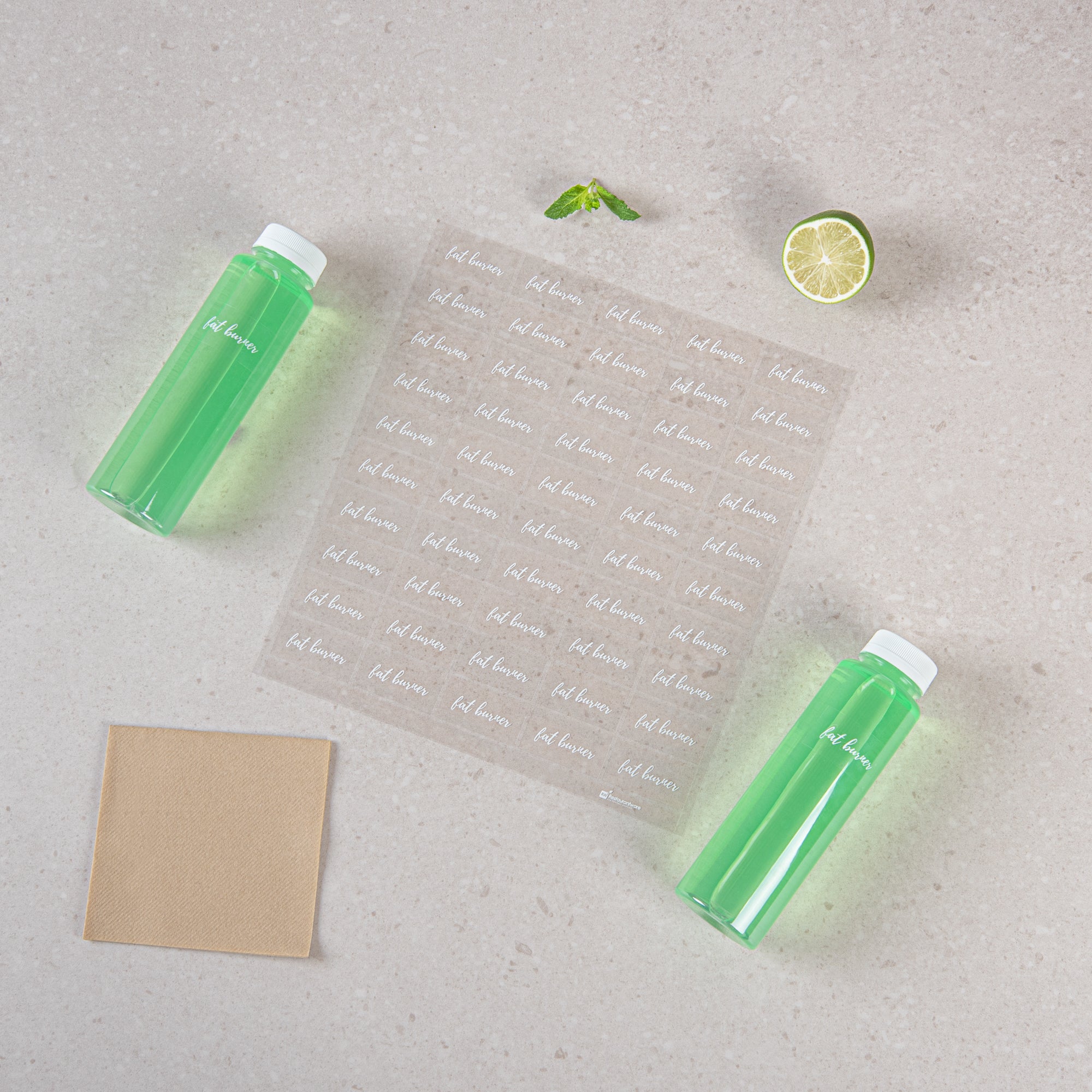 Use our Label Tek Plastic Fat Burner Labels to organize bottled juices stored in commercial refrigerators or grab-and-go cases. These juice bottle labels read "FAT BURNER" in a white cursive font, allowing customers to quickly locate fat burner juices without having to sort through other prepackaged beverages. Featuring a clear background, these fat burner labels create a seamless look on juice bottles and allow guests to appreciate the lively colors of grab-and-go juices. These juice stickers are water-resistant, ensuring that labels stay legible and don't peel off due to condensation. To prevent messy accidents when transporting cold-pressed juices, pair these clear drink labels with our tamper-evident juice bottles and drink pouches. These fat burner stickers are ideal for labeling fruit juices, vegetable drinks, juice shots, and other beverages designed to help your customers lose weight and burn fat. Measuring 2 inches long by 1 inch wide, these fat burner labels come in a sheet to streamline the labeling process at your juice bar, restaurant, or cafeteria. Sold in a 100 count box. Juice bottles and drink pouches are available and sold separately. Browse our collection of juice labels to find the perfect packaging solution for to-go beverages.