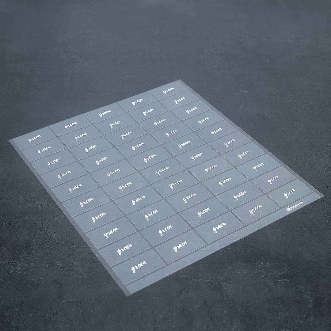 PLASTIC GREEN LABEL - CLEAR WITH WHITE FONT, WATER-RESISTANT