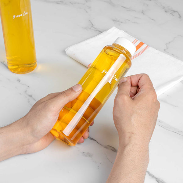 Effortlessly label beverages with our Label Tek Plastic Green Tea Labels. Perfect for placing onto bottled drinks, these drink stickers are water-resistant and expertly hold up against condensation to prevent labels from falling off bottles or containers. These trendy tea labels add a stylish touch to drink packaging and feature a clear background with a white cursive font that reads "green tea" so customers can quickly grab their preferred beverage. Ideal for a secure seal onto surfaces, these transparent labels feature a sticky and strong adhesive. Coordinate these beverage labels with our collection of tamper-evident juice bottles and drink pouches to securely package green tea for take out or delivery services. These drink stickers arrive in a sheet to streamline your employee's packaging process. These tea labels measure 2 inches in length and 1 inch in width. Sold in a 100 count box. Browse our selection of water-resistant labels to find the perfect packaging solution for your take out orders.