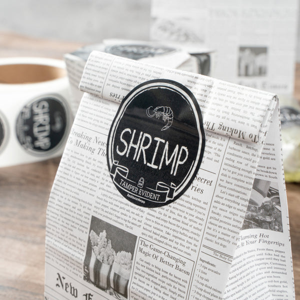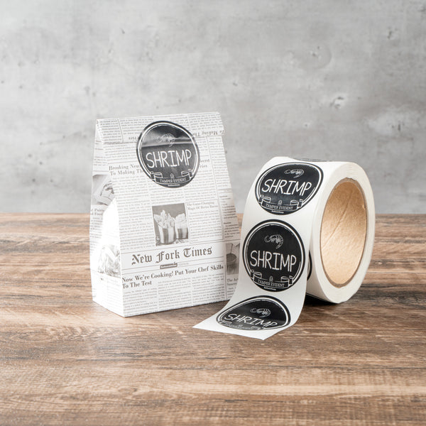 Protect your packaged shrimp scampi with our Label Tek Plastic Shrimp Labels. These tamper-evident labels are great for safely packaging meals as they leave behind a "VOID" message to indicate that a container has been opened or tampered with. Perfect for labeling delivery or on-the-go shrimp meals, these anti-tamper stickers have a strong adhesive to securely seal your packaging containers and prevent spills. Featuring a shrimp image and a "SHRIMP" message, these void labels allow customers to easily identify meals to eliminate the need for customers to shuffle through take out boxes and lessen contact. With a chalkboard inspired design, these shrimp labels help you create a cohesive and consistent brand image. The black background and white font of these adhesive security labels seamlessly blend with your packaging's color scheme. To easily label take out boxes, these food delivery labels come in a roll to increase order accuracy and prevent mixing up customers' meals at your restaurant. Each of these tamper-resistant seals measures 2 inches in diameter. Sold in a 500 count box. Browse our selection of tamper-evident labels to find the perfect packaging solution for your take out orders.