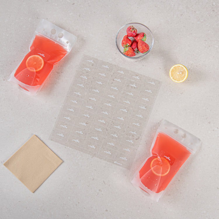 Label bottles of vodka for grab-and-go services using our Label Tek Plastic Vodka Labels. Reading "VODKA" in a white cursive font, these vodka labels allow patrons to quickly identify to-go vodkas in refrigerator cases which helps prevent them from making contact with other bottled beverages. These vodka stickers have a clear background that creates a unique and seamless look on juice bottles, eliminating the need for customized drink labels. Built to hold up to condensation, these water-resistant labels can be used to label chilled vodkas or cocktails with vodka without peeling off. Provide customers with a mess-free way to take vodka on the go by pairing these vodka bottle labels with our tamper-evident juice bottles and drink pouches. These vodka bottle stickers come in a sheet, offering employees a hassle-free way to label prepackaged vodkas at your bar, restaurant, or catered event. Each vodka label measures 2 inches long by 1 inch wide. Sold in a 100 count box. Juice bottles and drink pouches are available and sold separately. Browse our selection of water-resistant drink labels to organize bottled beverages and increase order accuracy.