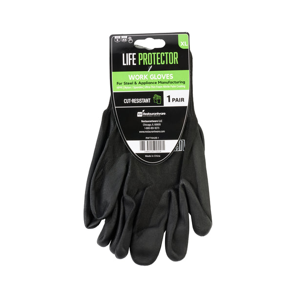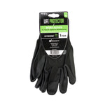 Provide heavy-duty protection while working with our Life Protector Black HPPE Nylon / Spandex Extra Large Work Gloves. These work gloves feature an ultra-thin foam nitrile coating that resists abrasions and tears, ensuring long-lasting use. Suitable for working in various conditions, these hand gloves provide exceptional grip on both dry and wet surfaces. Equipped with HPPE fibers, these protective gloves are cut-resistant and keep your hands safe from sharp edges and blades, making them perfect for steel and appliance manufacturing. With a lining crafted from a blend of nylon and spandex, these black gloves provide a comfortable fit, enhancing hand movement during extended wear. With a 15-gauge thickness, these hand gloves deliver an added layer of protection in tough working conditions. Conveniently hand washable, these mechanic gloves are easy to maintain for long-term use. Designed for a sleek, professional look, these black hand gloves hide dirt and stains, maintaining a clean appearance. Measuring 10.25 inches in length by 4.25 inches in width, these heavy-duty gloves are built for both performance and style. Each order includes 10 pairs of extra large work gloves.