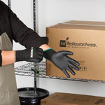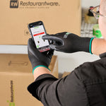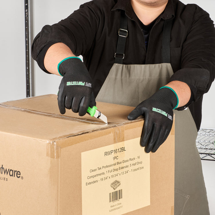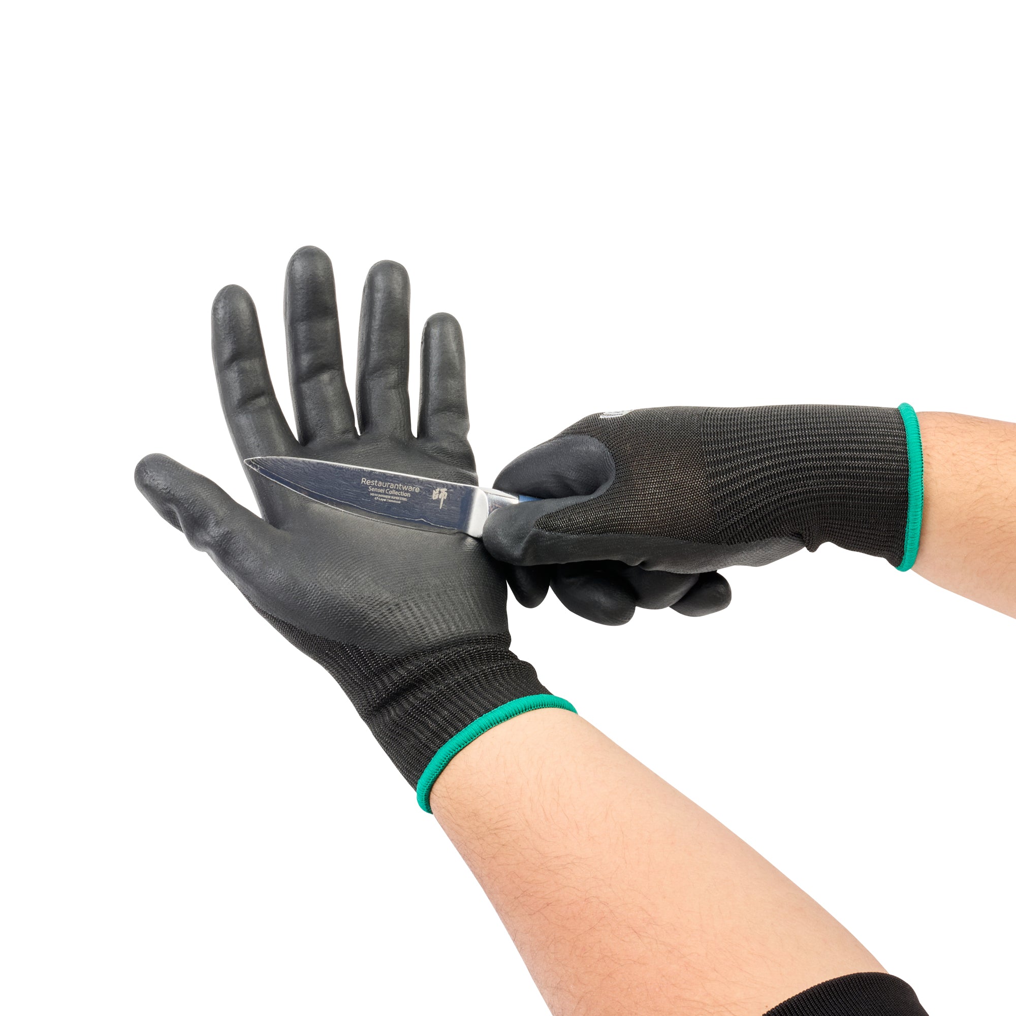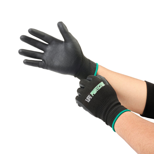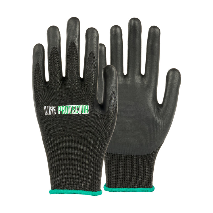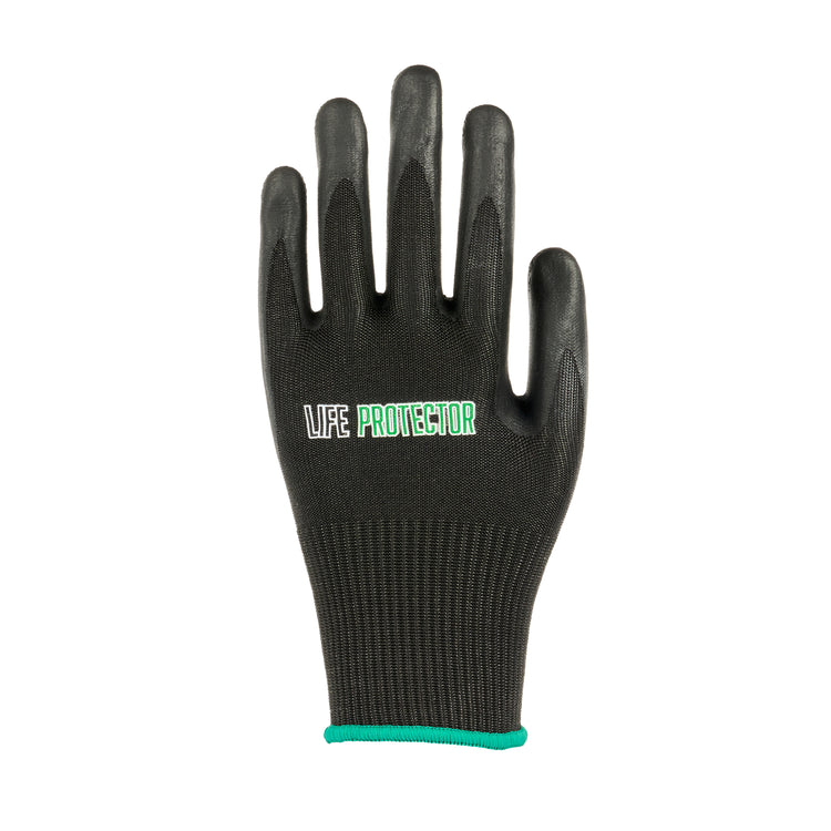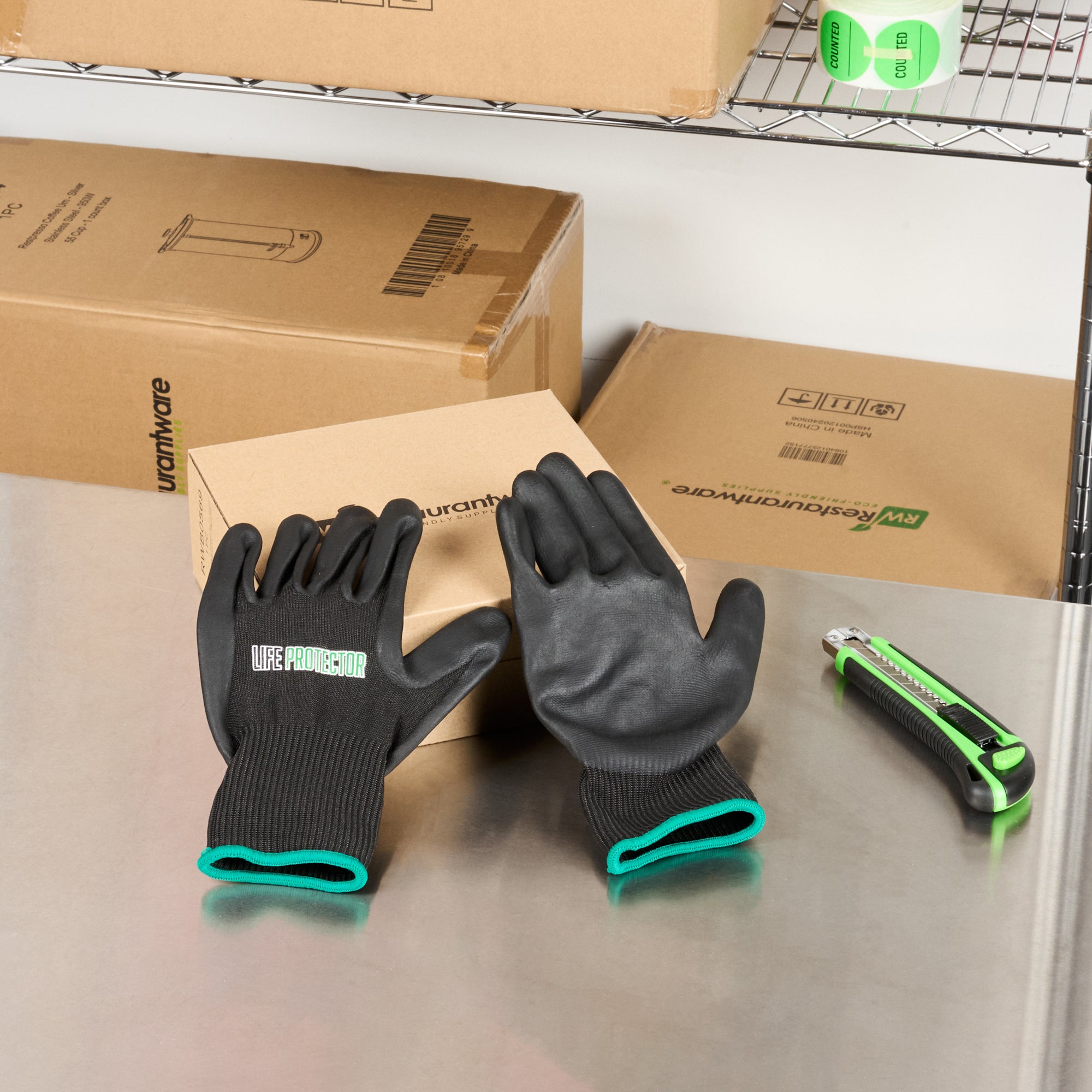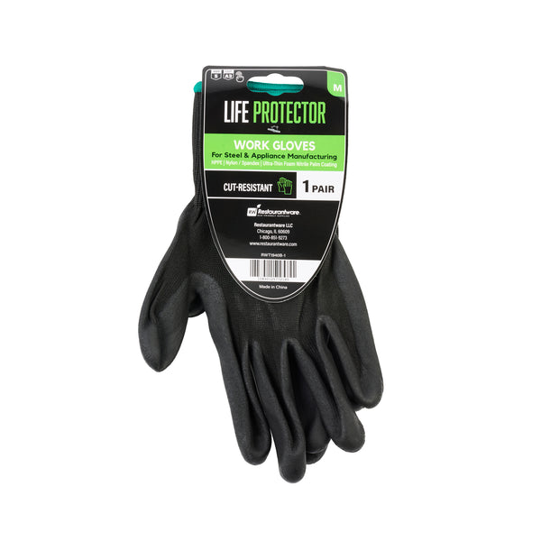 Ensure maximum comfort with our Life Protector Black HPPE Nylon / Spandex Medium Work Gloves. These heavy-duty gloves feature an ultra-thin foam nitrile coating resistant to abrasions and tears for long-lasting use. To ensure you maintain control in various work conditions, these hand gloves offer excellent grip on both dry and wet surfaces. Crafted with HPPE fibers, these protective gloves are cut-resistant and safeguard your hands from sharp edges and blades, making them perfect for safely handling steel and appliance manufacturing. The lining of these black work gloves is made from a blend of nylon and spandex, providing a comfortable fit for improved hand movement during extended wear. Designed with a 15-gauge thickness, these black hand gloves offer an added layer of protection while working in tough conditions. These mechanic gloves are hand washable for effortless upkeep and maintenance. With a sleek black finish, these black gloves present a professional look while effectively hiding dirt and stains. Measuring 9.5 inches in length by 3.75 inches in width, these work gloves fit comfortably for various tasks. Each order includes 10 pairs of medium work gloves.