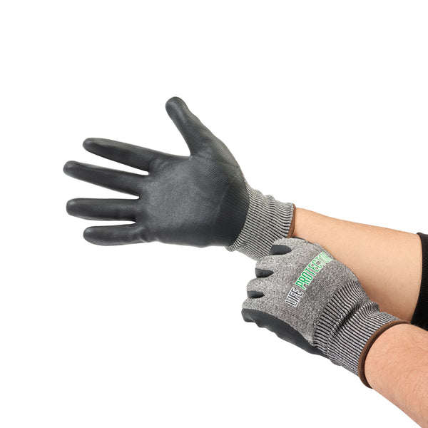 Equip your hands with our Life Protector Gray HPPE Polyester / Spandex Large Work Gloves. Featuring an ultra-thin foam nitrile palm coating, these heavy-duty gloves are resistant to abrasions and ensure a superior grip on both dry and wet surfaces. The breathable foam technology of these gray work gloves keeps your hands cool and dry throughout the day, making them ideal for long hours of use. Crafted from HPPE fibers, these heavy-duty work gloves are cut-resistant and provide protection against sharp edges and blades. The lining of these mechanic gloves is made from a blend of polyester and spandex, allowing for improved hand movement during extended wear. With a 15-gauge thickness, these protective gloves add an extra layer of defense in tough working conditions. These gray mechanic gloves are hand washable for easy upkeep, offering a hassle-free cleaning experience. The sleek, gray finish of these work gloves gives a professional look while effectively hiding dirt and stains. Measuring 9.75 inches in length by 4 inches in width, these gray gloves are designed for a perfect fit. Each order includes 1 pair of large work gloves.