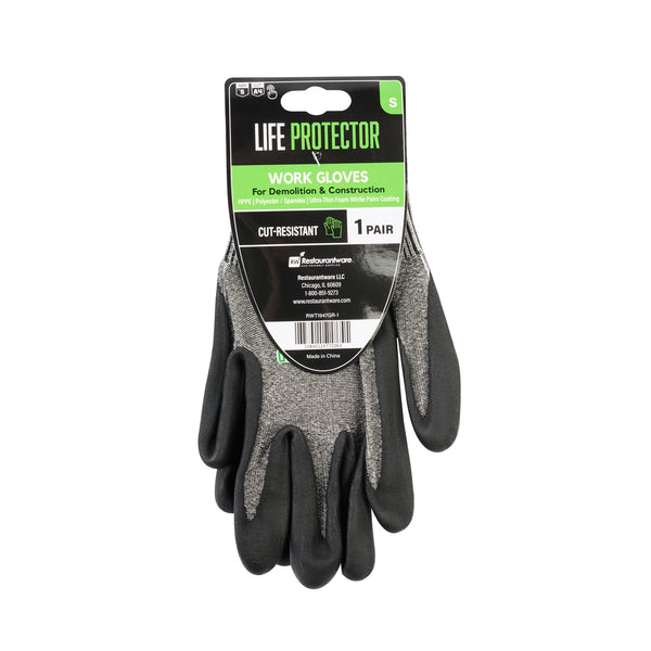 Protect your hands in any work environment with our Life Protector Gray HPPE Polyester / Spandex Small Work Gloves. The ultra-thin foam nitrile coating on these heavy-duty gloves resists abrasions and tears while ensuring superior grip on both dry and wet surfaces. These protective gloves feature a breathable foam design, keeping your hands cool and dry throughout the day. The HPPE fibers of these gray work gloves make them cut-resistant and ideal for handling sharp edges and blades. With a lining made from a blend of polyester and spandex, these mechanic gloves provide a comfortable fit, improving hand movement during extended wear. Boasting a 15-gauge thickness, these heavy-duty gray gloves add an extra layer of protection, perfectly suited for tough working conditions. These gray gloves are hand washable, making upkeep and maintenance a breeze. The gray finish gives these work gloves a sleek, professional look that effectively hides dirt and stains. Measuring 9 inches in length by 3.5 inches in width, these small work gloves fit perfectly for detailed work. Each order includes 10 pairs of small work gloves.