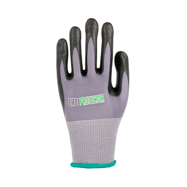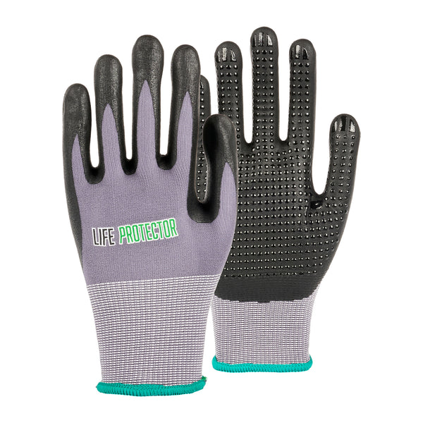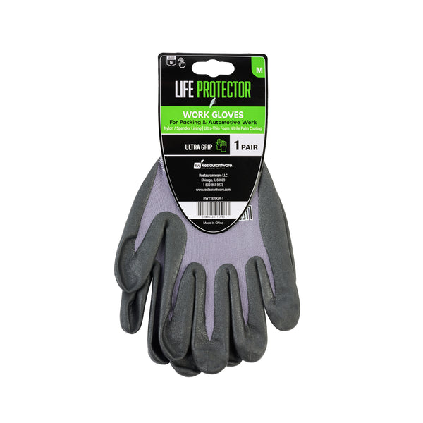Equip your team with our Life Protector Gray Nylon / Spandex Medium Work Gloves. These work gloves feature a dotted palm that provides an enhanced grip, making it easier to handle tools and objects securely on slippery surfaces like oil or water. For precise handling and dexterity, the ultra-thin foam nitrile coating on these heavy-duty gloves is perfect for managing small or delicate objects. Designed with foam technology, these protective gloves are breathable to keep hands cool and prevent sweating. With a snug and comfortable fit, the lining made from a blend of nylon and spandex of these gray gloves improves dexterity for intricate tasks. Engineered with 15-gauge thickness, these mechanic gloves provide an added layer of protection in tough working conditions. Ideal for automotive work, these premium work gloves are suitable for mechanical repairs, workshop tasks, and heavy-duty jobs. These gray work gloves are hand washable for simple upkeep and maintenance. For a sleek, professional look, the gray finish of these hand gloves hides dirt and stains efficiently. These gray hand gloves measure 9.5 inches in length by 4.25 inches in width. Each order includes 1 pair of medium work gloves.