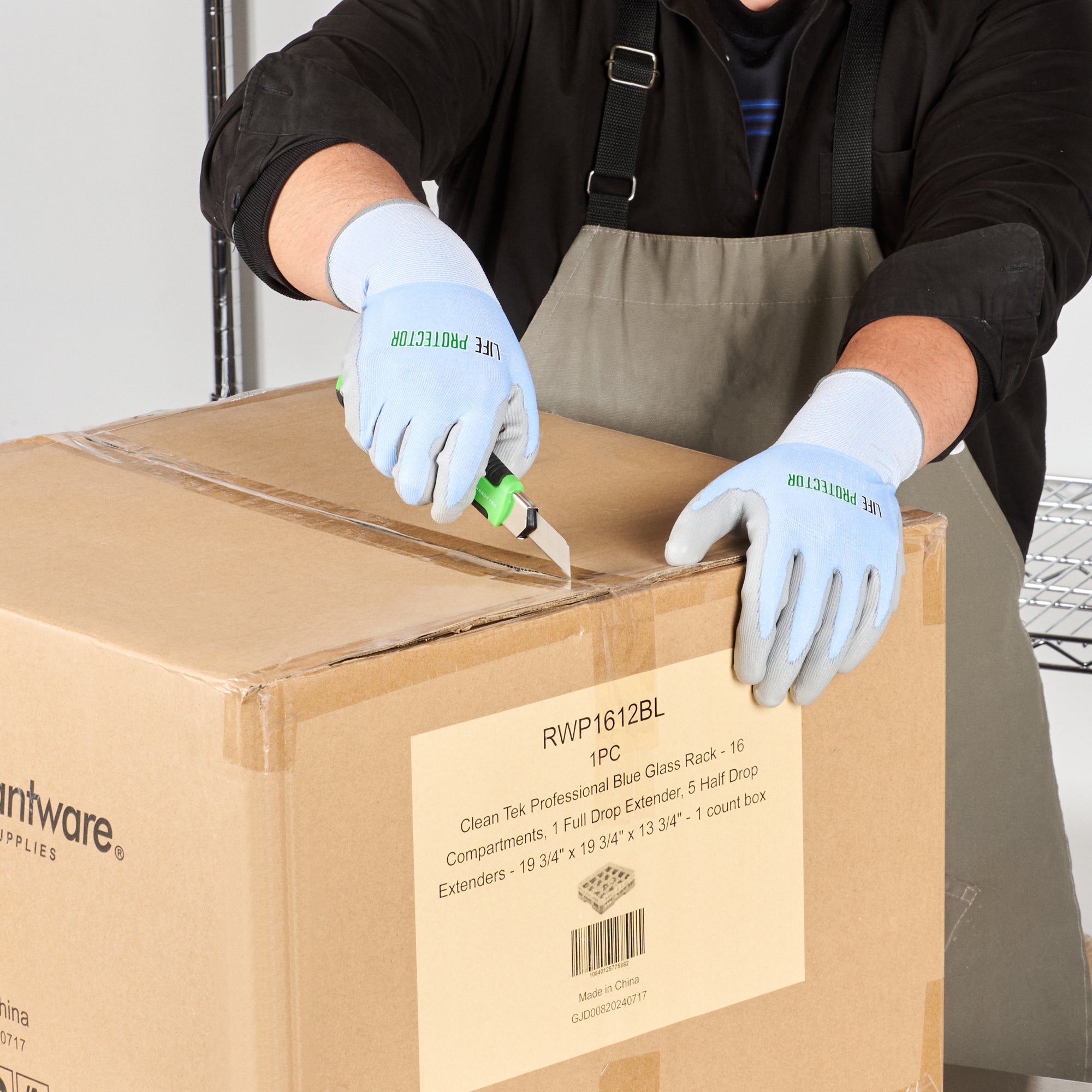 Equip your team with our Life Protector Light Blue Diamond Blend Extra Large Work Gloves. These protective gloves feature a durable foam polyurethane coating that shields hands from chemicals and corrosive substances, ensuring a safer working environment. Designed with a breathable foam design, these blue gloves keep hands cool and dry throughout long shifts. With diamond blend technology, these hand gloves are cut-resistant and offer superior protection for handling sharp objects. The 18-gauge thickness of these mechanic gloves offers exceptional protection against cuts and abrasions, ideal for rigorous work conditions in manufacturing and construction. For easy upkeep and maintenance, these heavy-duty gloves are hand washable. The light blue finish gives these work gloves a sleek, neat look that enhances any professional setting. Measuring 10.25 inches in length by 4.25 inches in width, these extra large work gloves provide ample coverage and comfort. Each order includes 10 pairs of extra large work gloves.