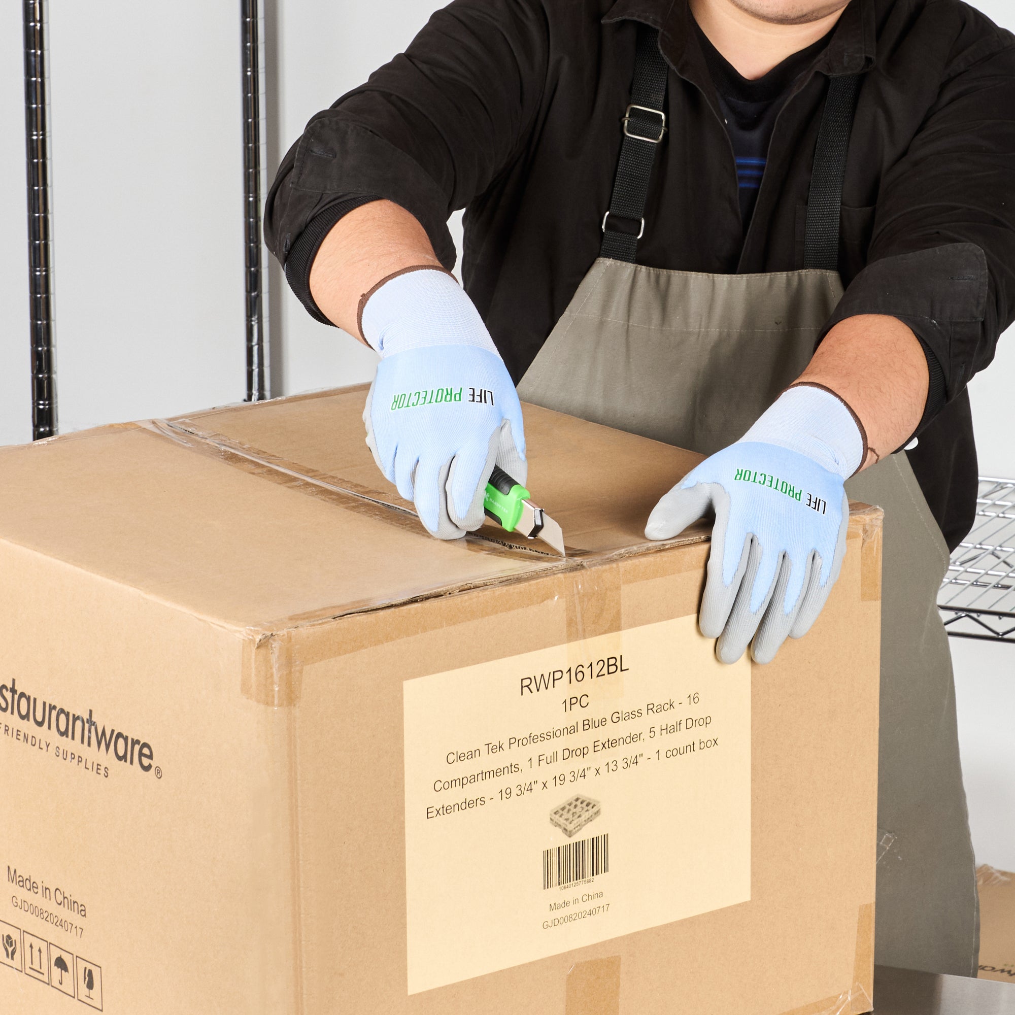 Elevate your workwear standards with our Life Protector Light Blue Diamond Blend Large Work Gloves. These heavy-duty gloves feature a polyurethane coating that shields your hands from chemicals and corrosive substances, ensuring a safer working environment. Perfect for long shifts, these blue gloves come with a breathable foam design that keeps your hands cool and dry throughout the day. With a diamond blend technology, these protective gloves are cut-resistant, making them ideal for handling sharp objects. Designed with an 18-gauge thickness, these hand gloves provide excellent protection against abrasions, making them suitable for tough industrial and construction jobs. These mechanic gloves are hand washable for easy upkeep and maintenance. The sleek light blue finish of these heavy-duty work gloves ensures a neat and professional appearance. Measuring 9.75 inches in length by 4 inches in width, these work gloves are designed to fit comfortably and securely. Each order includes 10 pairs of large work gloves.