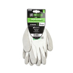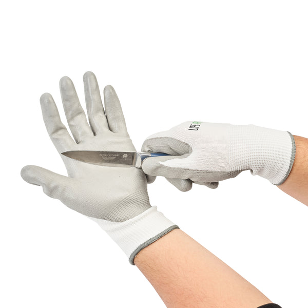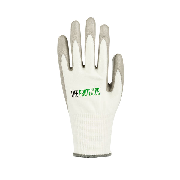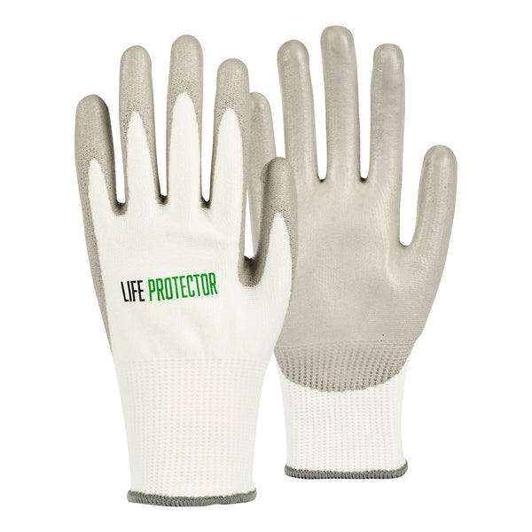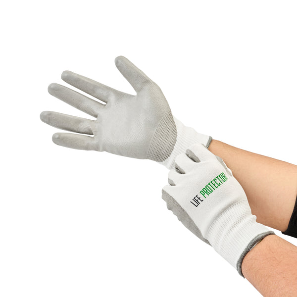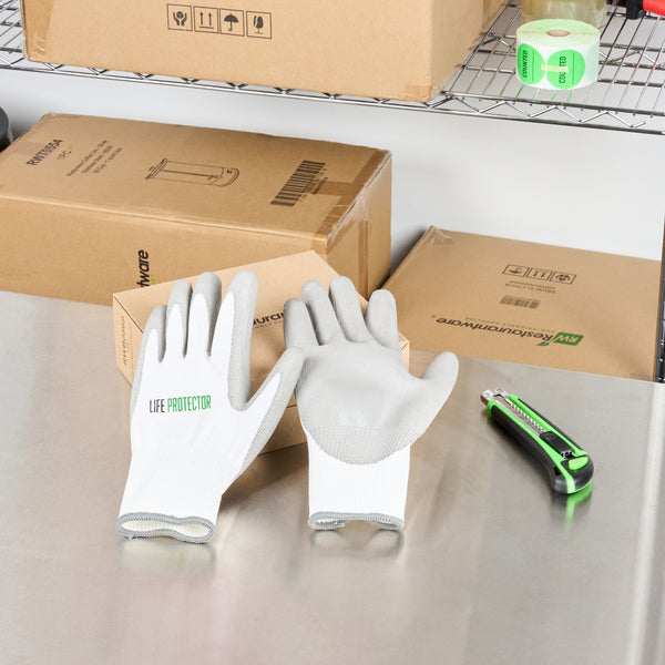 Complete your work equipment with our Life Protector White HPPE Polyester / Spandex Extra Large Work Gloves. Featuring a polyurethane palm coating, these protective gloves are abrasive-resistant, shielding your skin against scrapes and punctures in demanding environments. The HPPE fibers integrated into these heavy-duty gloves are cut-resistant and provide superior protection from sharp edges and blades, enhancing workplace safety. With a blend of polyester and spandex lining, these mechanic gloves offer a snug and comfortable fit, facilitating improved hand movement during extended wear. Designed with a 13-gauge thickness, these white gloves offer an added layer of protection, ideal for tough working conditions. These heavy-duty work gloves are specifically crafted to enhance performance in tasks like box cutting and strapping. The sleek white finish of these working gloves provides a neat and professional appearance. These work gloves are hand washable, making upkeep and maintenance easy. Measuring 10.25 inches in length by 4.25 inches in width, these extra-large gloves fit perfectly for a wide range of tasks. Each order includes 10 pairs of extra large work gloves.
