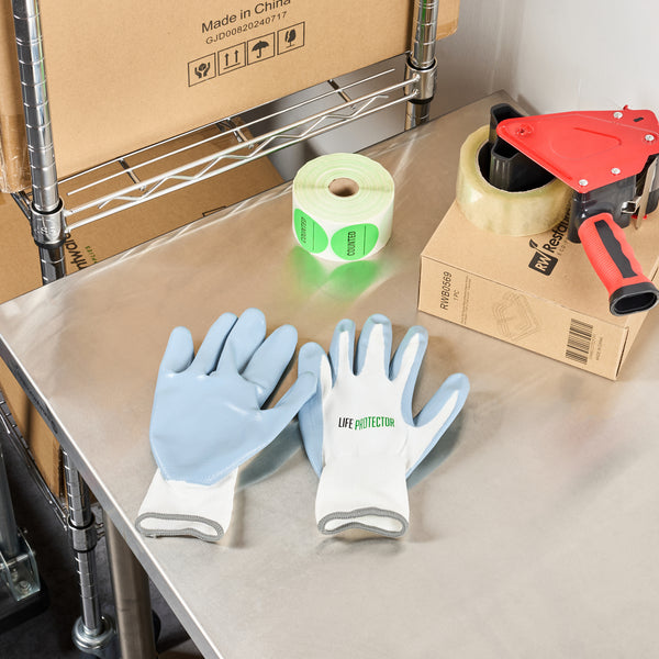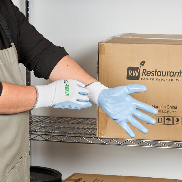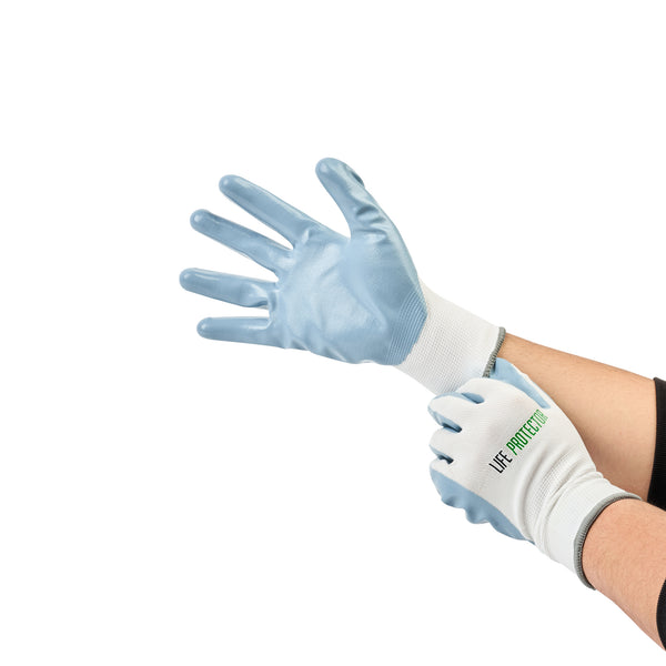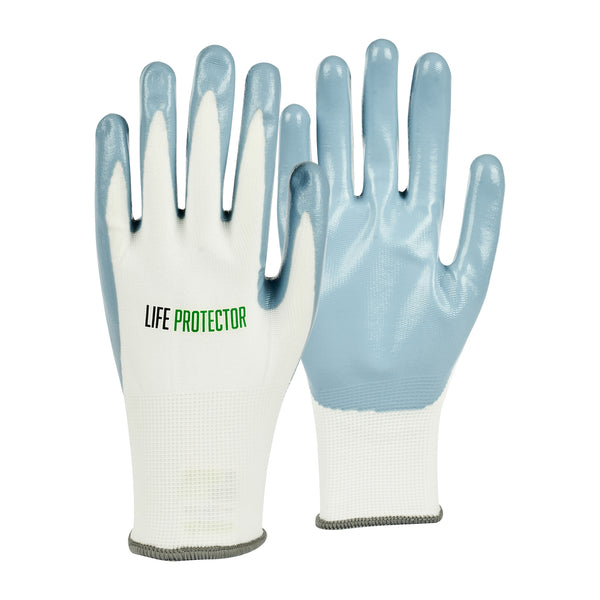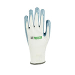 Enhance your work environment with our Life Protector White Nylon Extra Large Work Gloves. These heavy-duty gloves feature a flat nitrile palm coating that is resistant to abrasions and tears. To maintain control in various work environments, these extra large hand gloves provide a superior grip on both dry and wet surfaces. The breathable nylon lining of these protective gloves keeps your hands cool and comfortable during long hours of wear. With a 13-gauge thickness, these hand gloves add an extra layer of protection for tackling tough tasks. Ideal for handling small parts, these mechanic gloves offer fine grip and dexterity, perfect for detailed assembly and repair work. These white gloves are hand washable, making upkeep and maintenance a breeze. Featuring a crisp, white color, these work gloves makes your appearance neat and professional. Measuring 10.25 inches in length by 4.5 inches in width, these white work gloves are designed for optimal performance in various work conditions. Each order includes 1 pair of extra large work gloves.